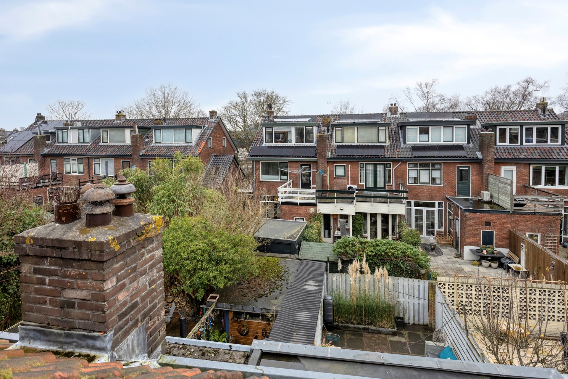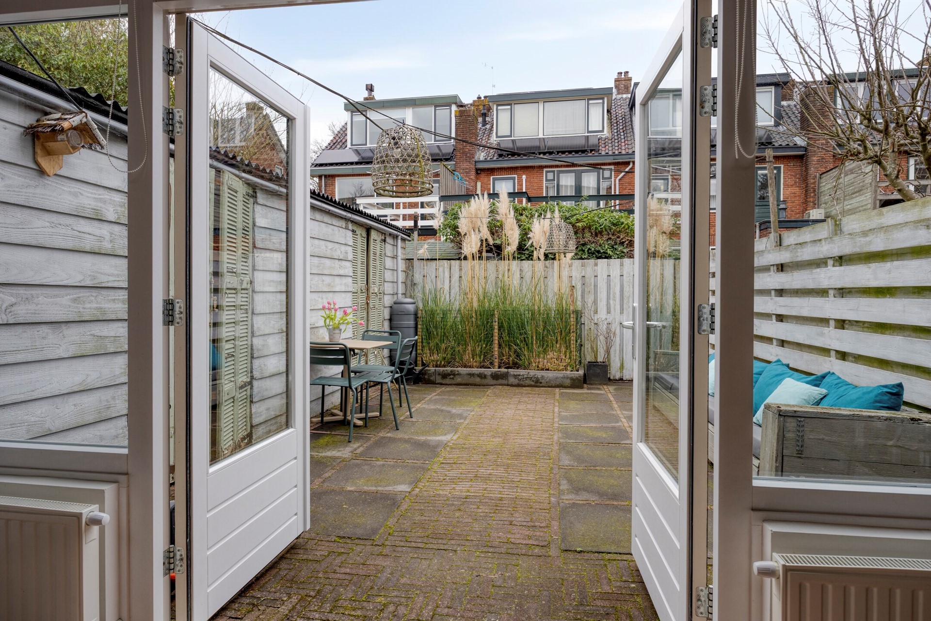 Via de openslaande deuren stap je zo de zonnige achtertuin in, gelegen op het noordwesten. Circa 30 m², met achterom en een schuur voorzien van elektra. Een fijne plek om lang buiten te zitten met zon in de namiddag en de avond. Op naar de eerste etage.