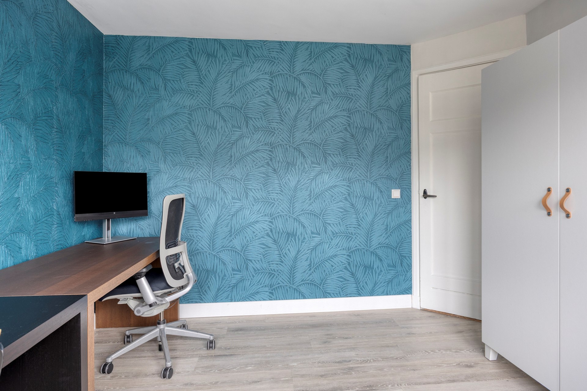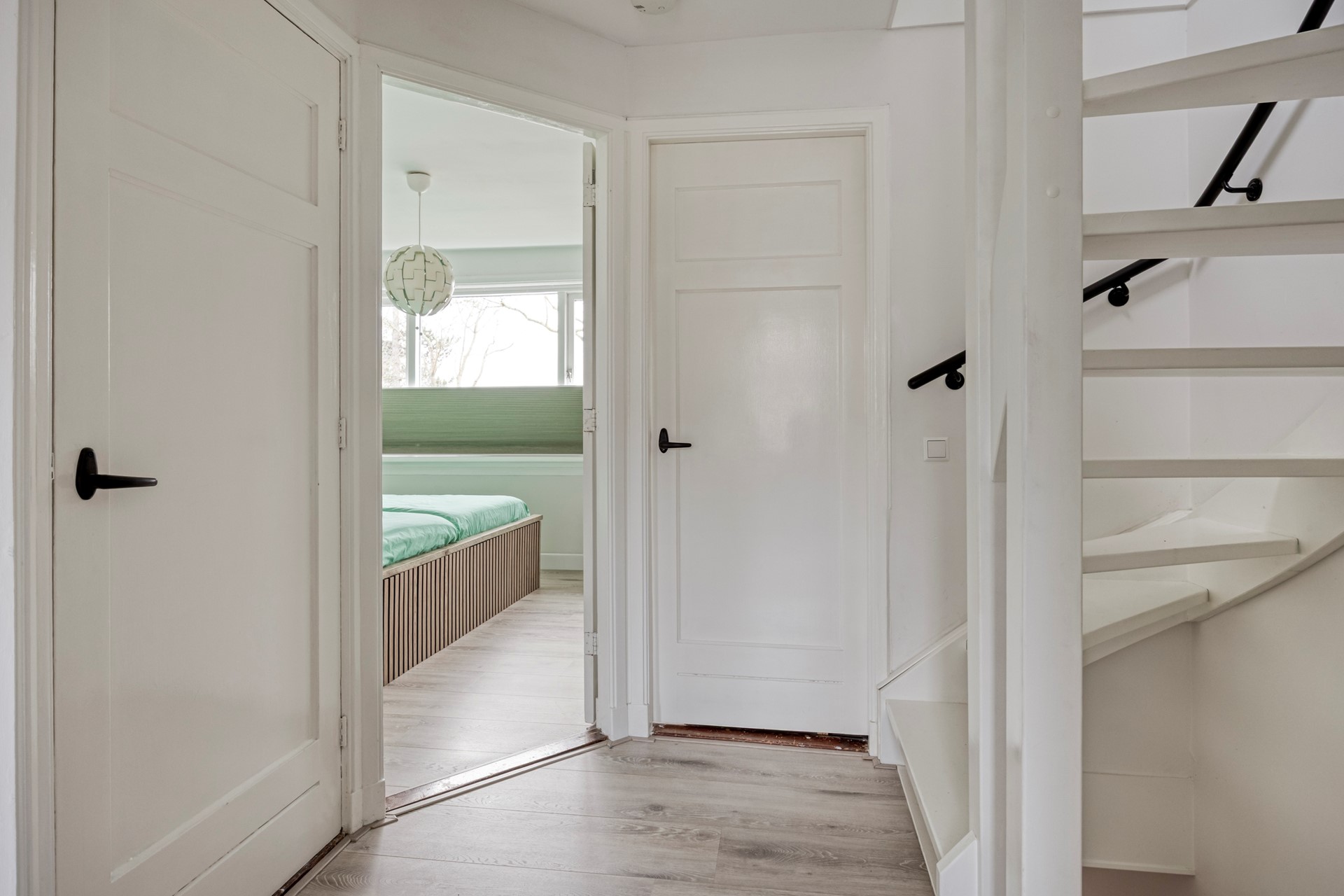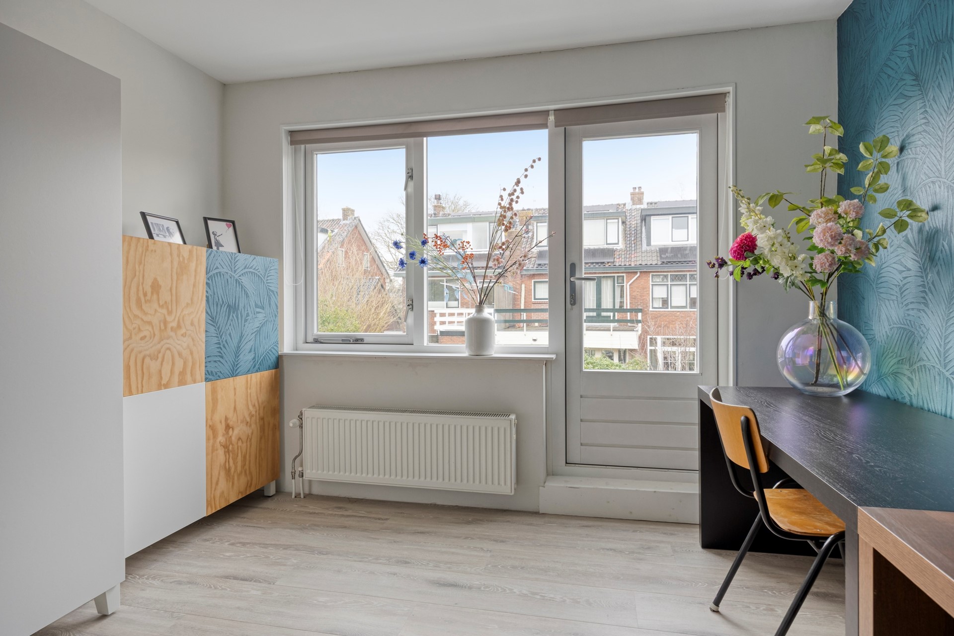 De voorslaapkamer was oorspronkelijk opgesplitst in twee kamers. De huidige bewoners hebben hier een stijlvolle en-suite kledingruimte van gemaakt, echt heel gaaf. Met een eenvoudige wand is hier weer een extra kamer te creëren. De tweede slaapkamer aan de achterzijde is strak afgewerkt, heerlijk licht (groot genoeg voor minimaal een tweepersoonsbed) en biedt toegang tot het platte dak van de uitbouw. Let je ook weer op alle details wat dit huis zo bijzonder maakt?