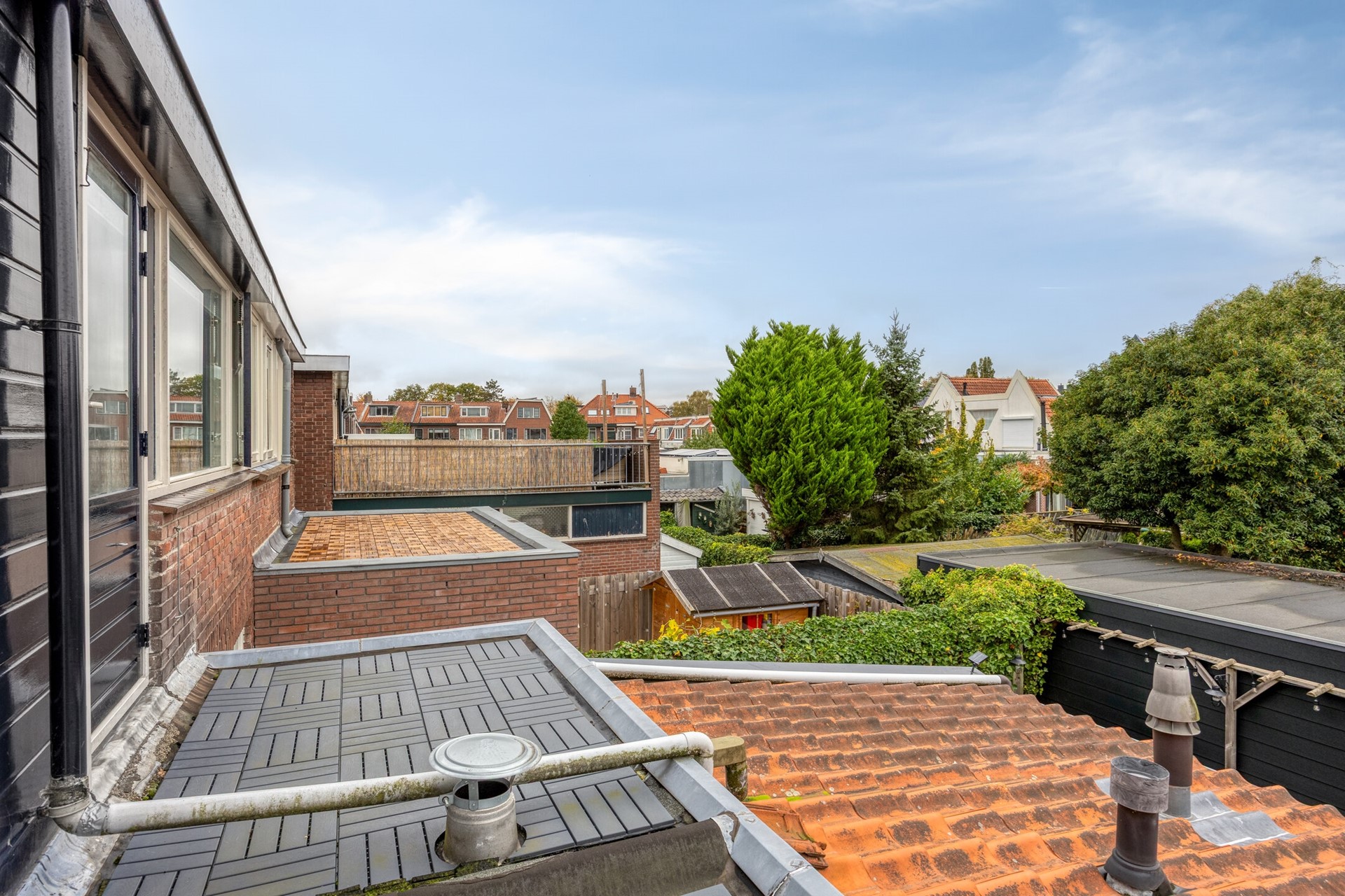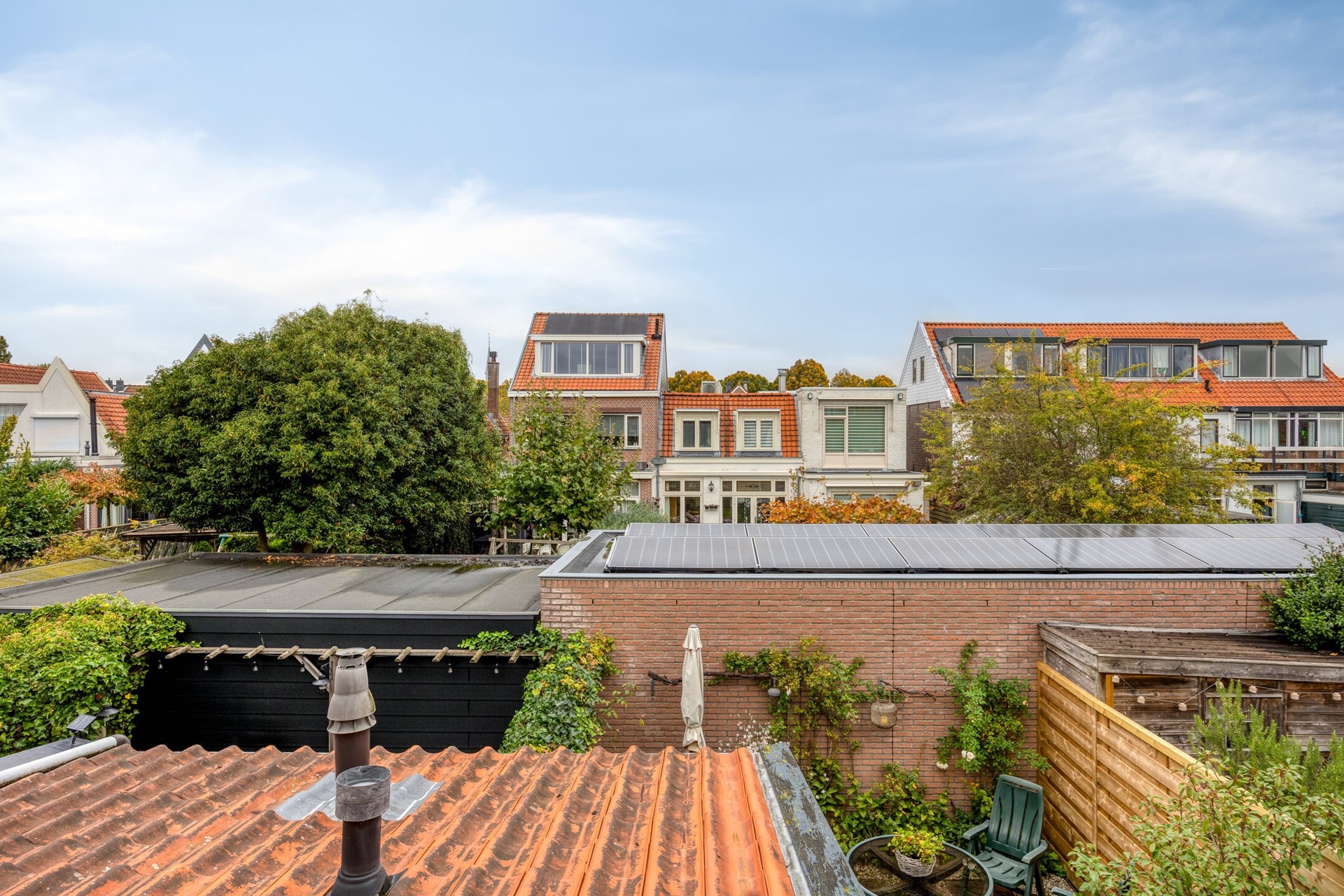 Via de woonkamer dus, maar ook via de bijkeuken kunnen we naar de achtertuin. Wat deze woning ook bijzonder maakt, is de achtertuin van circa 35 m² op het noordwesten. Omdat dit het laatste huis in het “poortrijtje” is, ligt de tuin nét wat dieper dan gebruikelijk. Hierdoor geniet je van veel zon en privacy, zonder directe bebouwing eromheen. Er is een achterom, dus fietsen kun je veilig stallen. Ook de voortuin (ca. 2,4 x 16,5 m, zuidoosten) zorgt voor een charmante entree en extra buitenruimte.