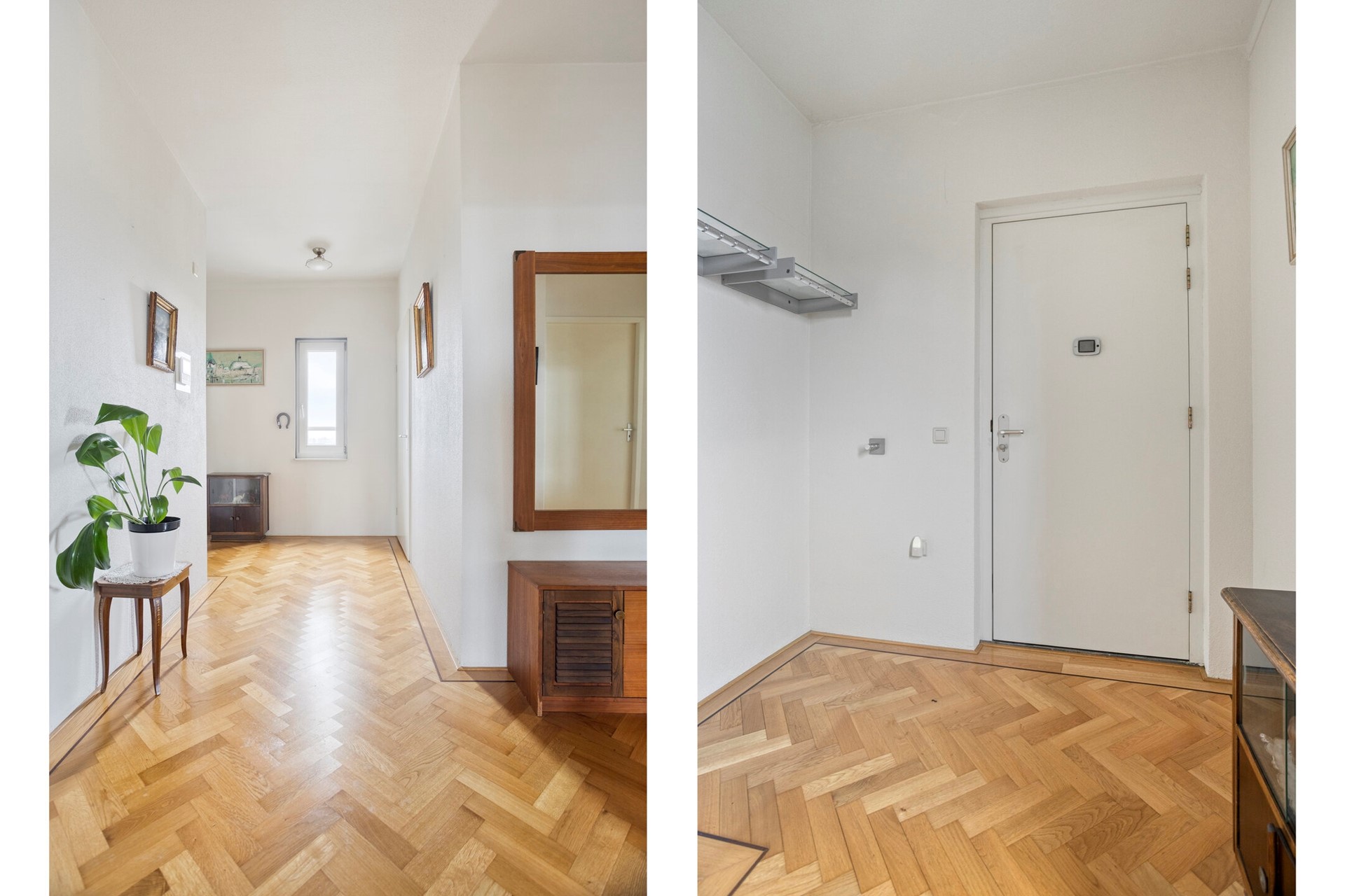 Via de nette centrale entree neem je de lift naar de zevende verdieping. Zodra je binnenstapt in de Z-vormige hal merk je direct de ruimte van het appartement. Hier vind je de garderobe, het separate toilet met fontein en de praktische bijkeuken met veel bergruimte, de ventilatie-unit en de aansluiting voor wasapparatuur. Vanuit de hal lopen we verder richting het hart van de woning.