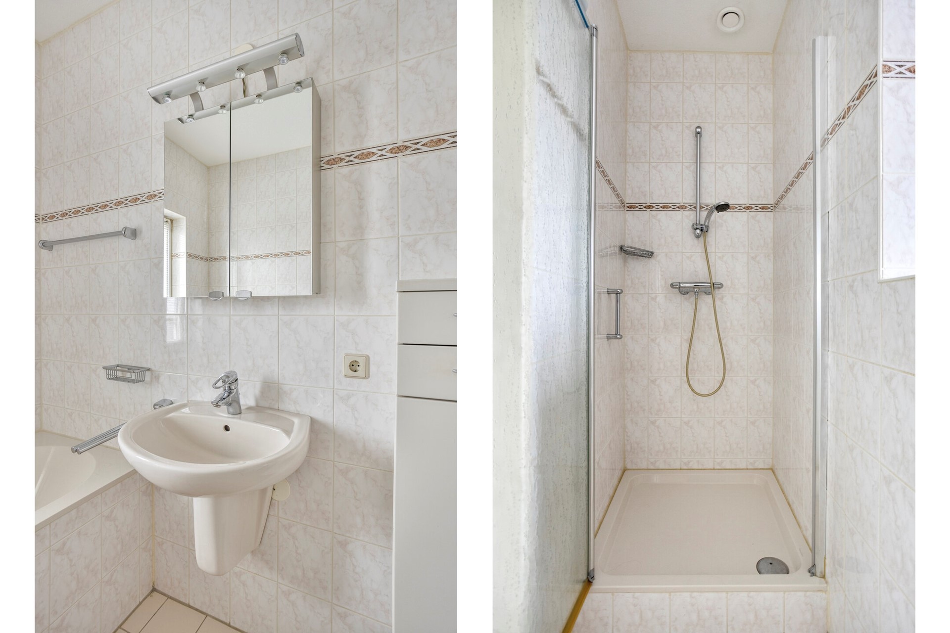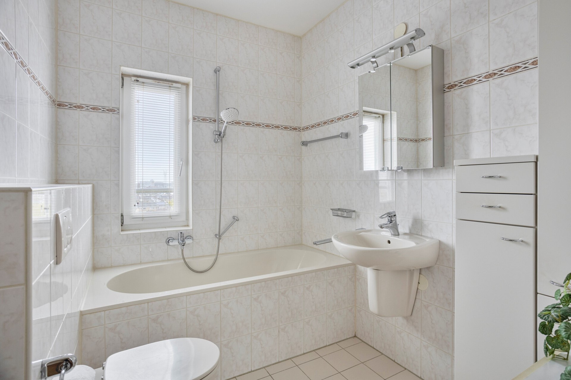 De badkamer is compleet uitgevoerd met een ligbad, douche, wastafelmeubel en tweede toilet en biedt zelfs uitzicht richting het centrum van Leiden.