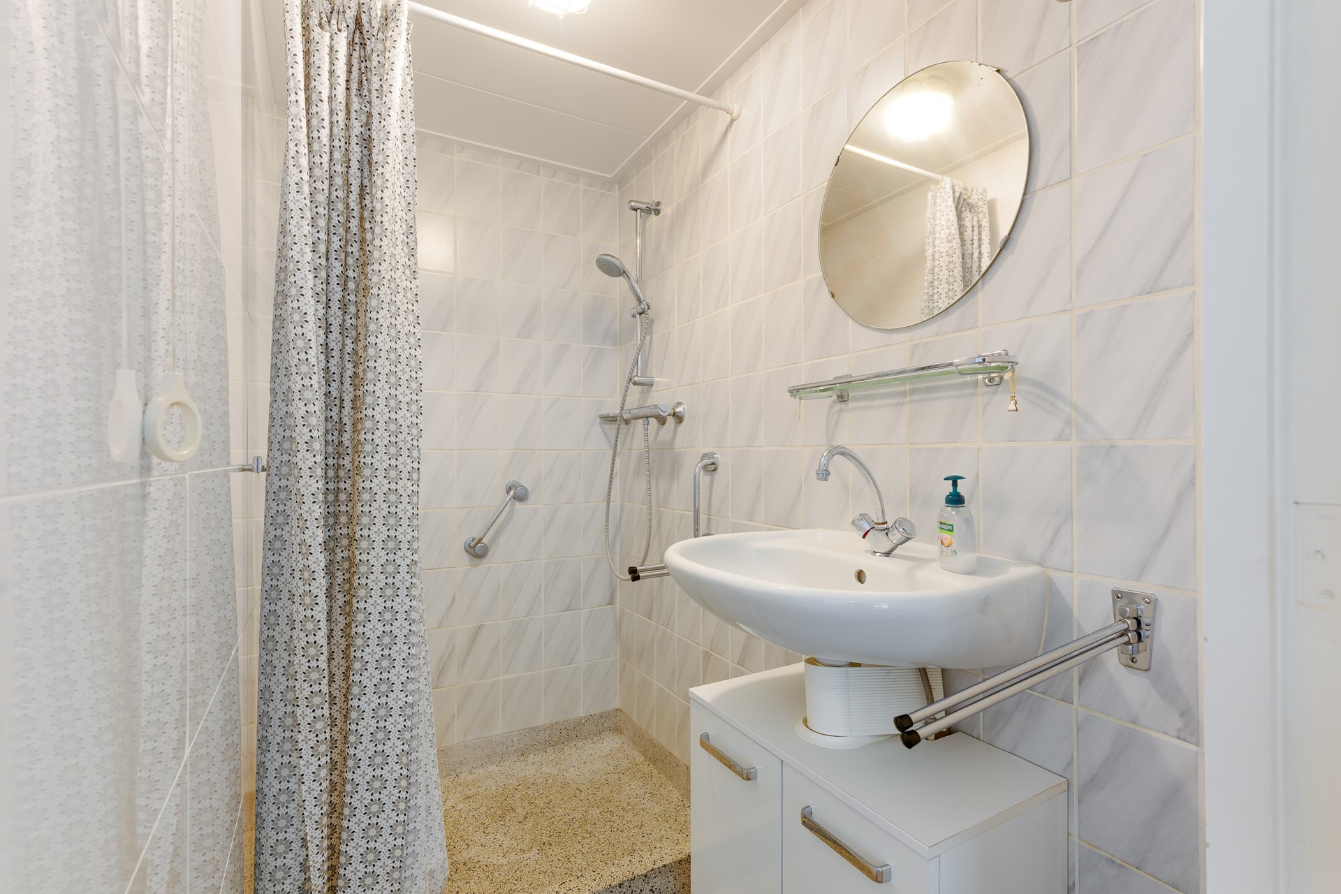 De badkamer is compact en praktisch ingedeeld. Daarnaast beschikt de woning over een eigen berging van ca. 6,9 m² op de begane grond.