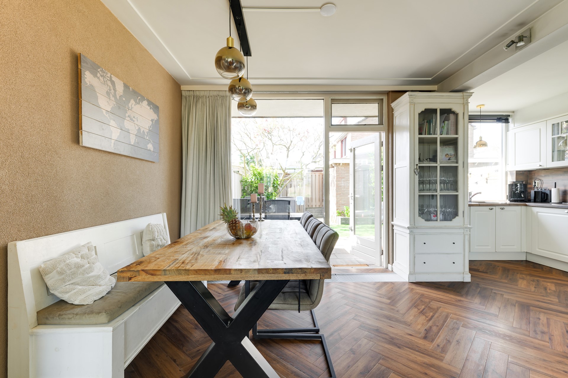 De woonkamer voelt als een comfortabele lounge met veel daglicht en een warme uitstraling. De visgraatvloer geeft karakter en de haard zorgt voor sfeer en warmte op koudere dagen. Aan de achterzijde ligt de open keuken, praktisch ingericht en in direct contact met de tuin. Terwijl binnen wordt gekookt, schuift buiten de zon langzaam over het terras.