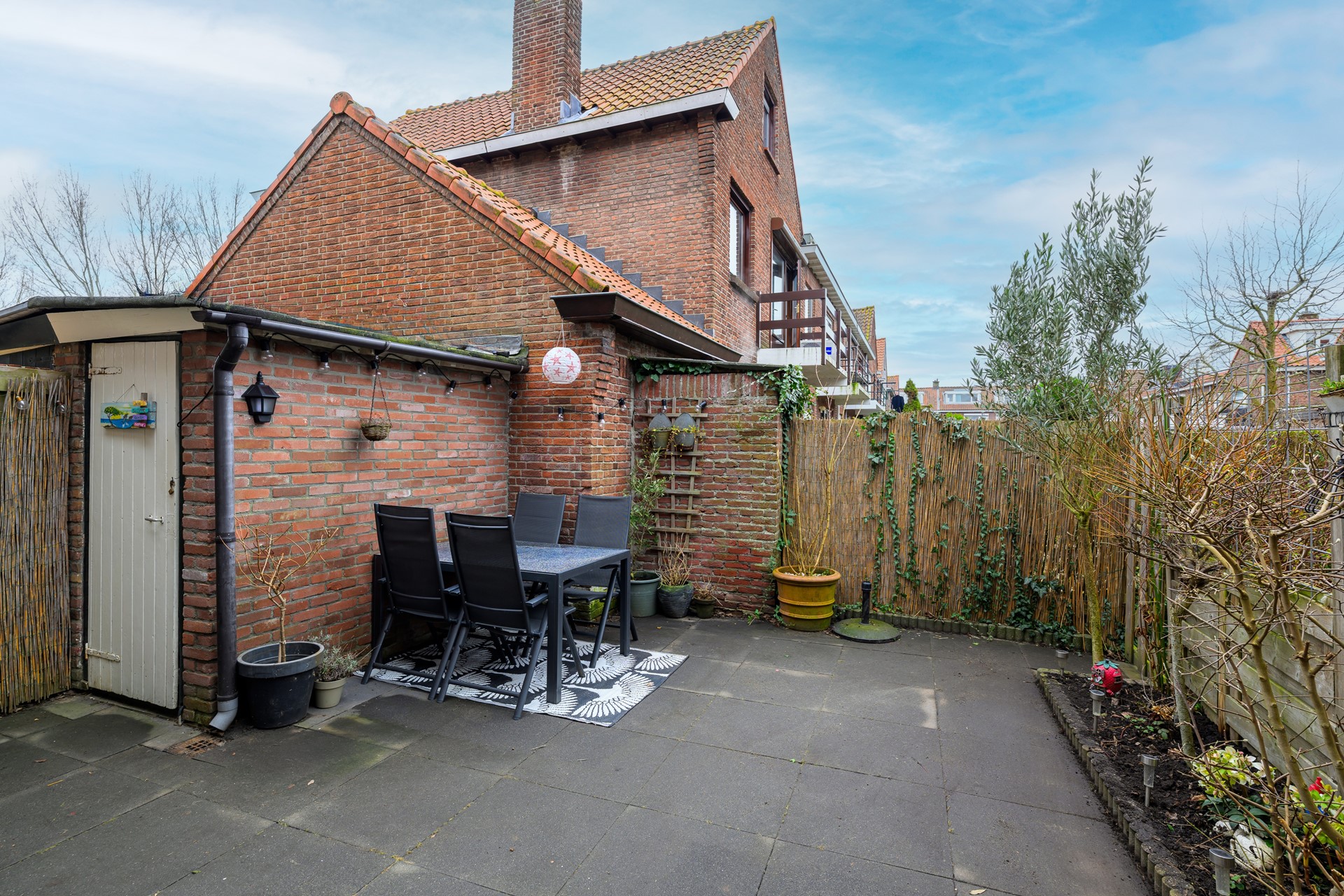 De achtertuin is een fijne, beschutte plek waar je rustig kunt zitten, eten of genieten van het buitenleven. Achterin bevindt zich een berging voor fietsen en opslag.