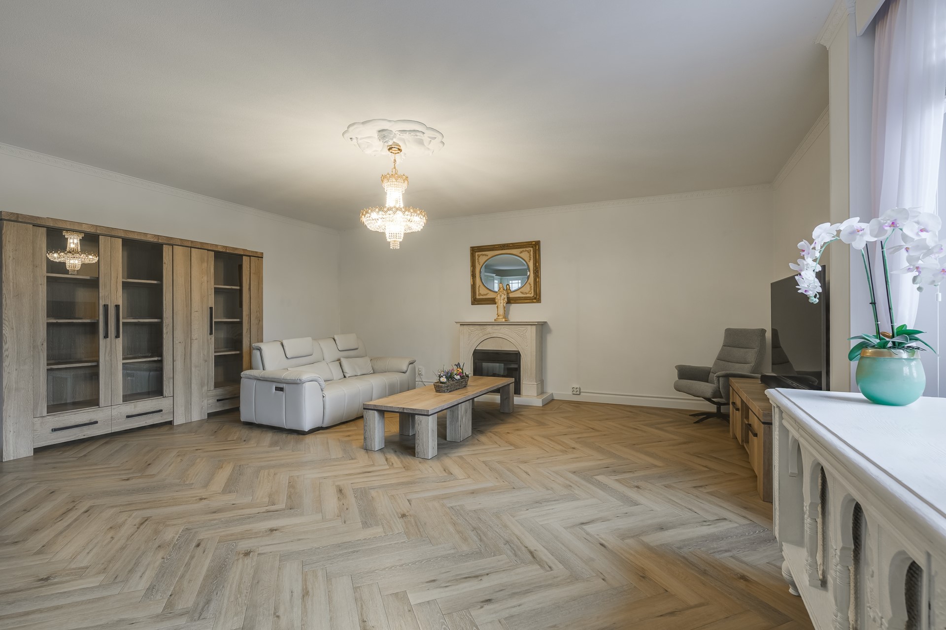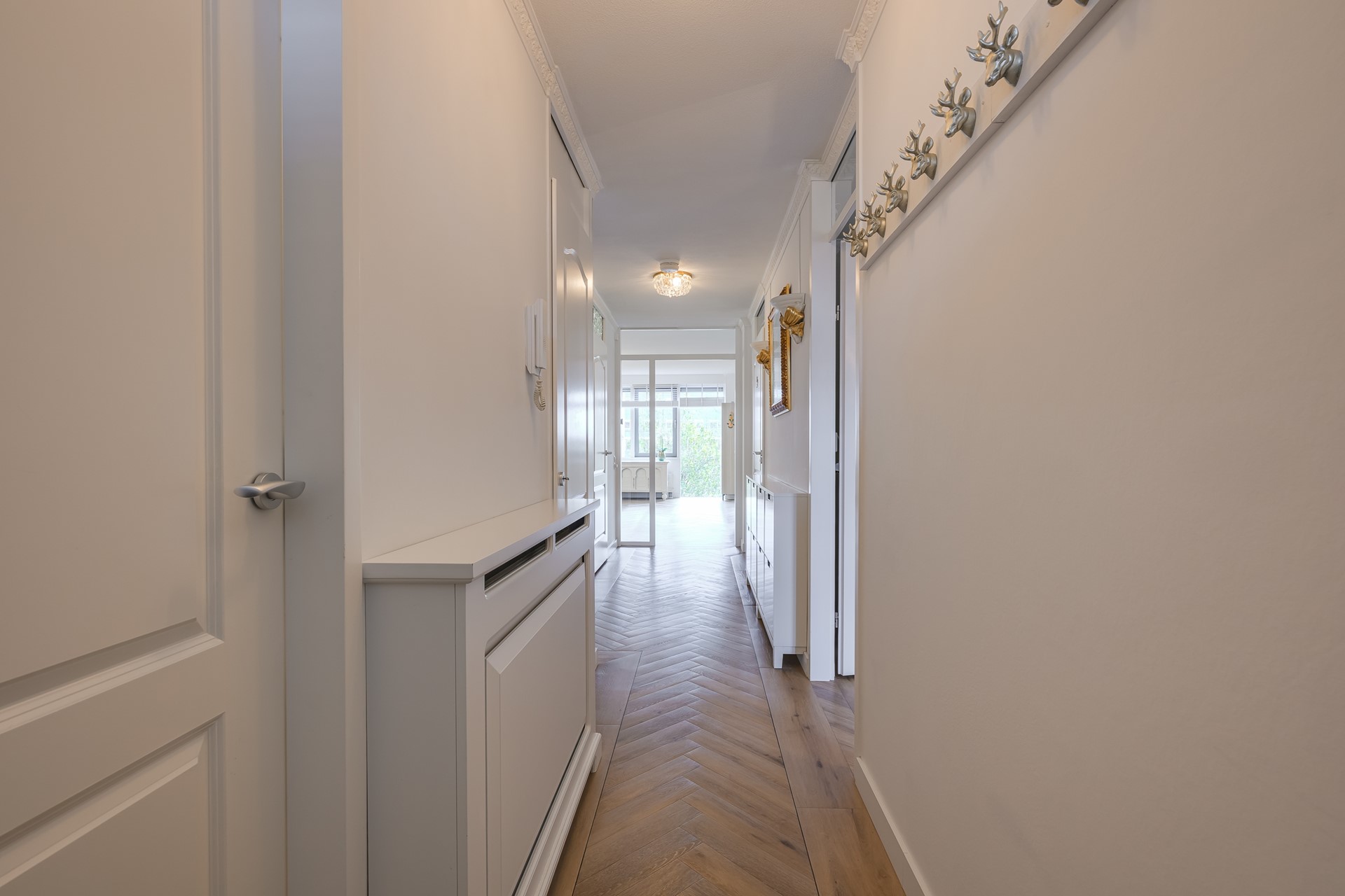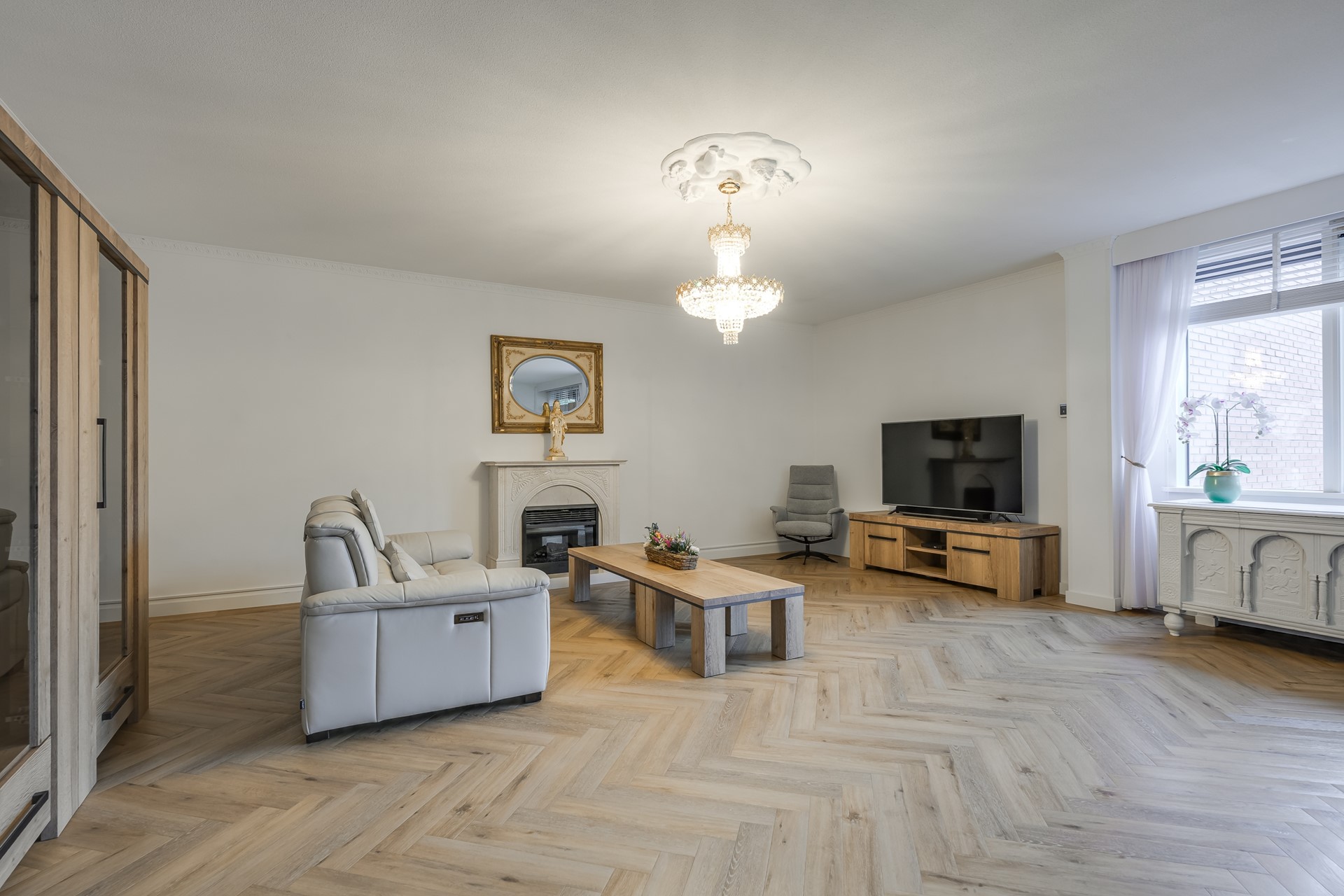 Via de galerij bereik je de entree van de woning. De ruim opgezette hal geeft toegang tot alle vertrekken. De grote woonkamer is direct een eyecatcher: een brede, lichte leefruimte met sfeervolle afwerking, strak schilderwerk en een doorgelegde PVC-vloer in visgraatmotief. Grote raampartijen en een schuifpui geven toegang tot één van de terrassen.