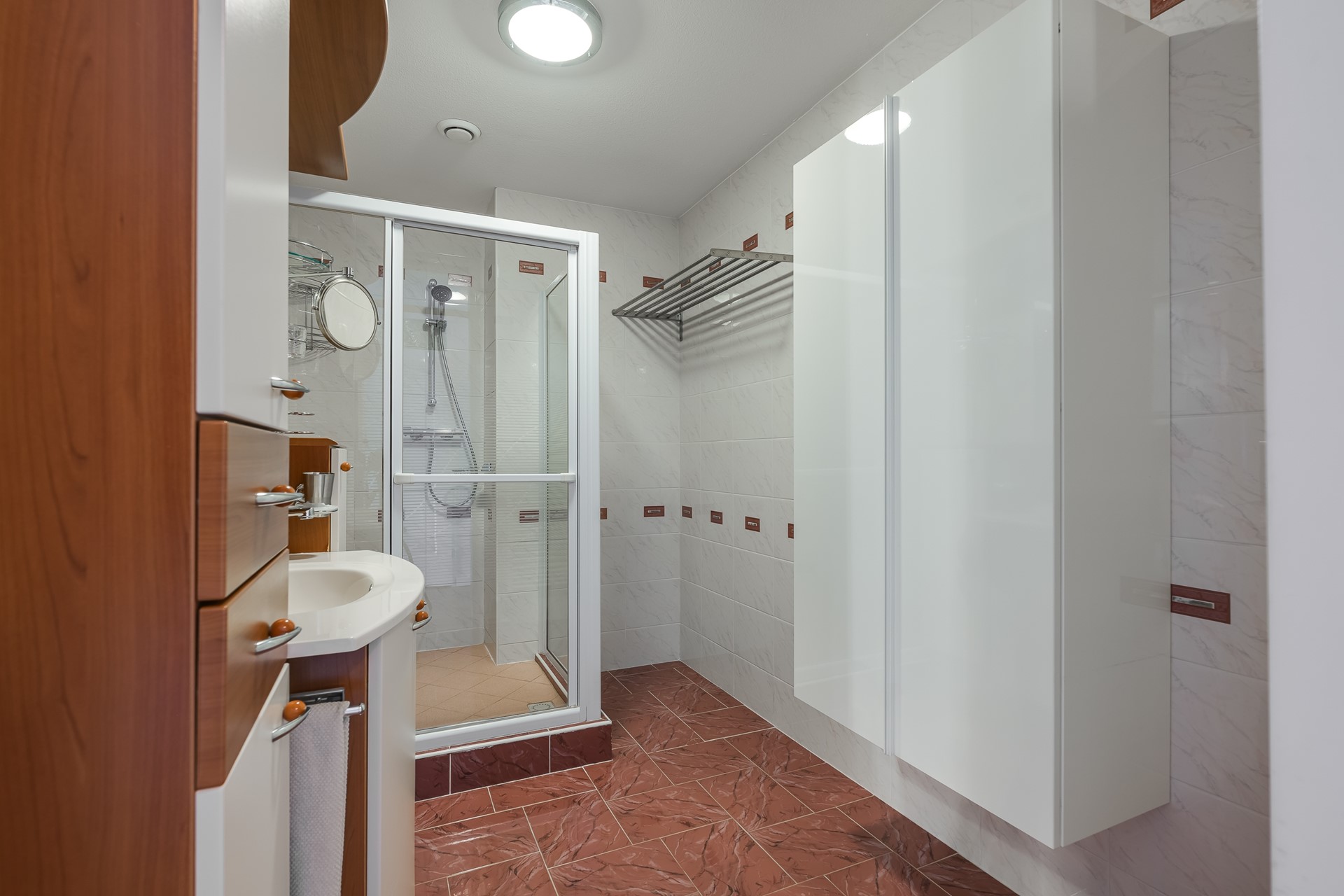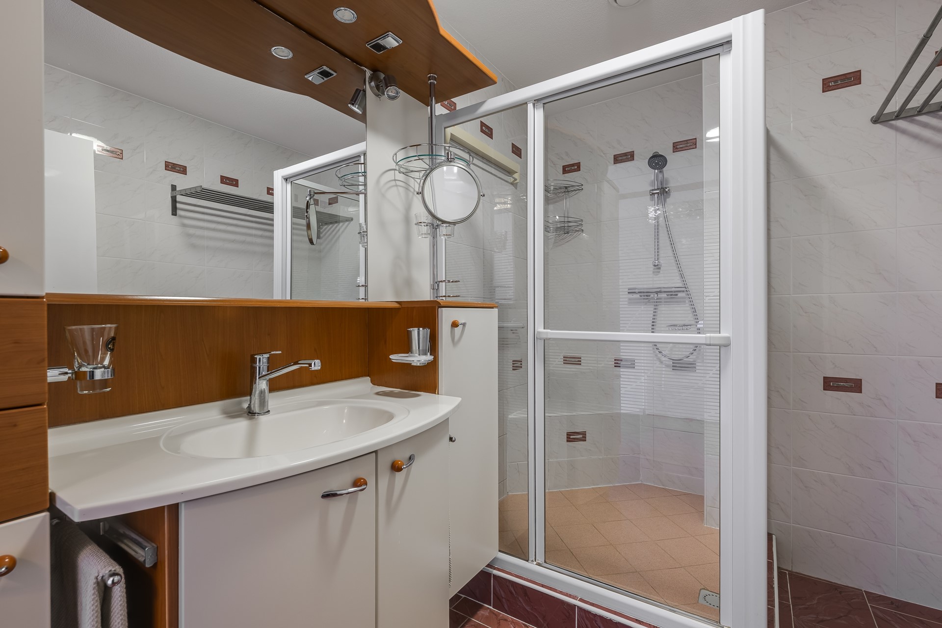 De badkamer is netjes onderhouden en voorzien van een douchecabine, wastafelmeubel en veel bergruimte. Daarnaast is er een separaat toilet in de hal.