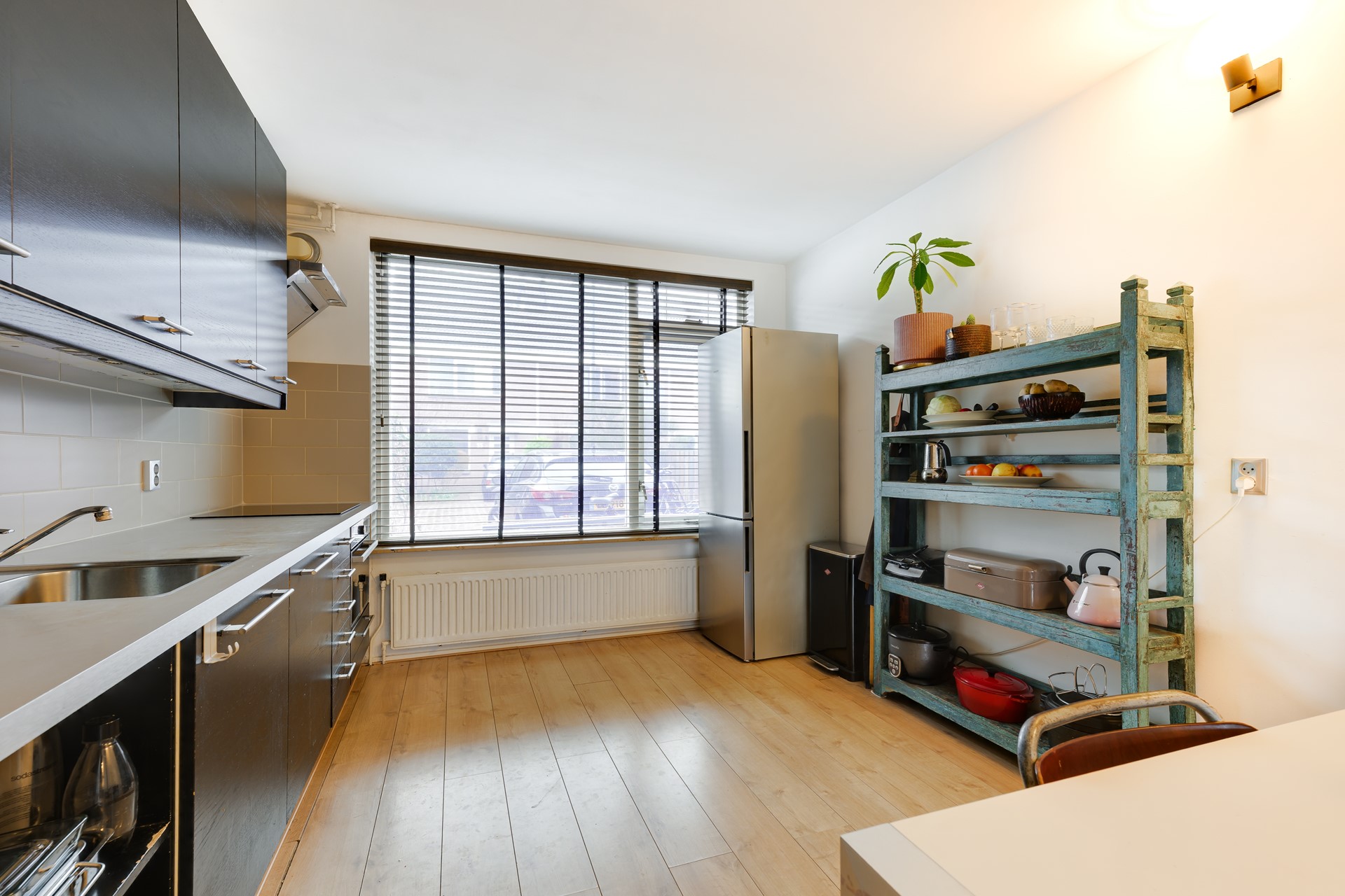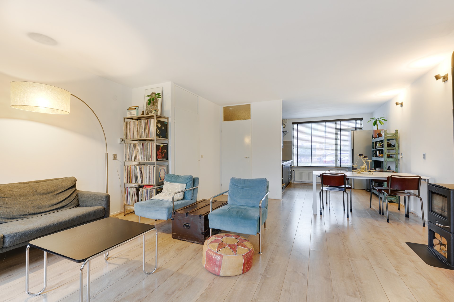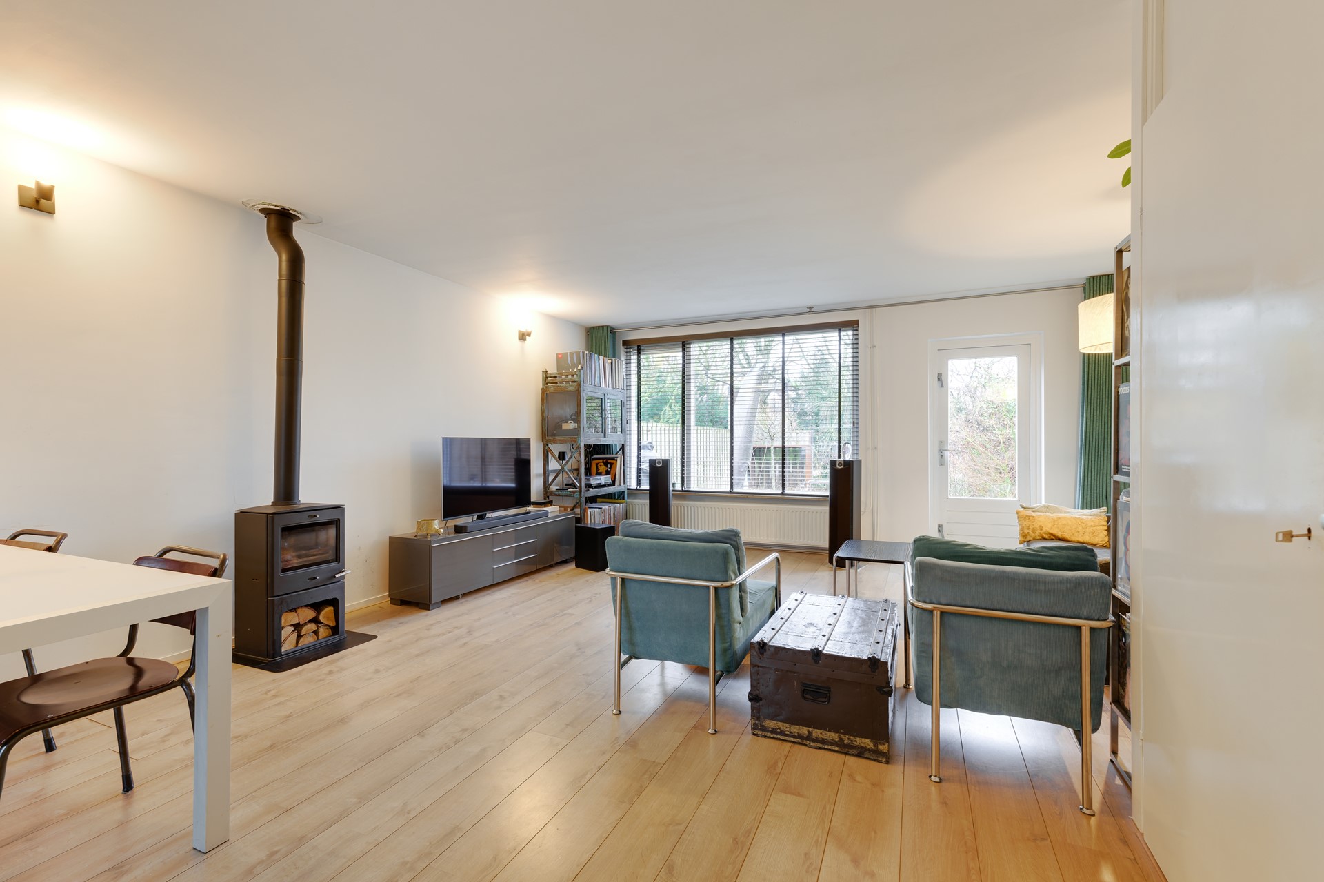 Binnen valt direct de lichte en royale doorzonwoonkamer op, voorzien van grote raampartijen en een sfeervolle houtkachel. De open keuken aan de voorzijde is praktisch ingericht en biedt prettig zicht op de straat.
