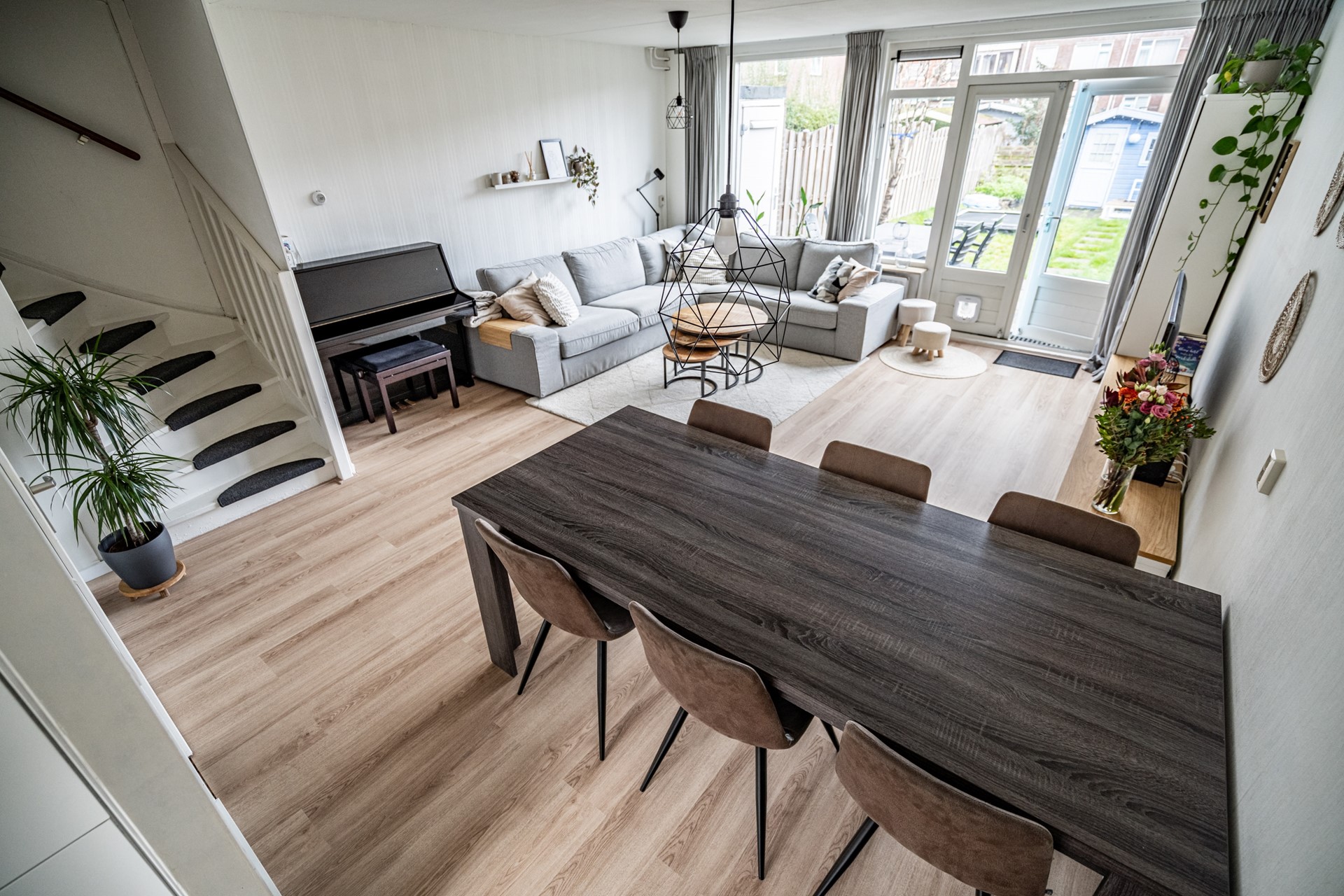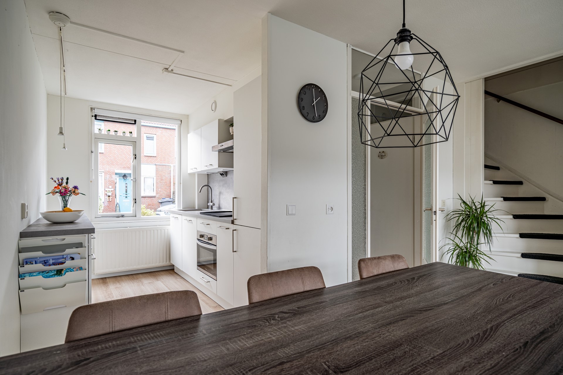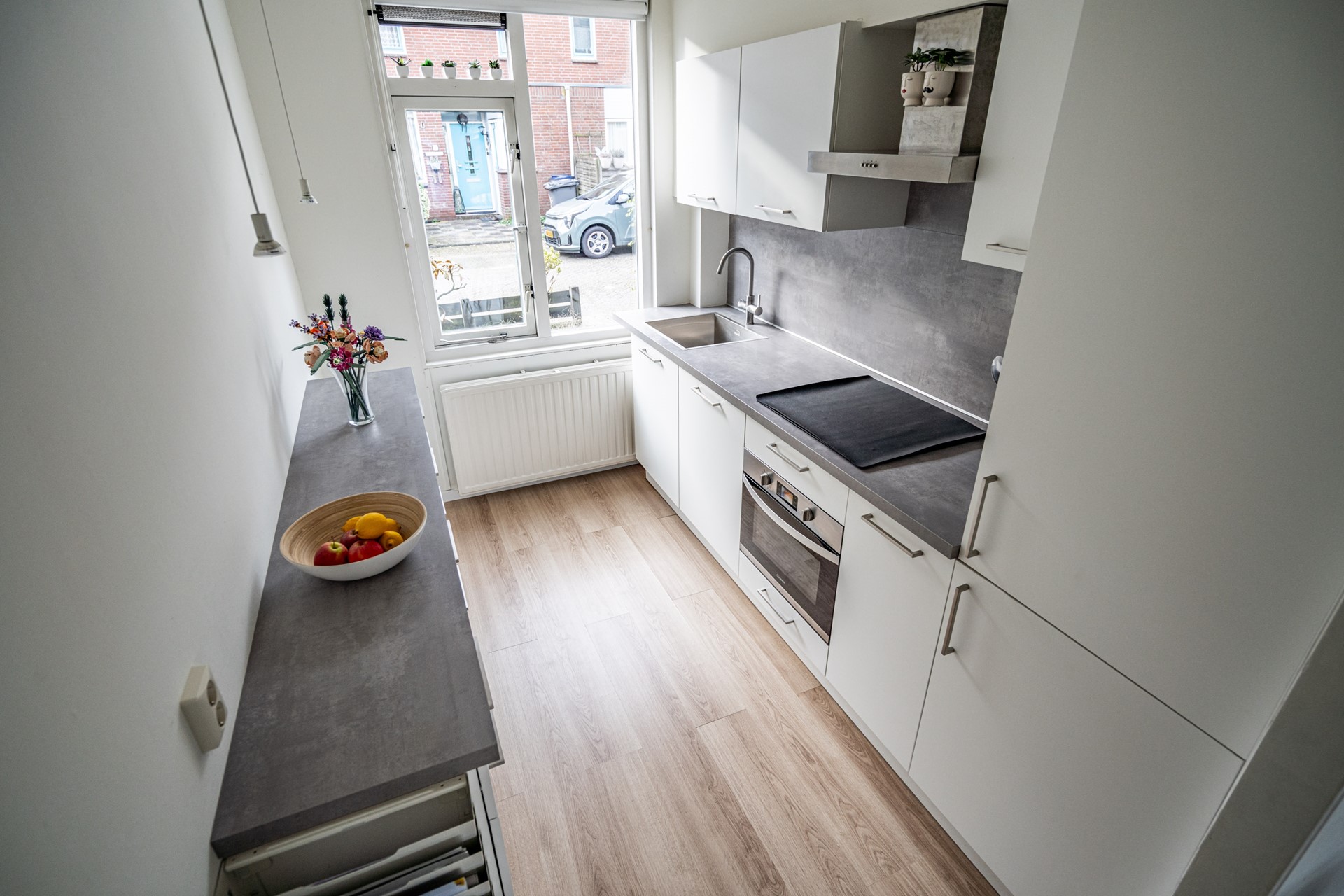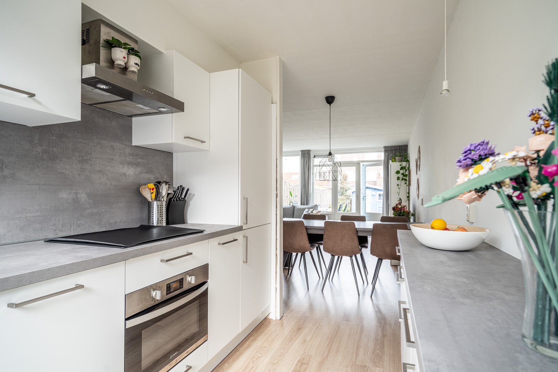 De woonkamer is ruim en licht door de grote raampartijen aan de achterzijde. Er is voldoende plek voor een zit- en eethoek en de open verbinding met de keuken zorgt voor een prettige leefruimte. De keuken is in 2023 volledig vernieuwd en voorzien van onder andere een vaatwasser, oven/magnetroncombinatie, inductiekookplaat, koelkast, vriezer, afzuigkap, spoelbak én een Quooker. Een praktische en moderne keuken waar alles binnen handbereik is.