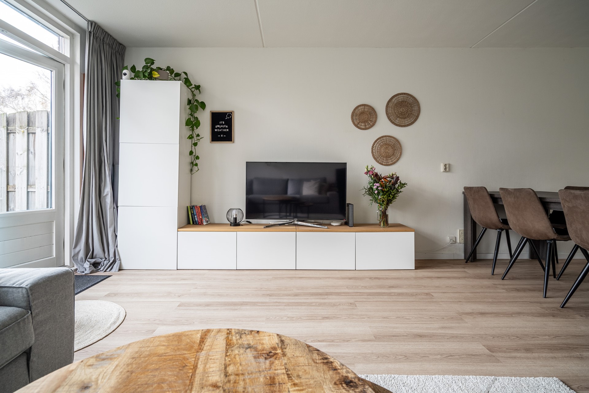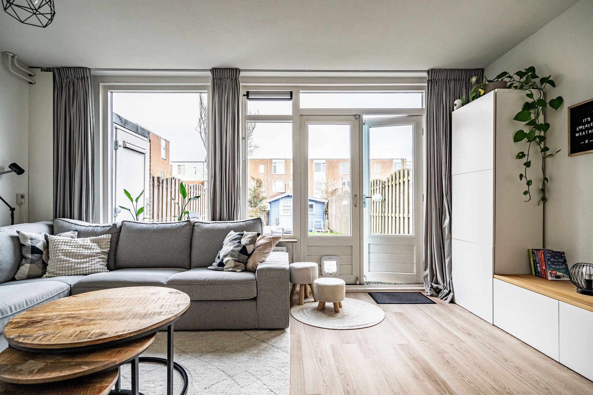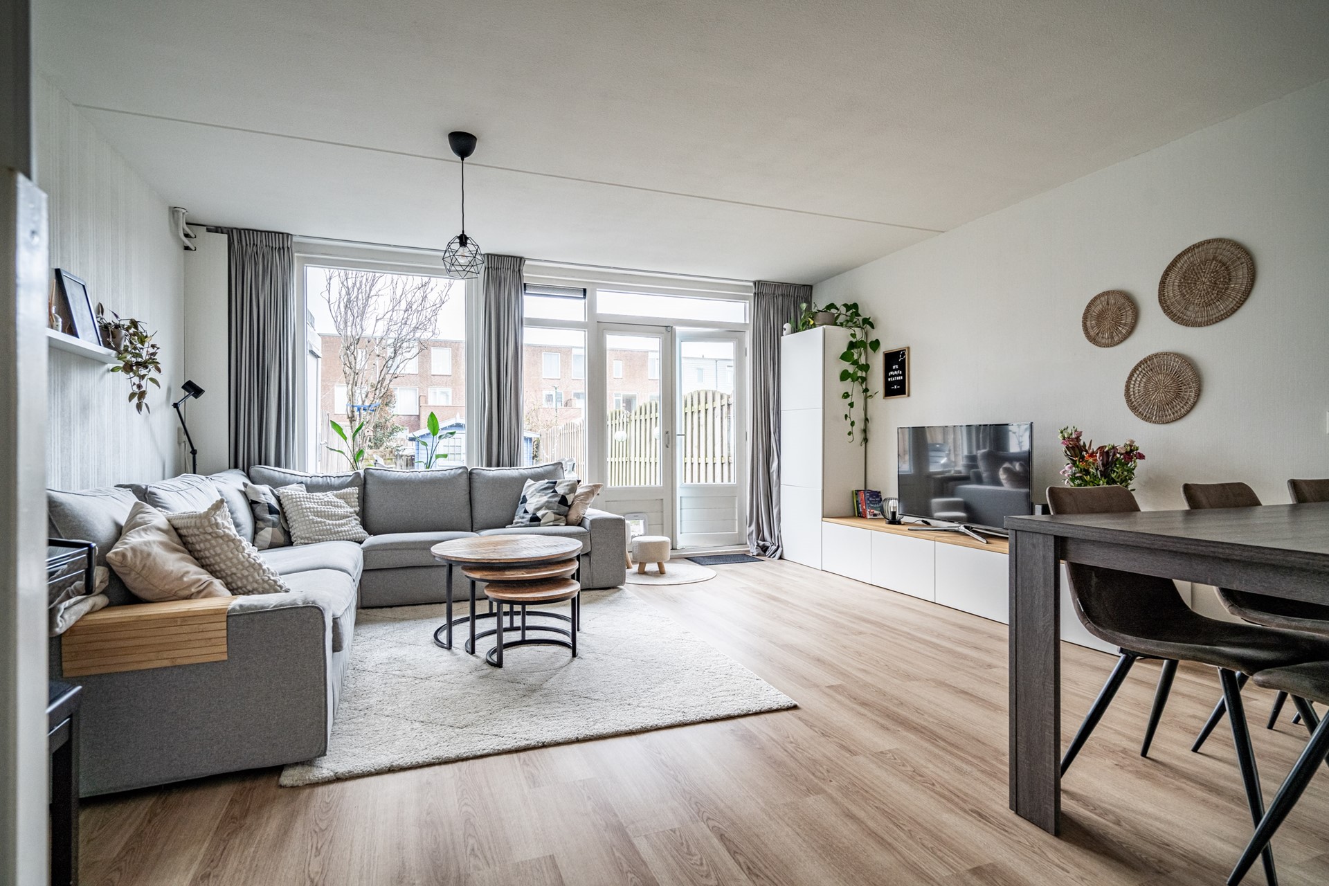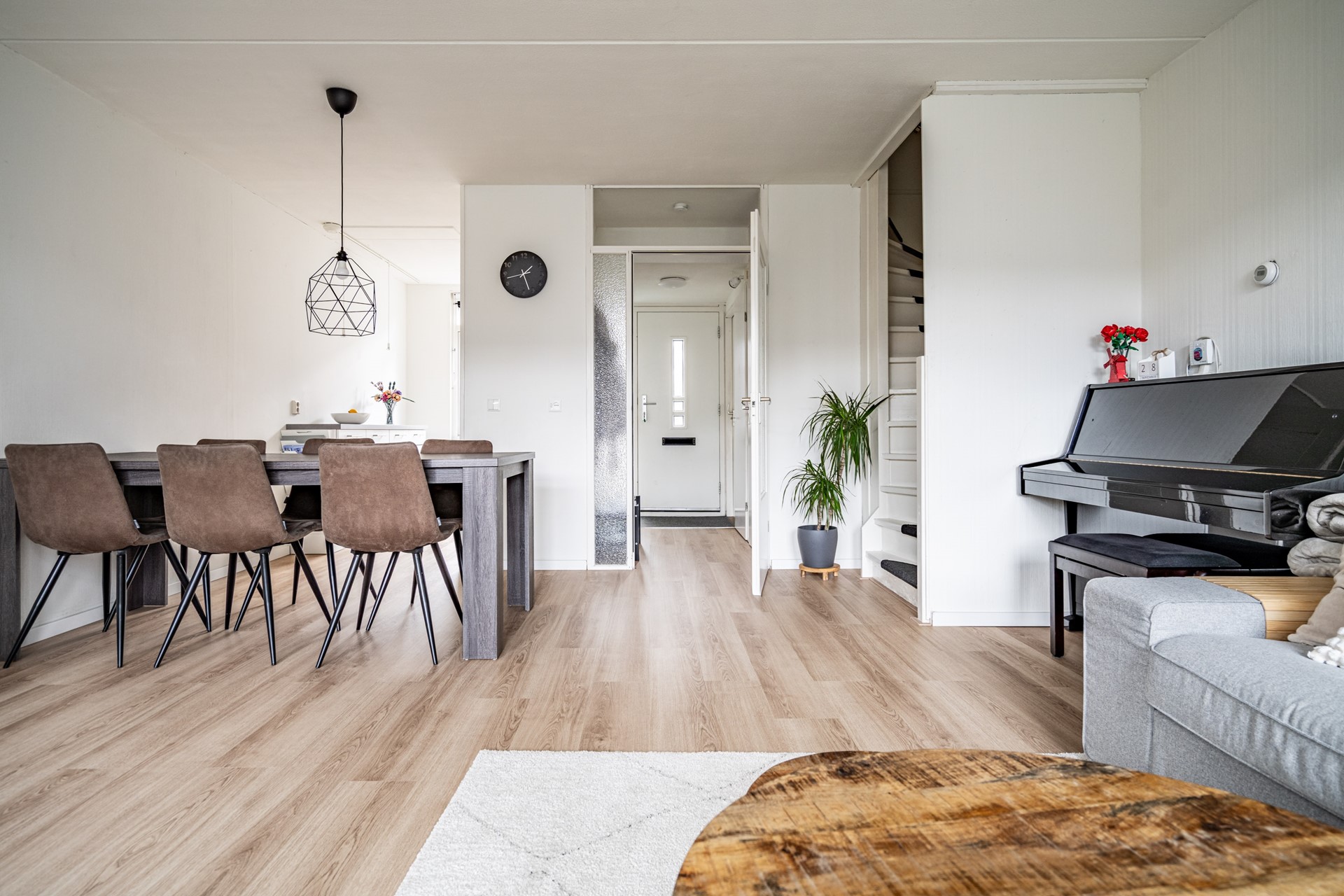 De woonkamer is ruim en licht door de grote raampartijen aan de achterzijde. Er is voldoende plek voor een zit- en eethoek en de open verbinding met de keuken zorgt voor een prettige leefruimte. De keuken is in 2023 volledig vernieuwd en voorzien van onder andere een vaatwasser, oven/magnetroncombinatie, inductiekookplaat, koelkast, vriezer, afzuigkap, spoelbak én een Quooker. Een praktische en moderne keuken waar alles binnen handbereik is.