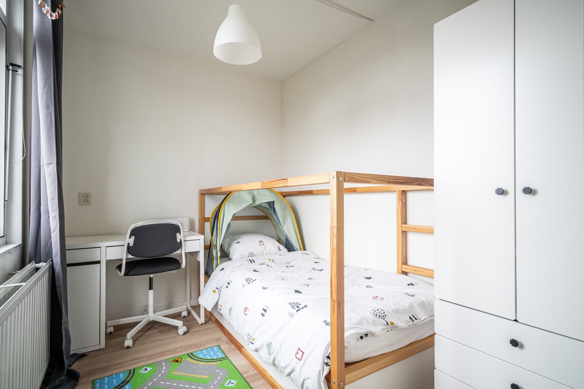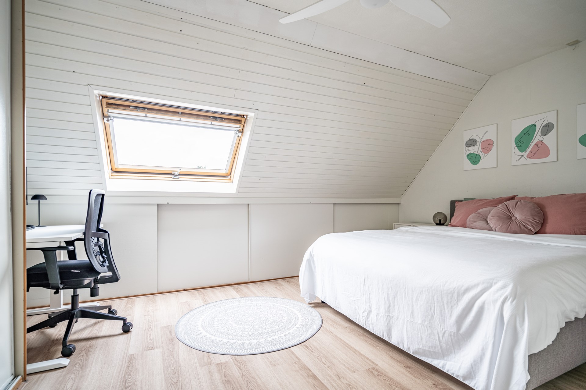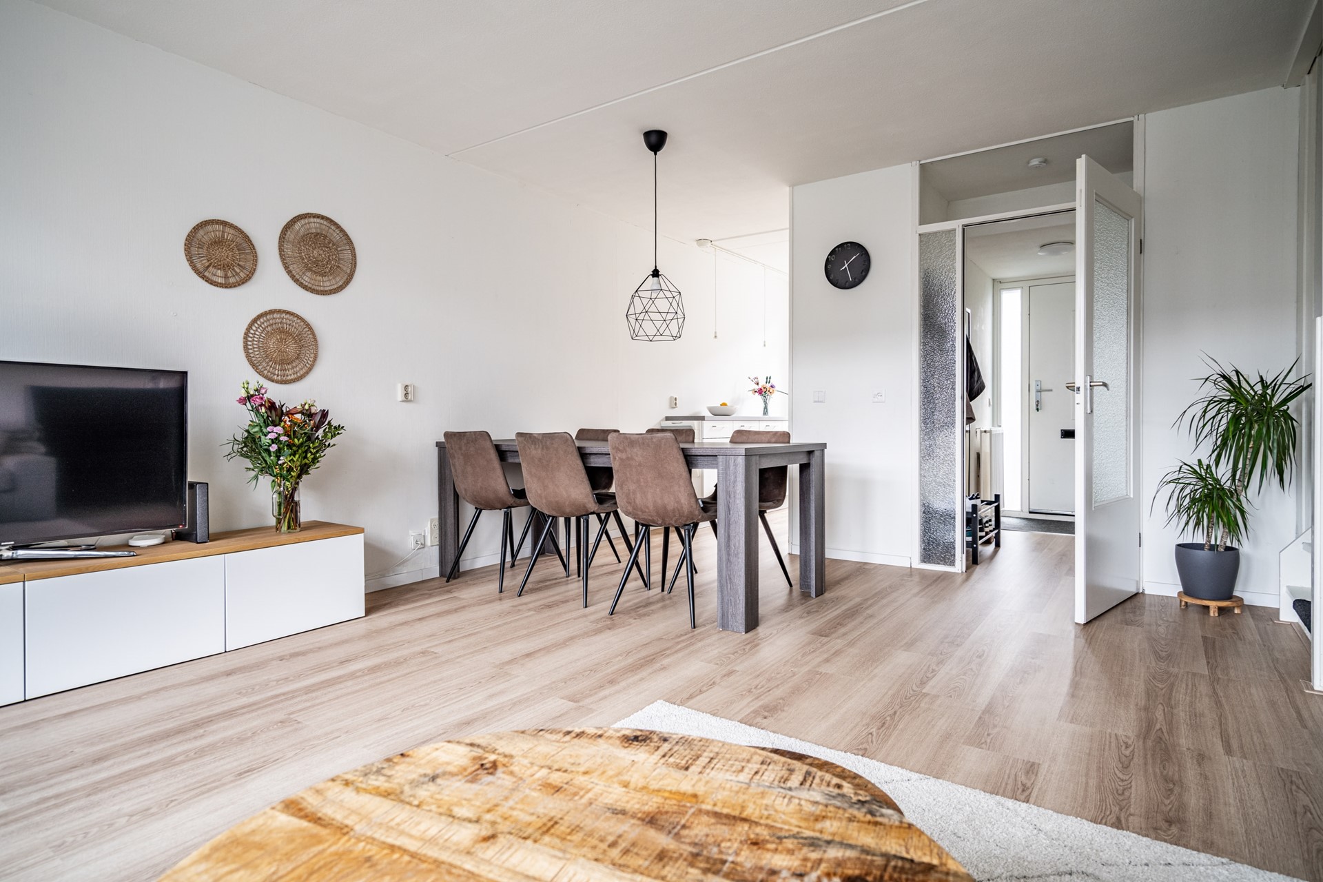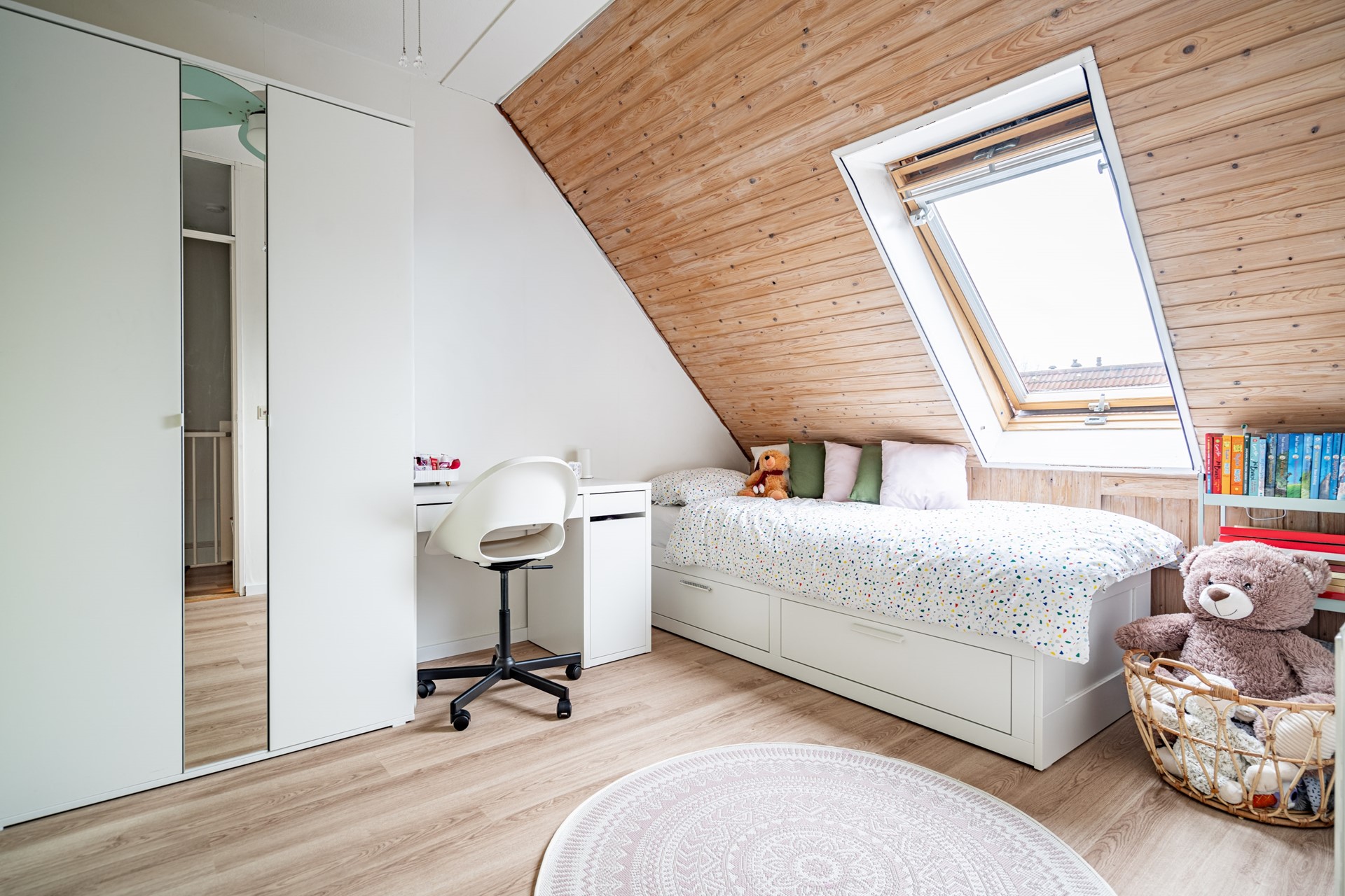 De woonkamer is ruim en licht door de grote raampartijen aan de achterzijde. Er is voldoende plek voor een zit- en eethoek en de open verbinding met de keuken zorgt voor een prettige leefruimte. De keuken is in 2023 volledig vernieuwd en voorzien van onder andere een vaatwasser, oven/magnetroncombinatie, inductiekookplaat, koelkast, vriezer, afzuigkap, spoelbak én een Quooker. Een praktische en moderne keuken waar alles binnen handbereik is.