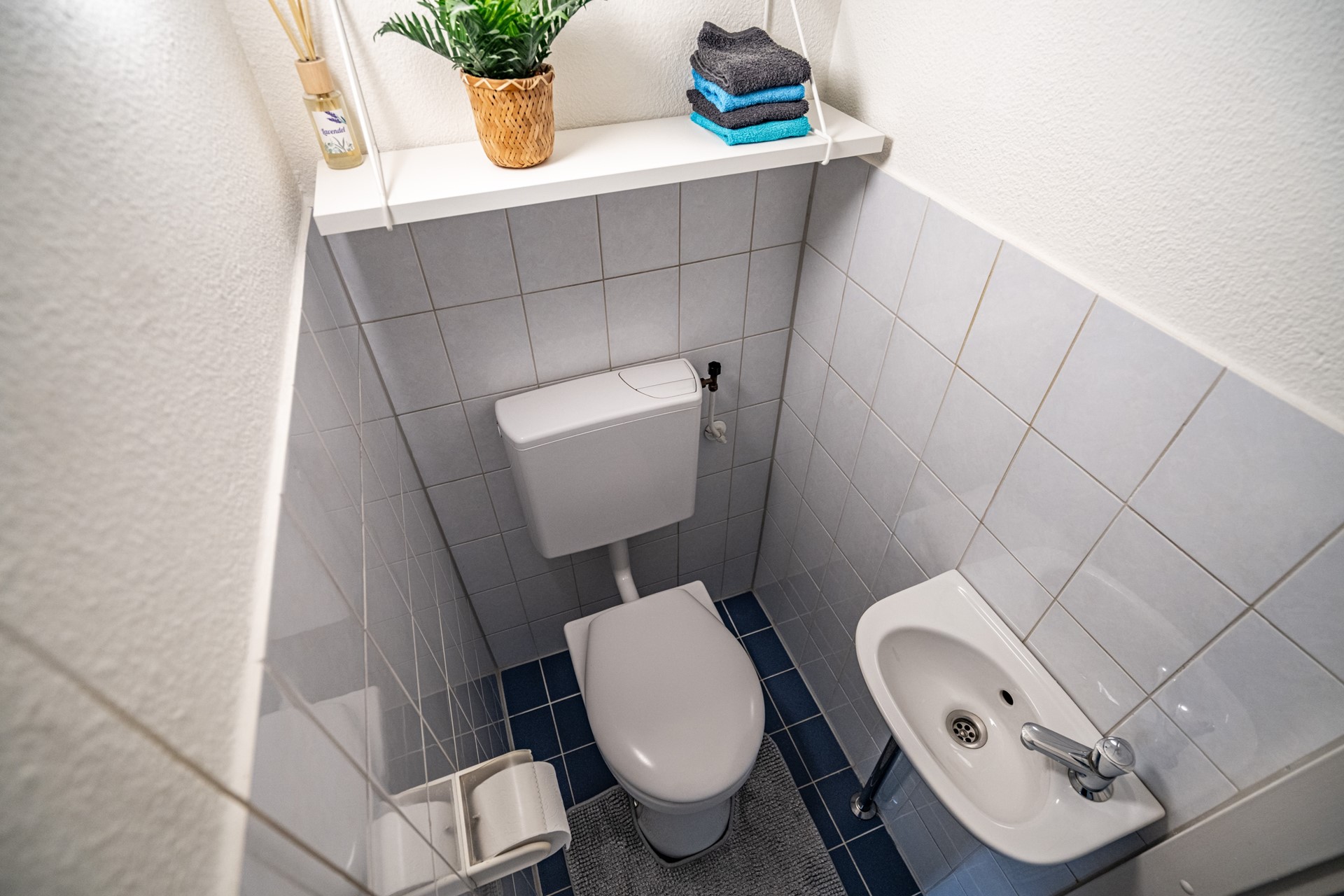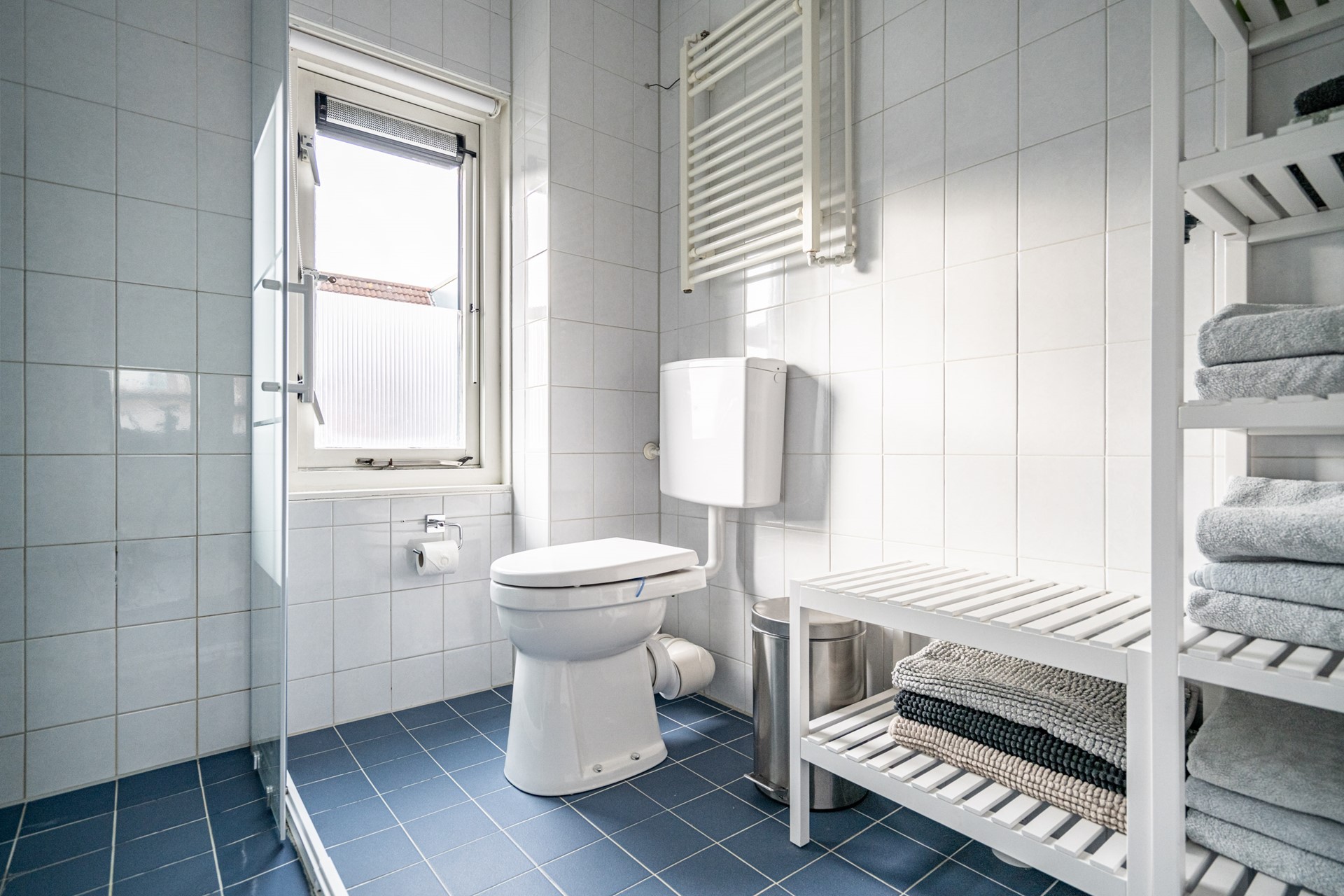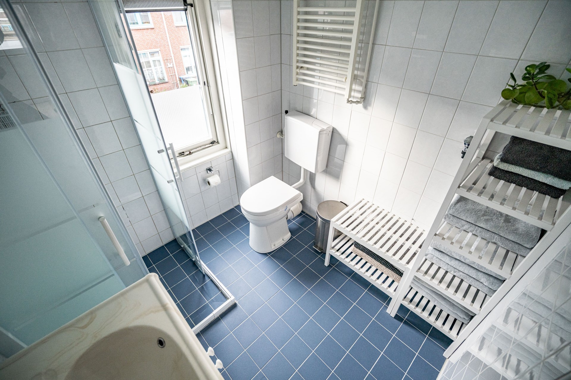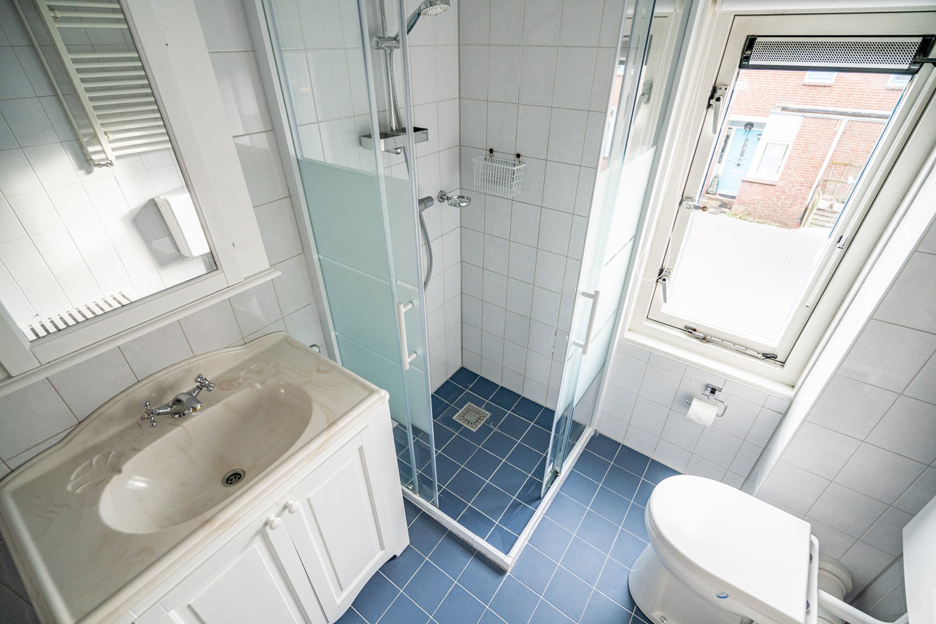 -Badkamer met staand toilet, wastafel en douche