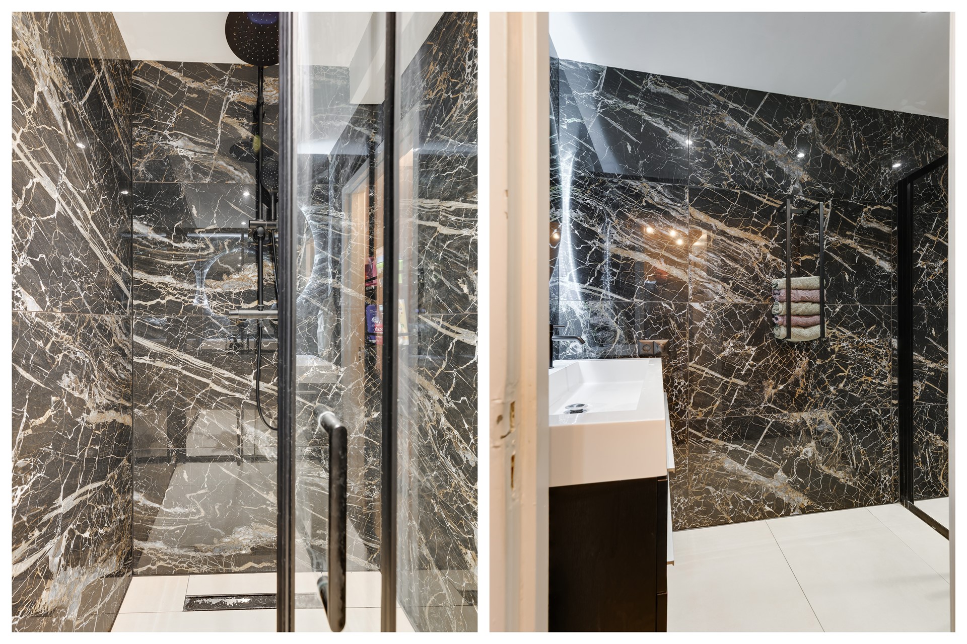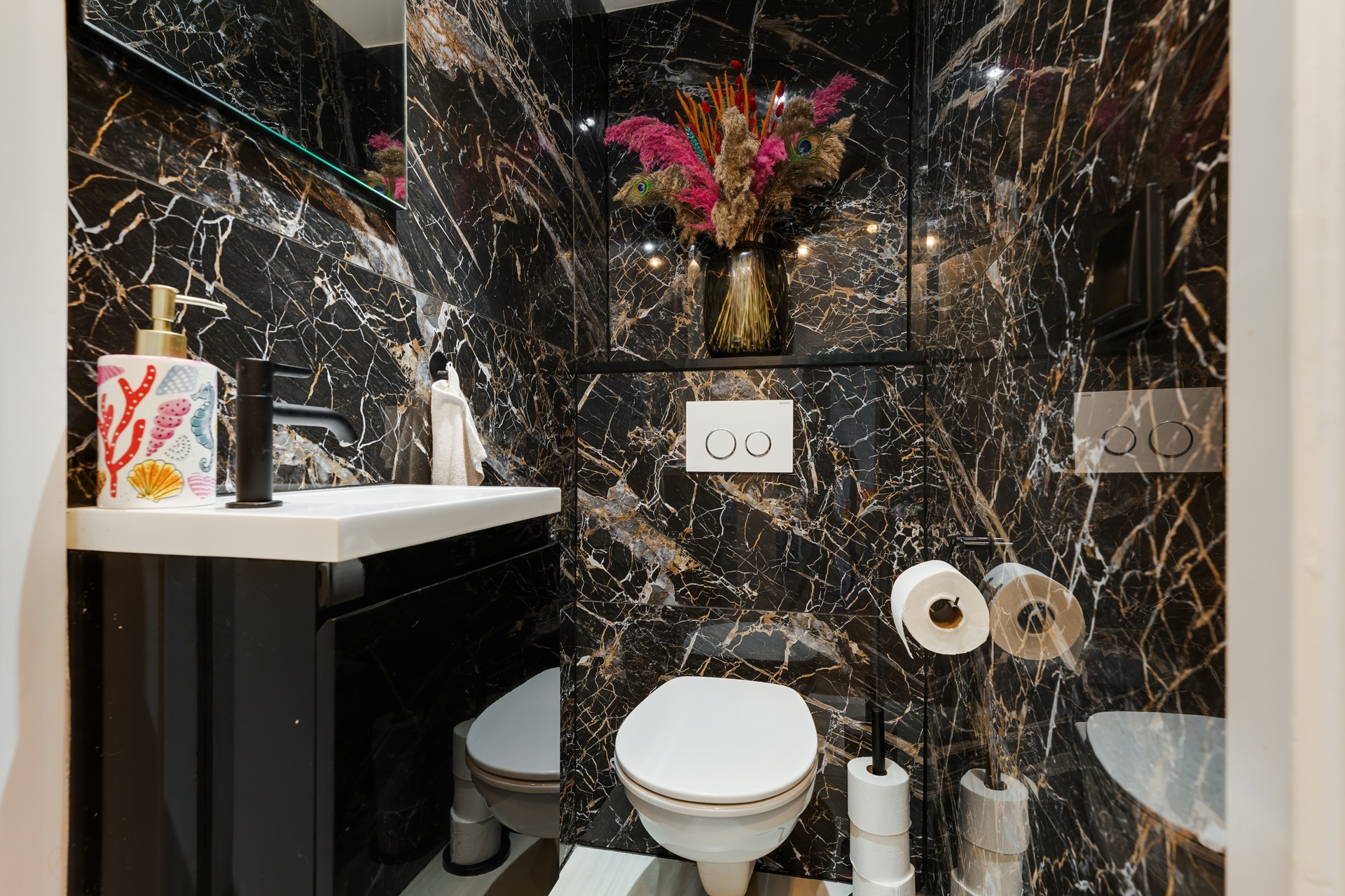 De badkamer en het separate toilet zijn uitgevoerd in een moderne stijl met donkere accenten, wat zorgt voor een luxe en verzorgde uitstraling.