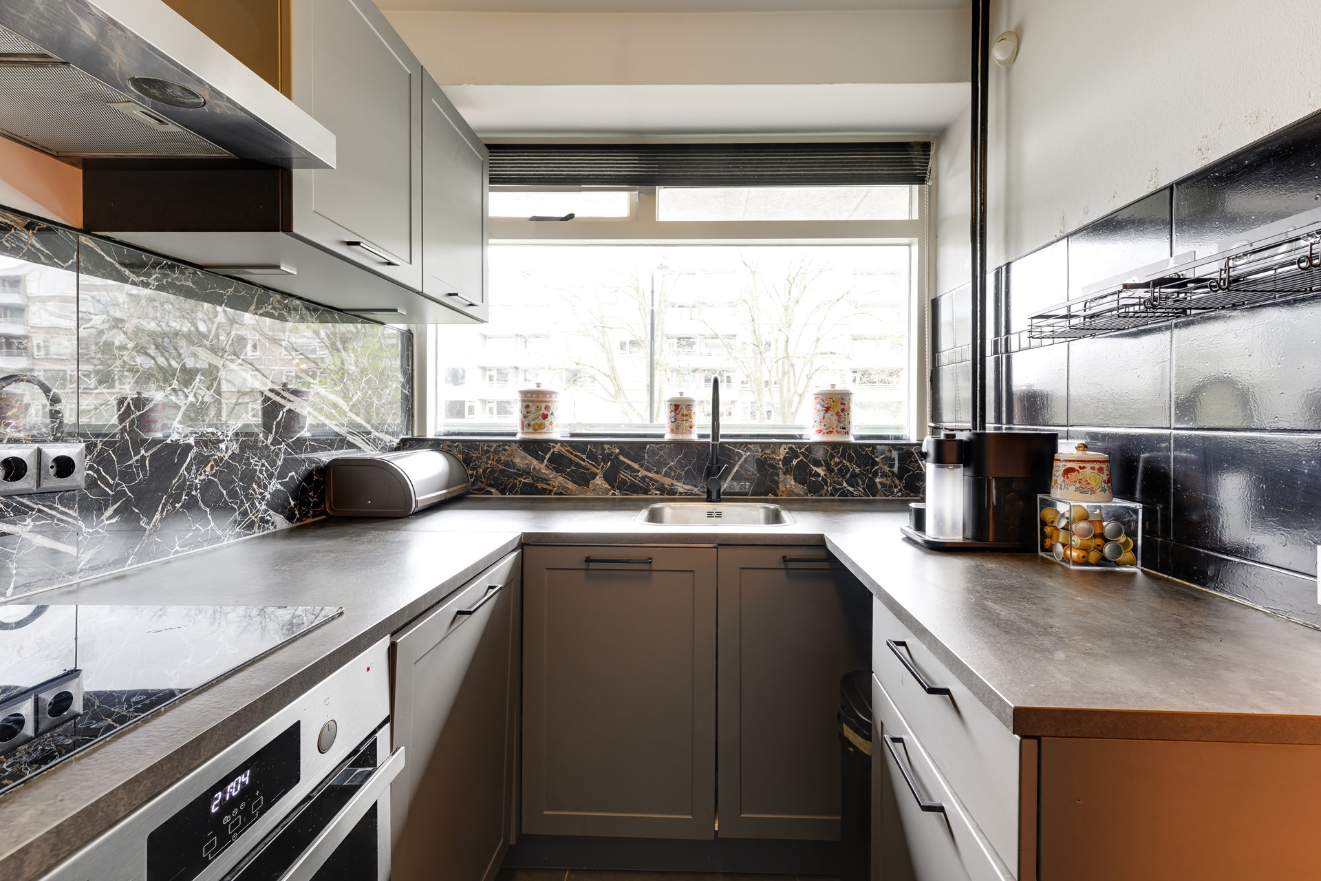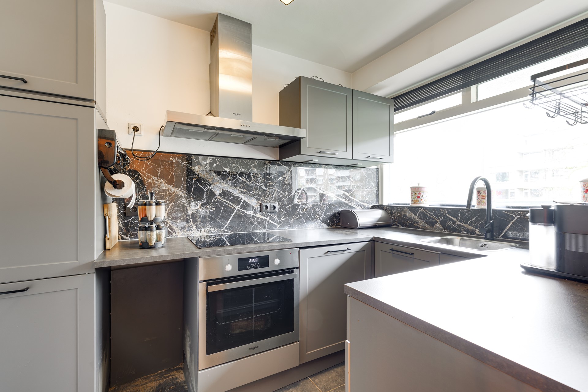 De keuken heeft een moderne uitstraling en is praktisch ingericht met een strak werkblad, inductiekookplaat, oven, afzuigkap en voldoende bergruimte. Dankzij het raam is er prettig daglicht aanwezig, wat zorgt voor een aangename kookomgeving.
