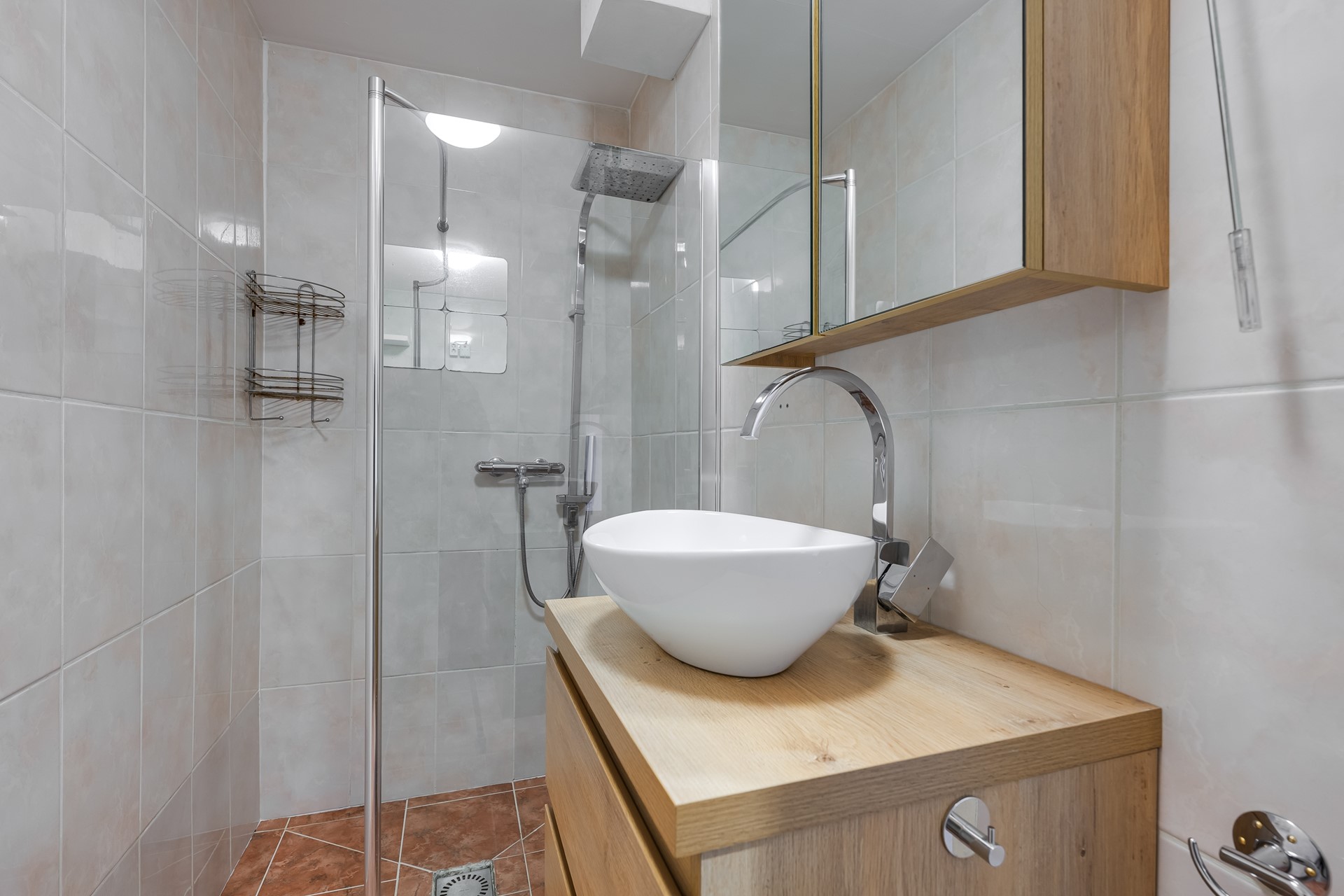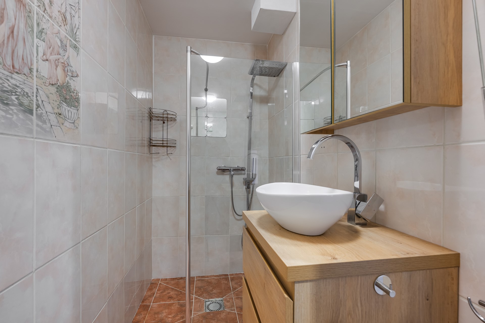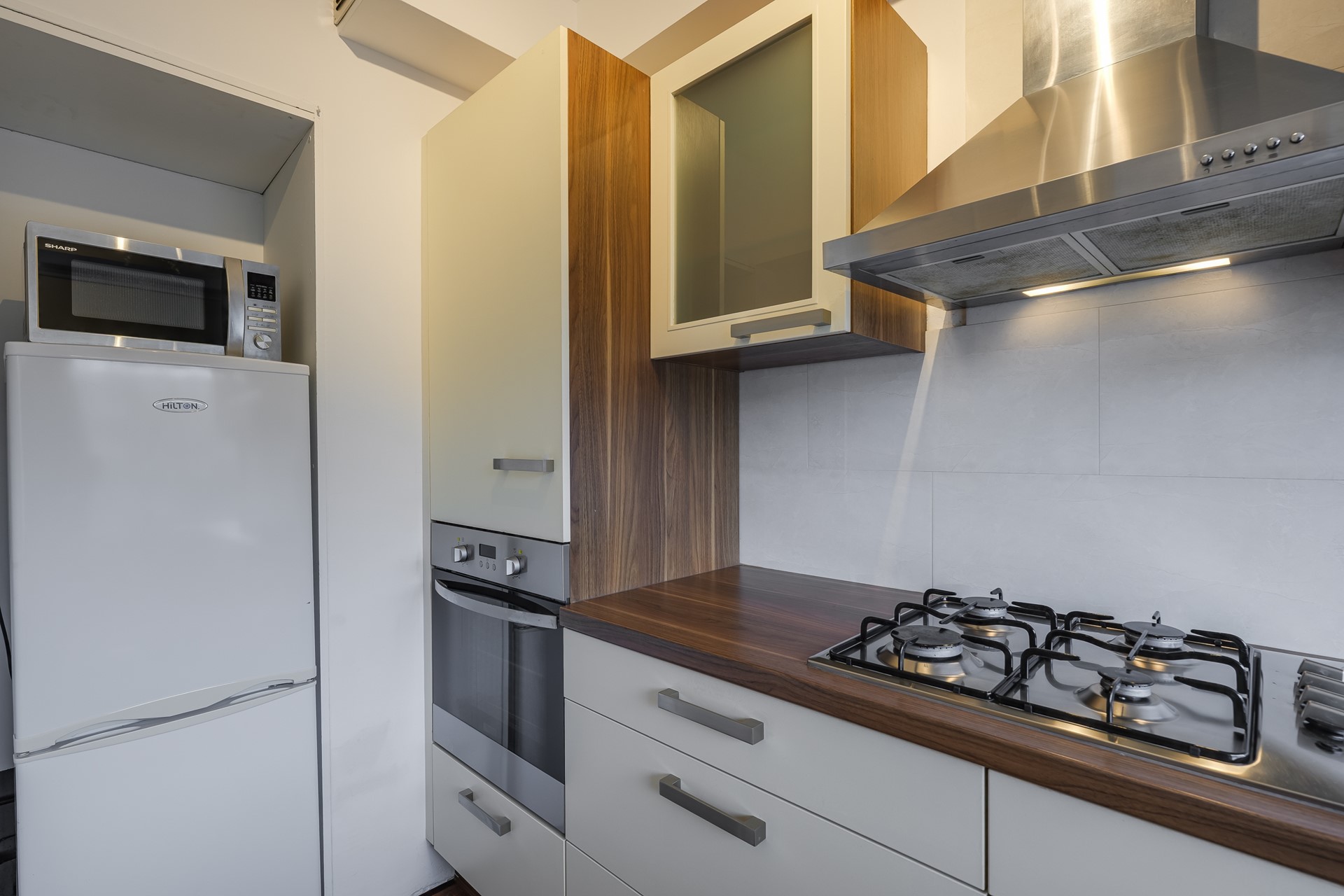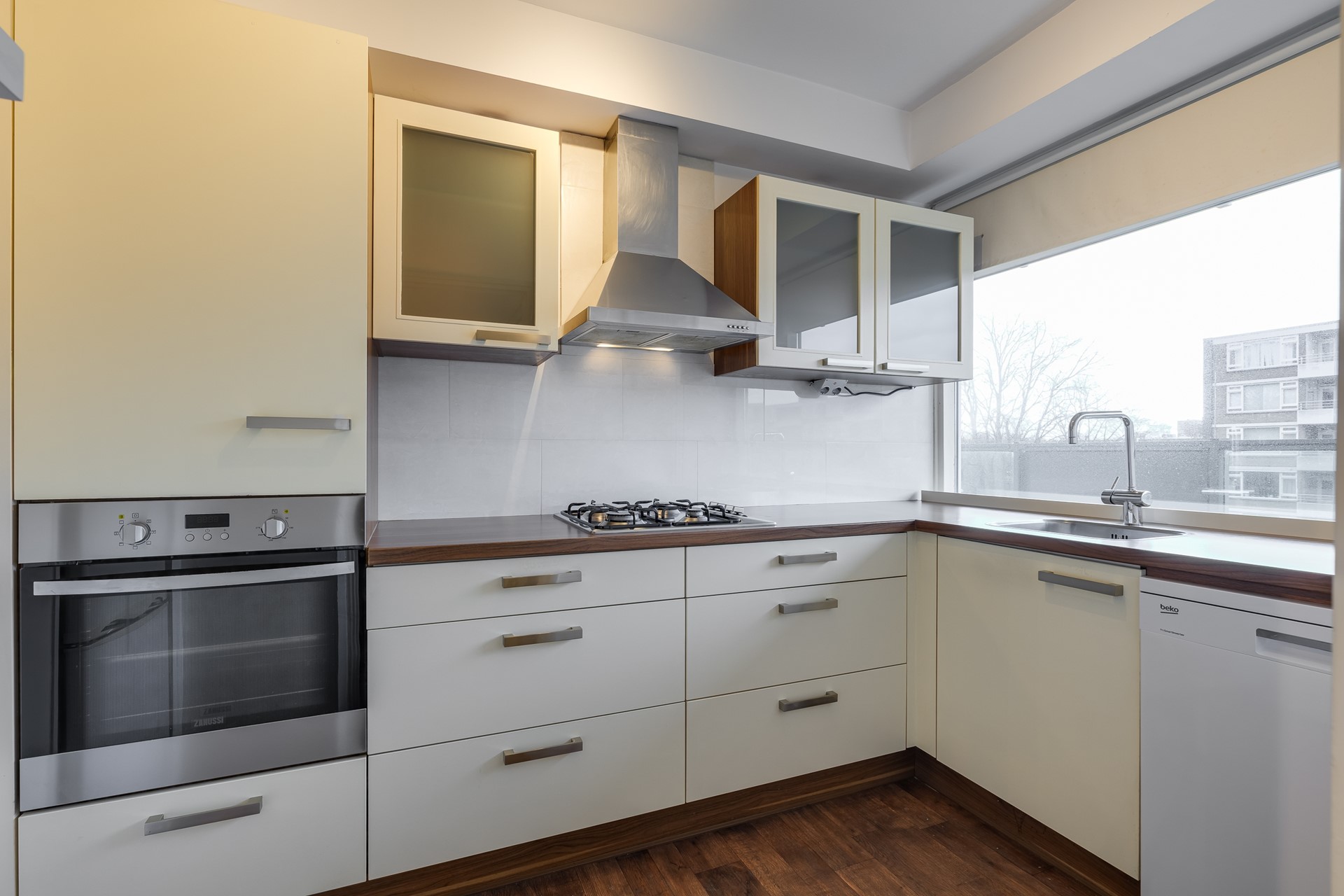 De keuken is modern en praktisch ingericht, met voldoende werkruimte en kastruimte en prettig daglicht. De badkamer is netjes afgewerkt en voorzien van een inloopdouche, wastafelmeubel en aansluitingen voor wasmachine en droger. Het toilet is separaat en strak uitgevoerd.