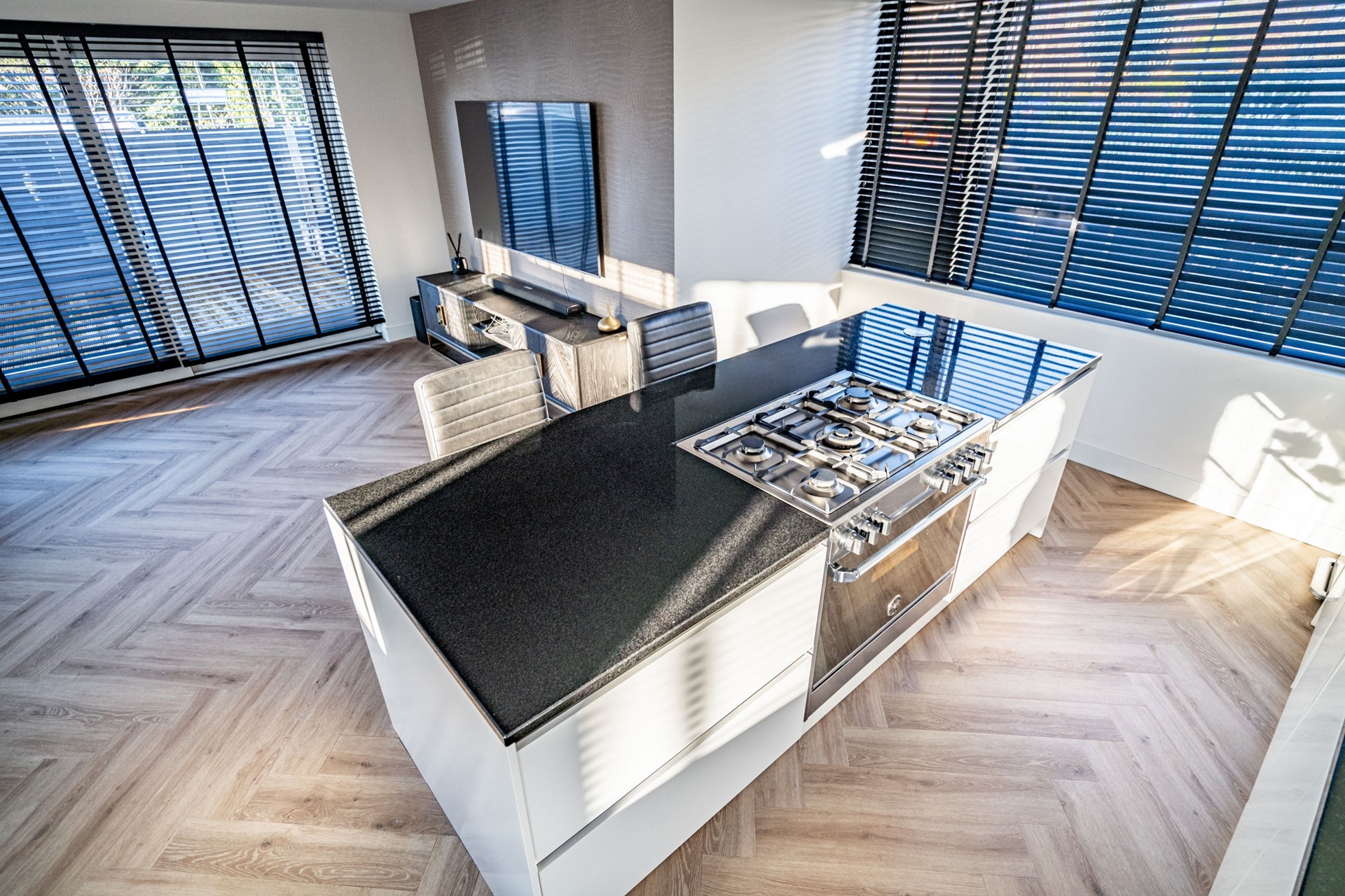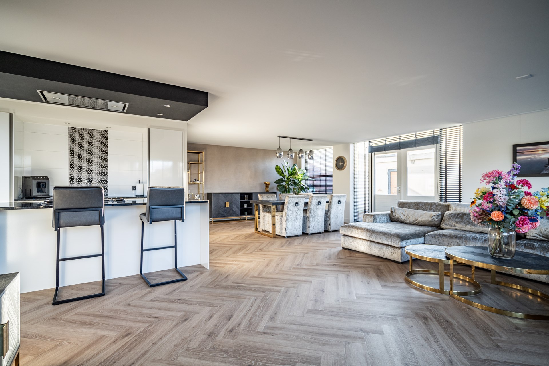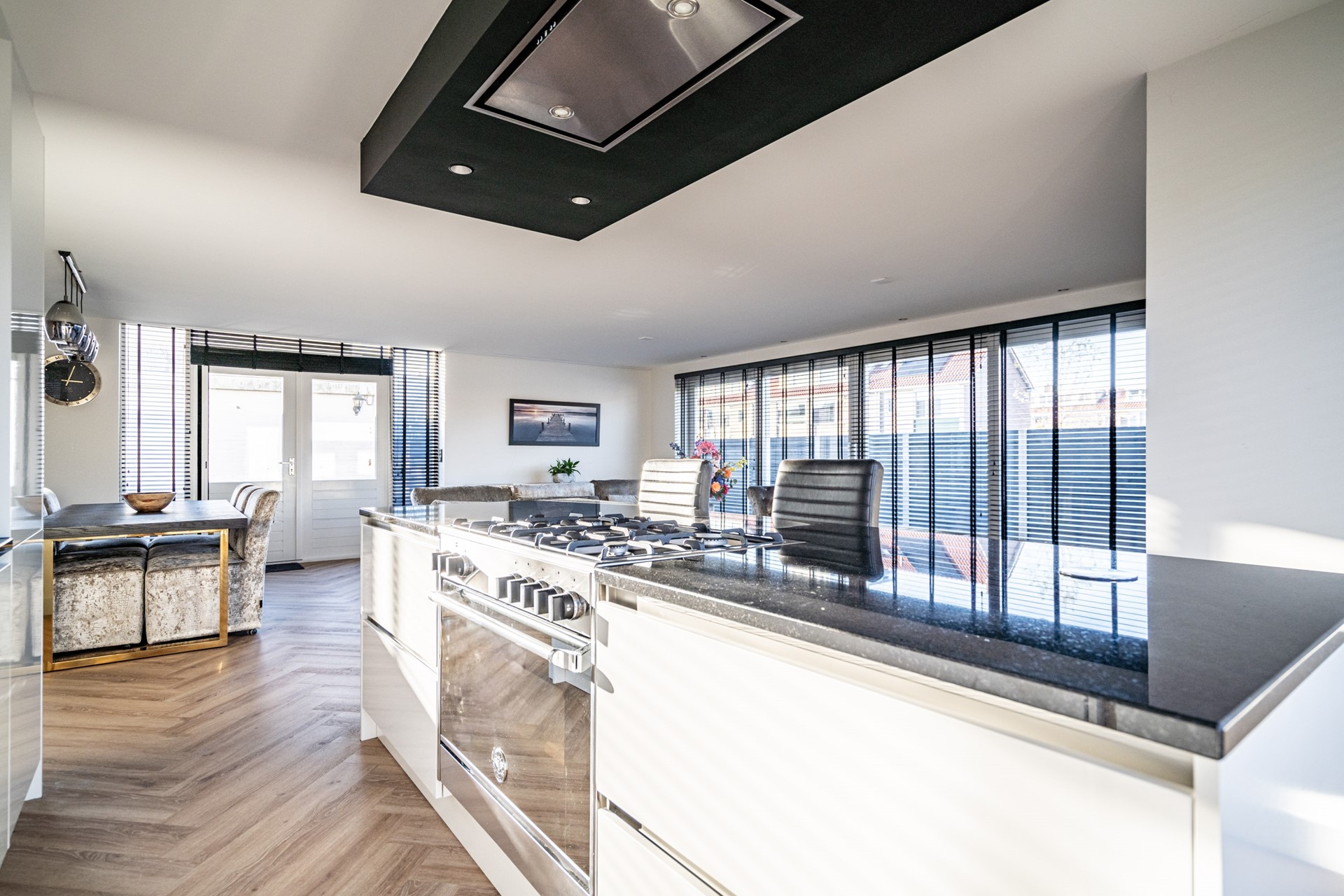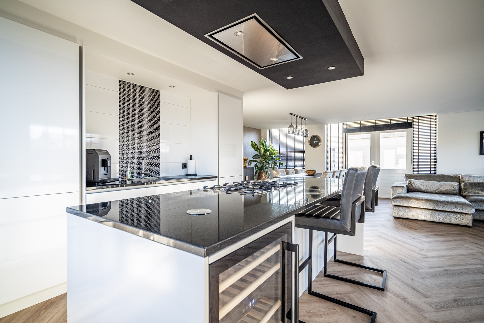 De keuken vormt het hart van de woning en is uitgevoerd in een luxe, moderne stijl met kookeiland en hoogwaardige inbouwapparatuur. De keuken beschikt over een wijnkoeler, 5-pits gasfornuis met oven, koelkast, vriezer, vaatwasser, wasbak en een geïntegreerde afzuigkap. Het geheel straalt klasse en comfort uit, perfect voor wie van koken en gezelligheid houdt.