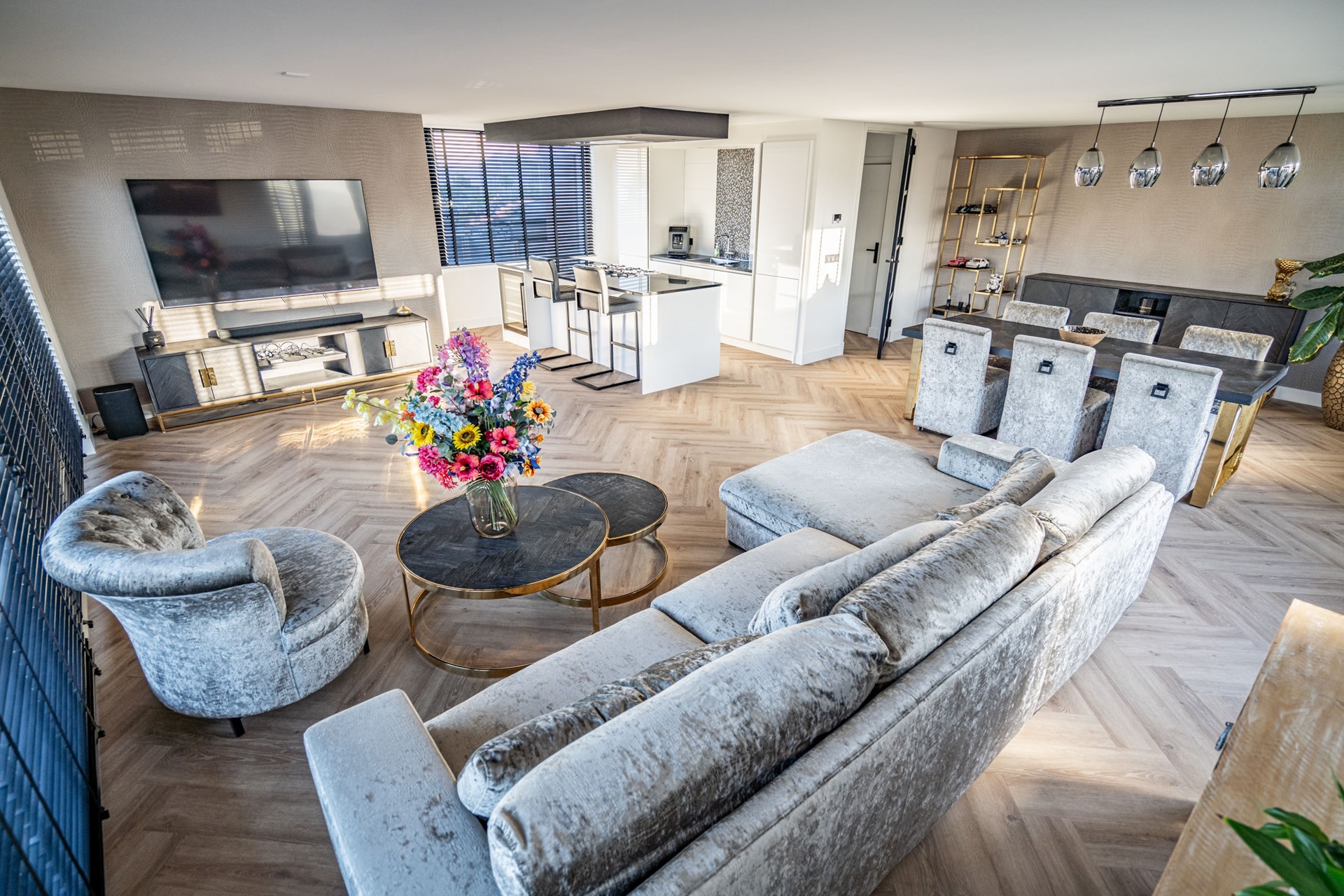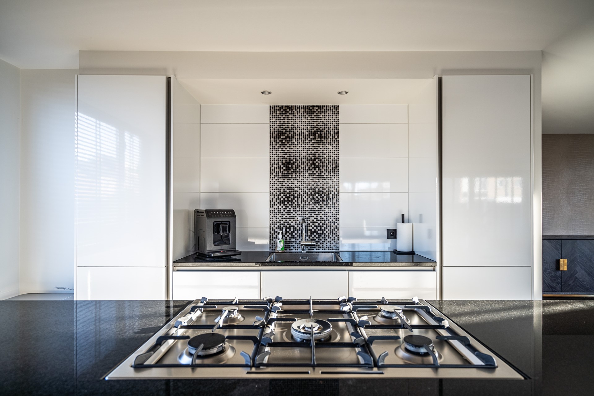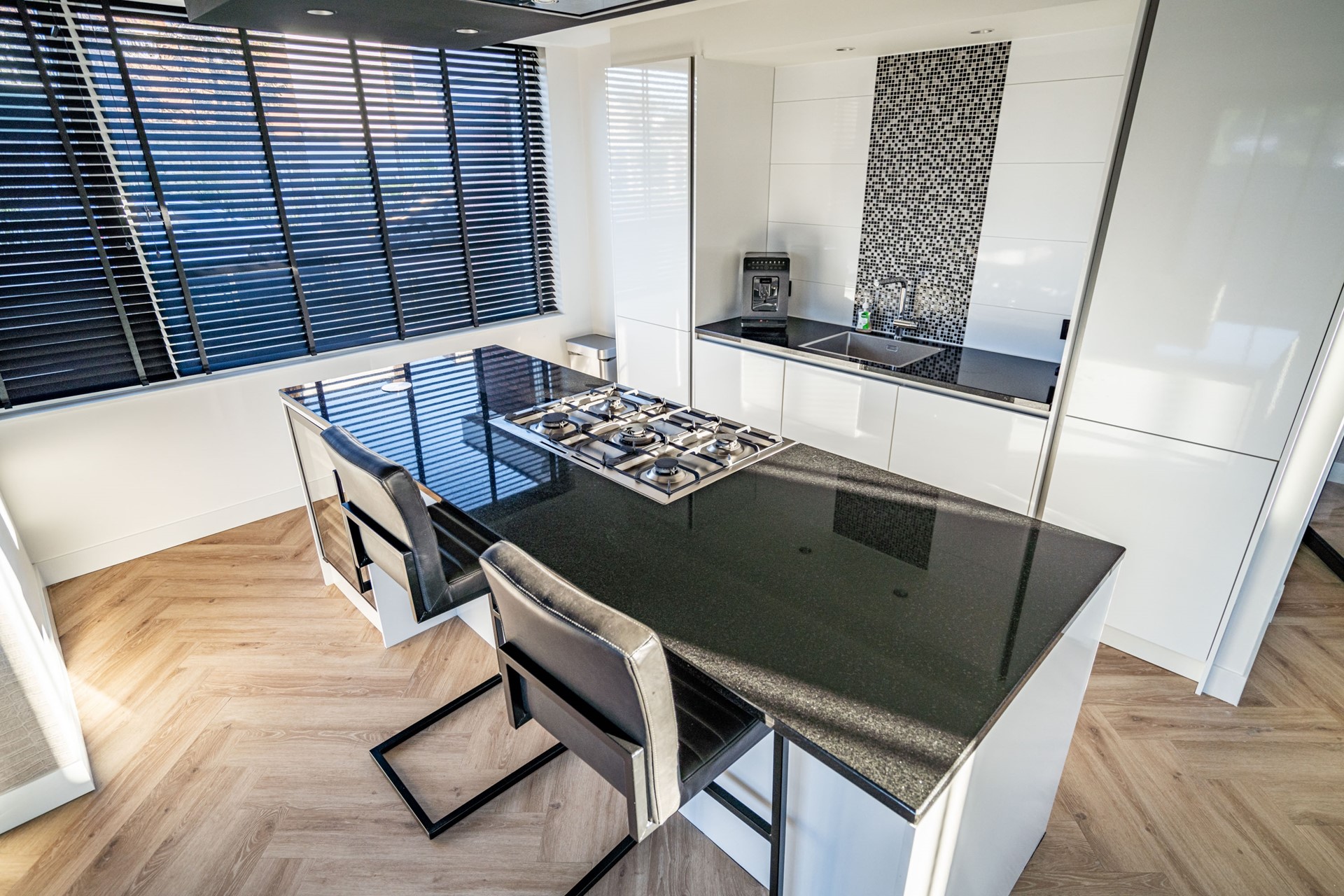 De keuken vormt het hart van de woning en is uitgevoerd in een luxe, moderne stijl met kookeiland en hoogwaardige inbouwapparatuur. De keuken beschikt over een wijnkoeler, 5-pits gasfornuis met oven, koelkast, vriezer, vaatwasser, wasbak en een geïntegreerde afzuigkap. Het geheel straalt klasse en comfort uit, perfect voor wie van koken en gezelligheid houdt.
