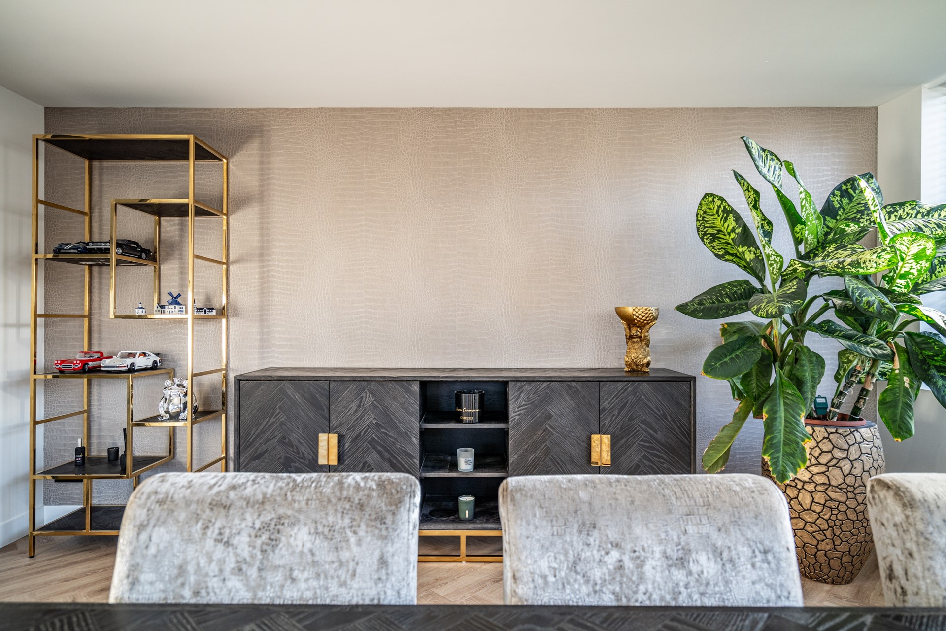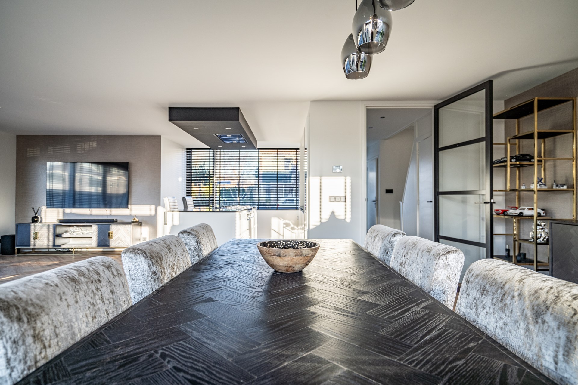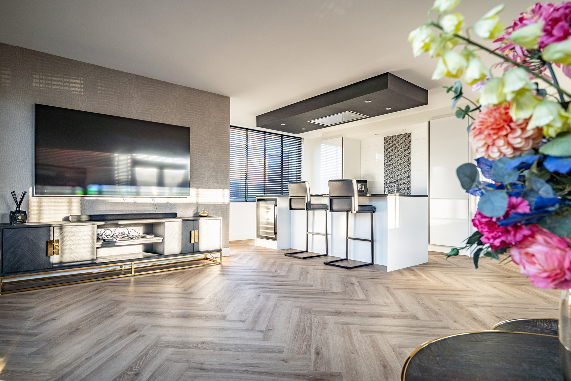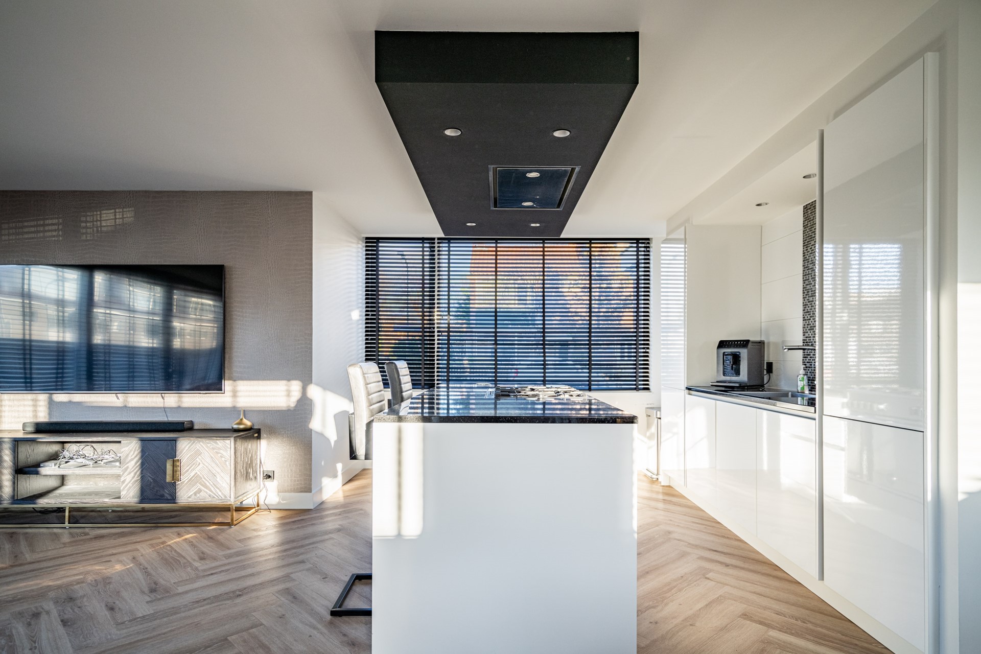 De keuken vormt het hart van de woning en is uitgevoerd in een luxe, moderne stijl met kookeiland en hoogwaardige inbouwapparatuur. De keuken beschikt over een wijnkoeler, 5-pits gasfornuis met oven, koelkast, vriezer, vaatwasser, wasbak en een geïntegreerde afzuigkap. Het geheel straalt klasse en comfort uit, perfect voor wie van koken en gezelligheid houdt.