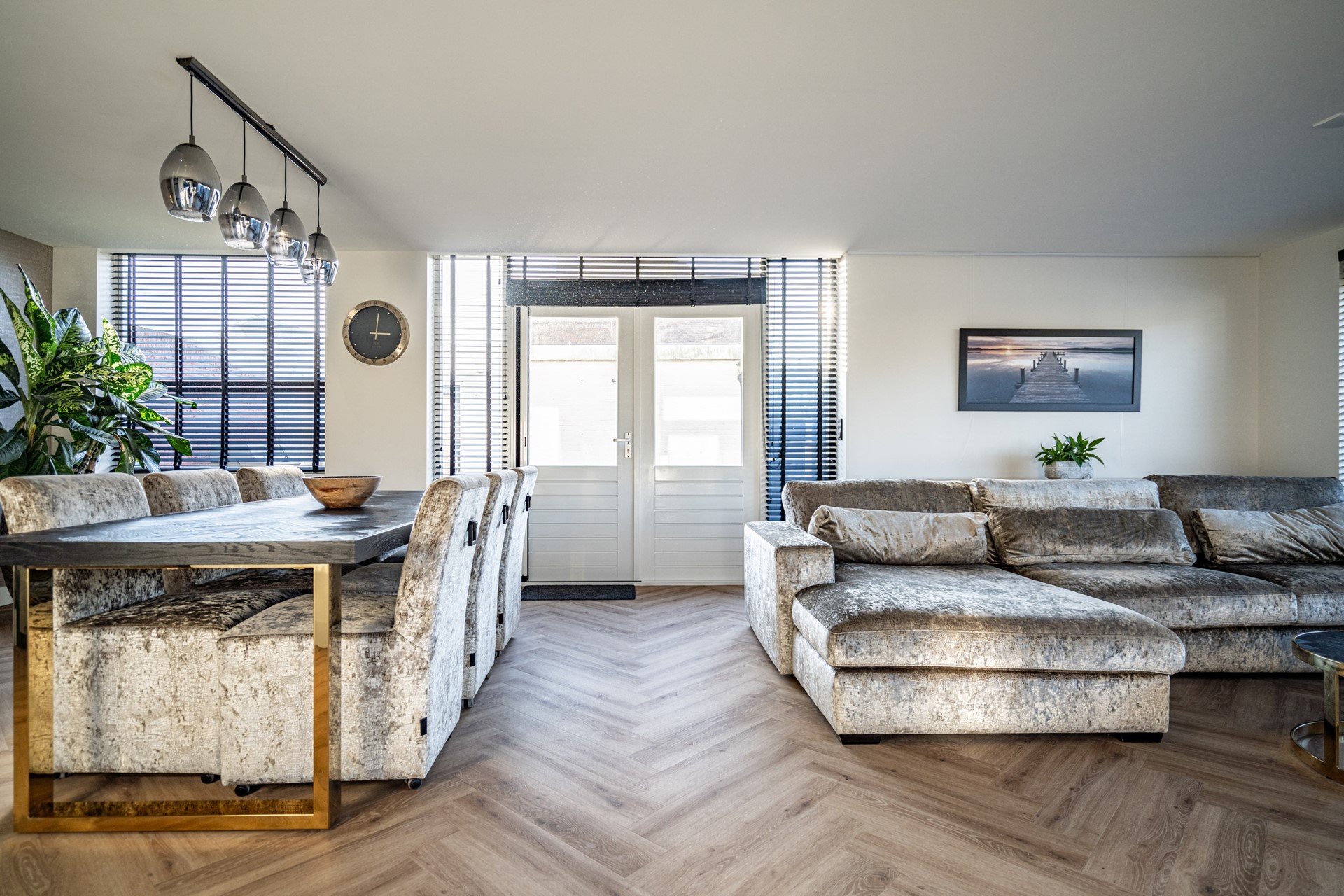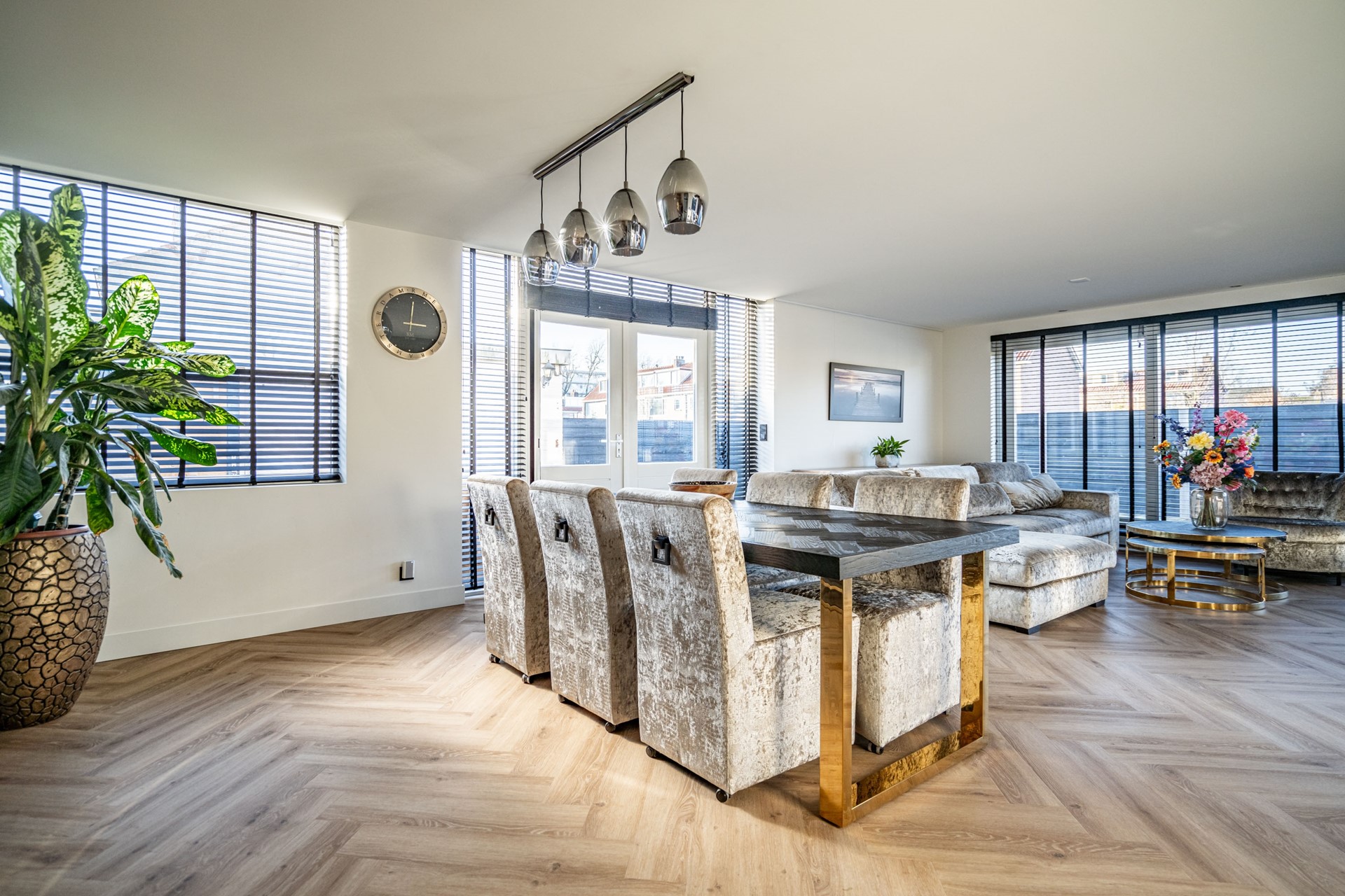 De woonkamer is royaal van formaat dankzij de recent geplaatste uitbouw en biedt een lichte, open leefruimte met een strakke afwerking. Overal ligt vloerverwarming en de grote raampartijen met nieuwe kozijnen zorgen voor veel daglicht en een prettig binnenklimaat. De woonkamer biedt via meerdere openslaande deuren directe toegang tot de tuin, die rondom de woning ligt en daardoor altijd een zonnig plekje biedt.