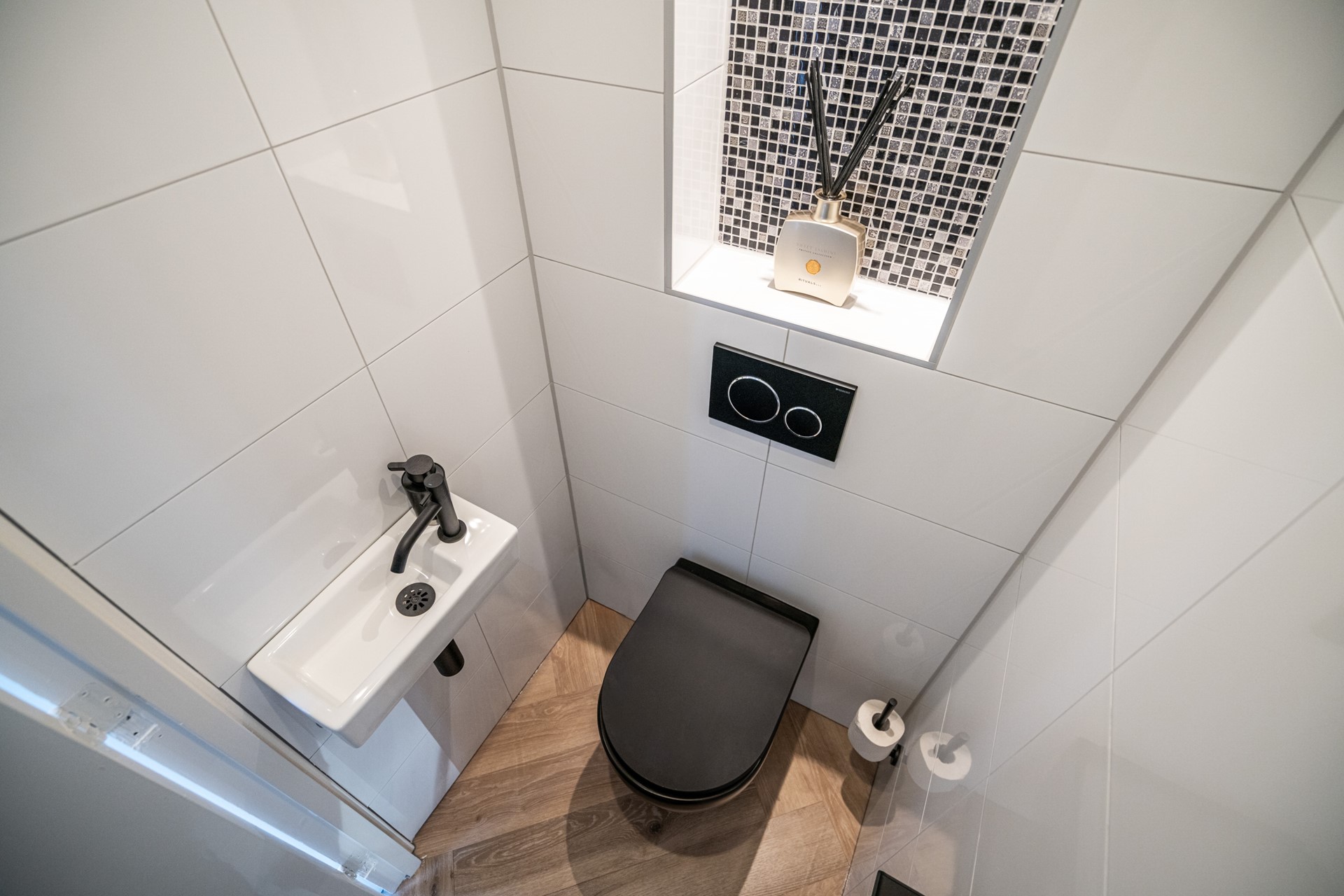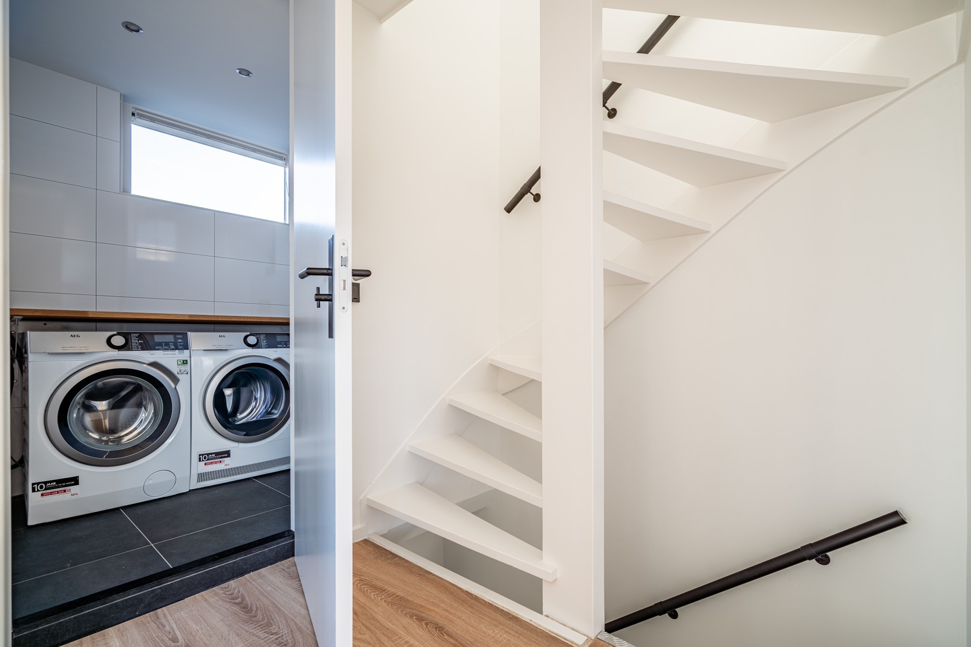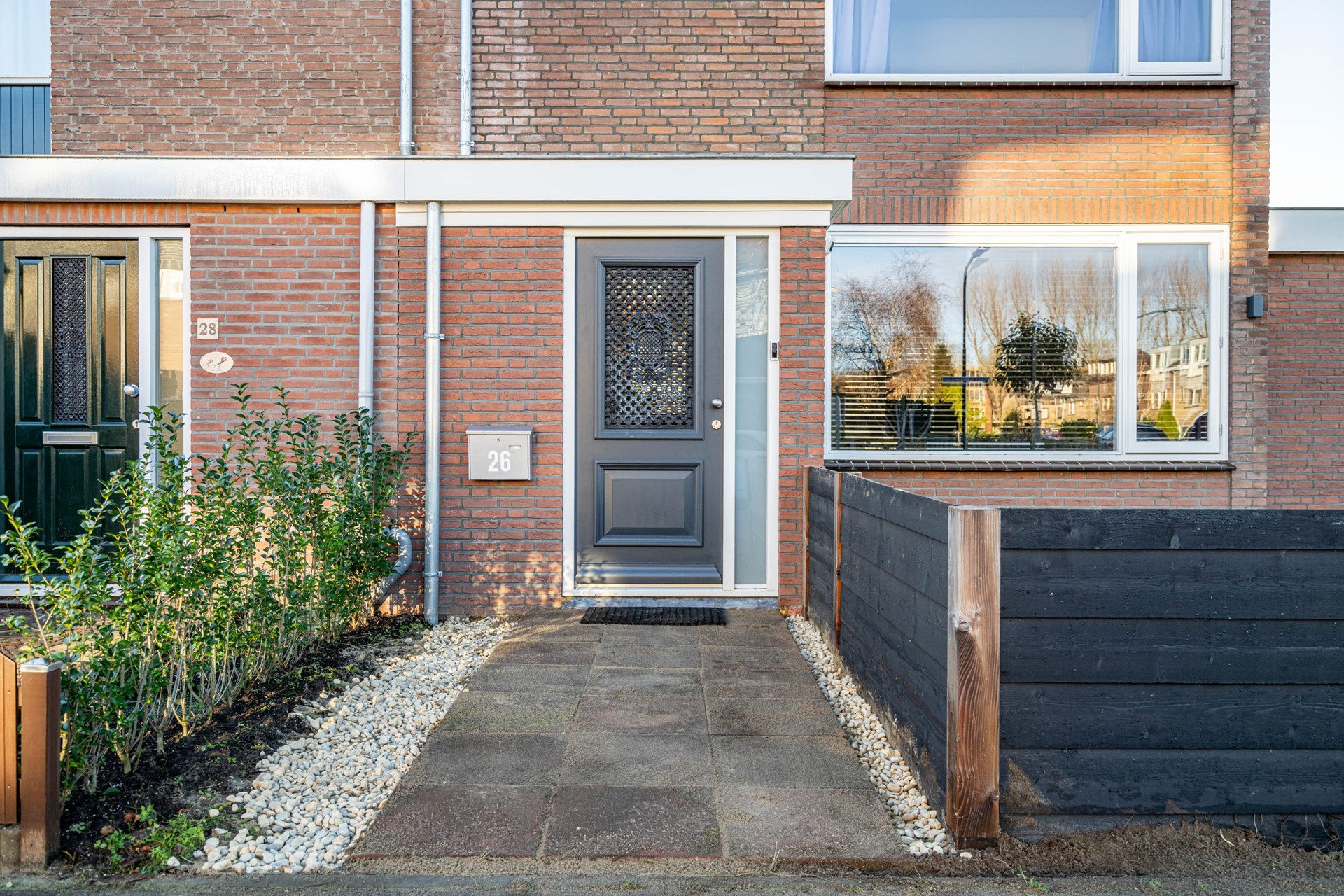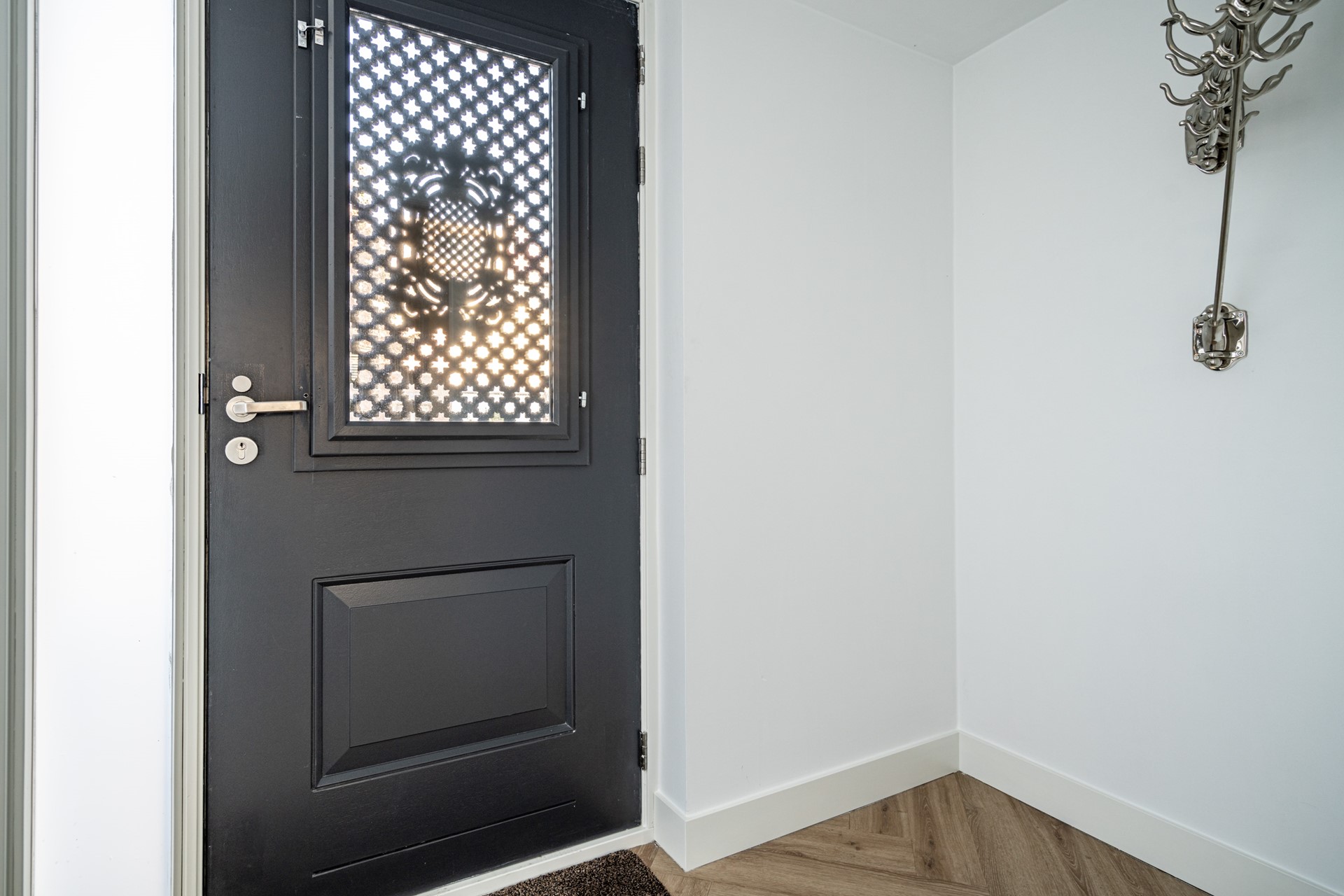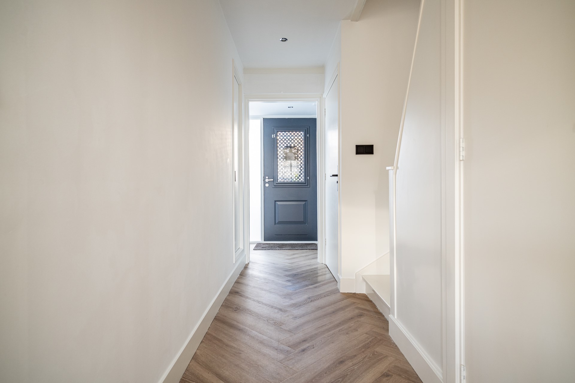 Via de ruime voortuin bereikt u de voordeur. U komt binnen in de hal, waar zich de vernieuwde meterkast bevindt en het moderne, zwevende toilet met fontein.