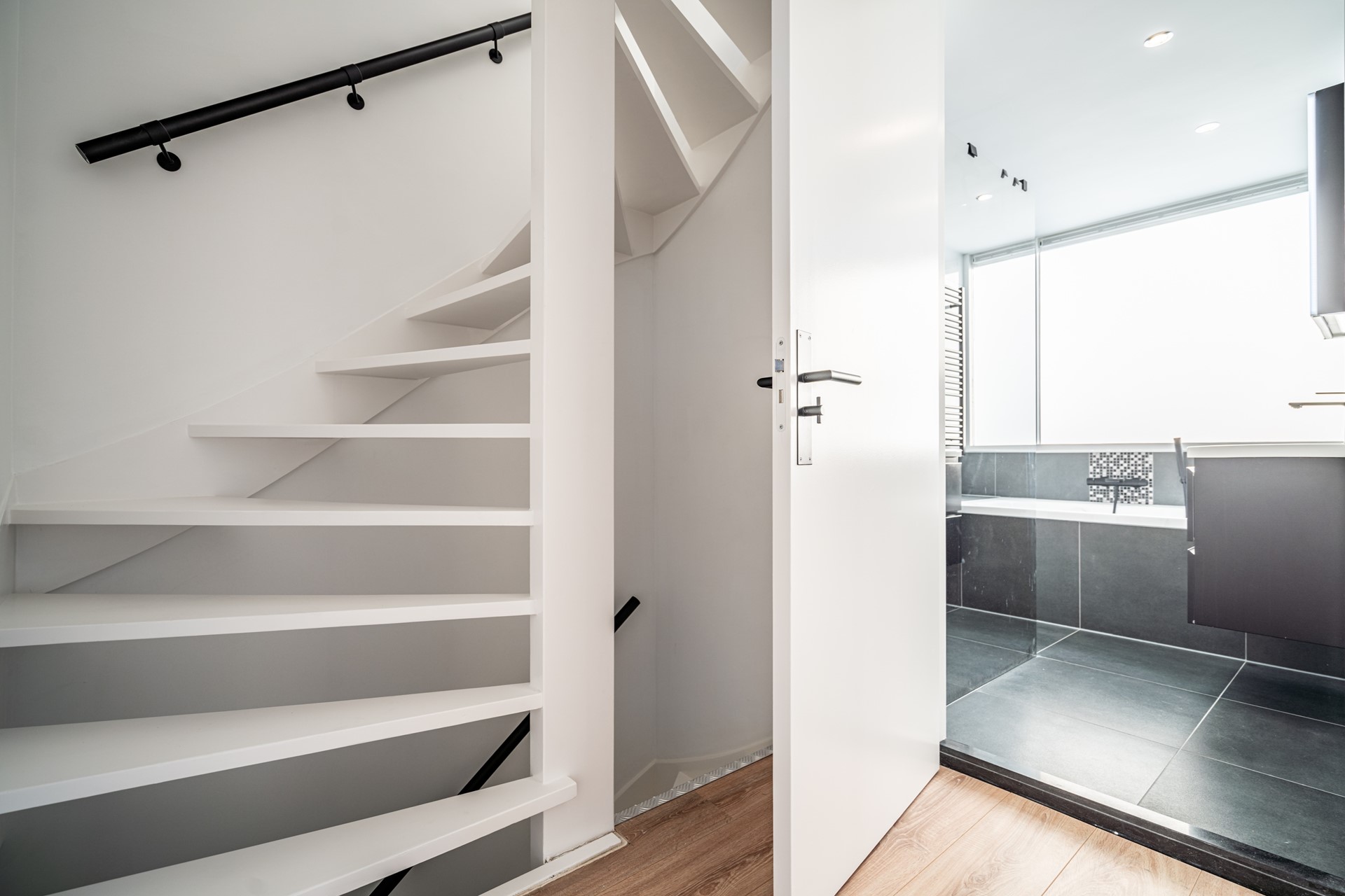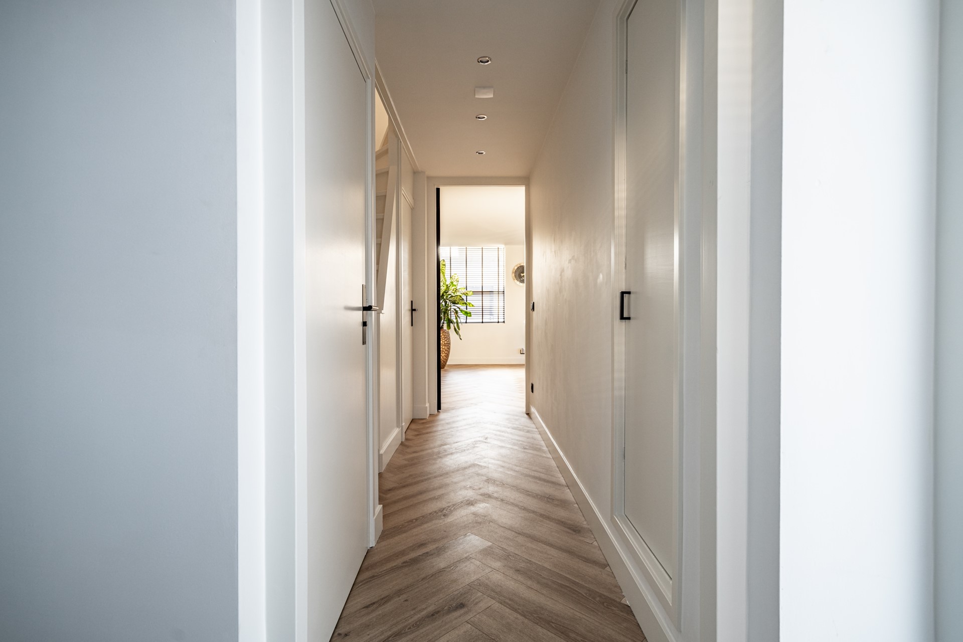 Op de eerste verdieping bevinden zich twee ruime slaapkamers, waar voorheen drie kamers waren. Door het samenvoegen van ruimtes is een royale en lichte badkamer ontstaan. Deze is geheel vernieuwd en voorzien van een ligbad, inloopdouche en stijlvol wastafelmeubel. De afwerking en gebruikte materialen geven de verdieping een luxe uitstraling.