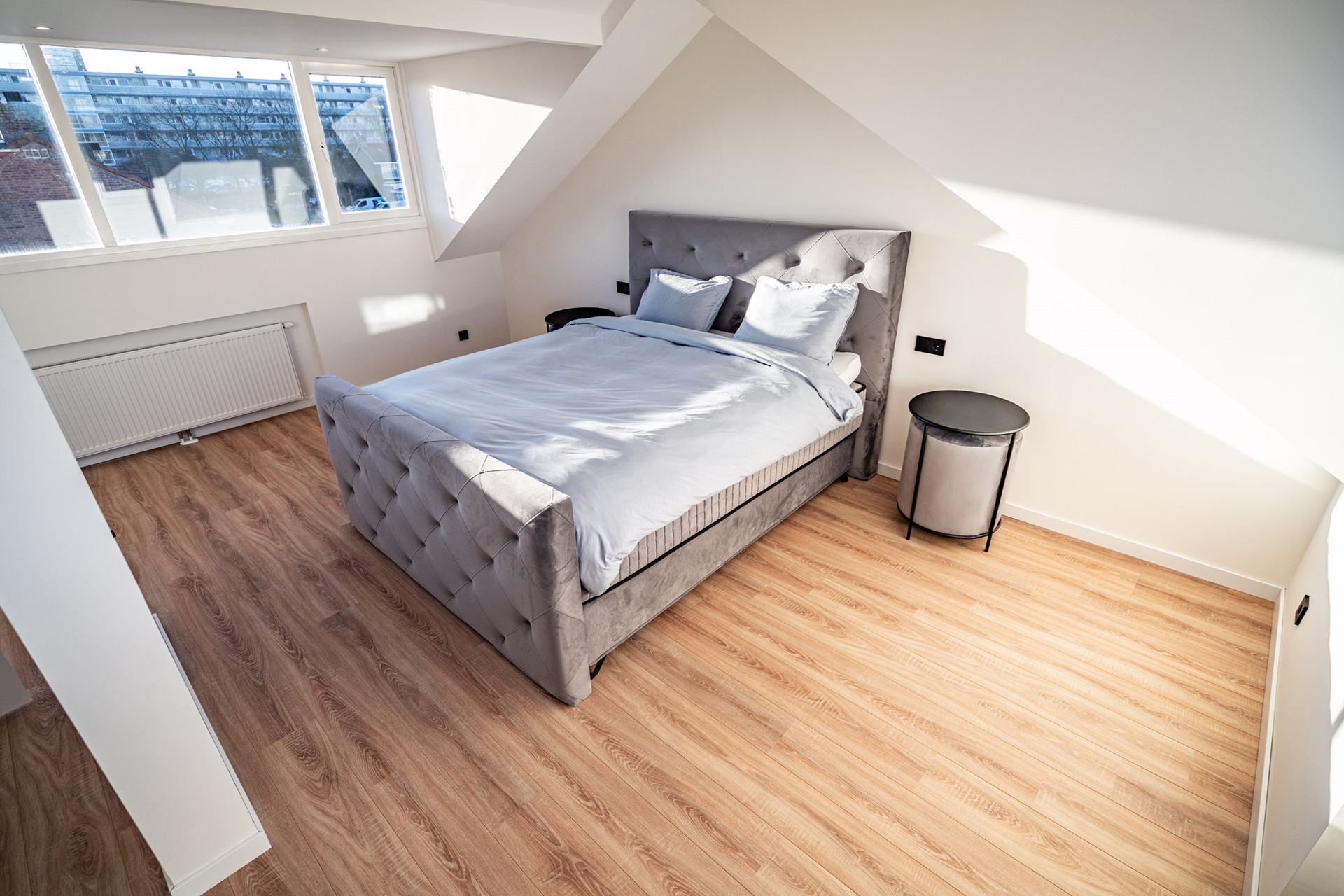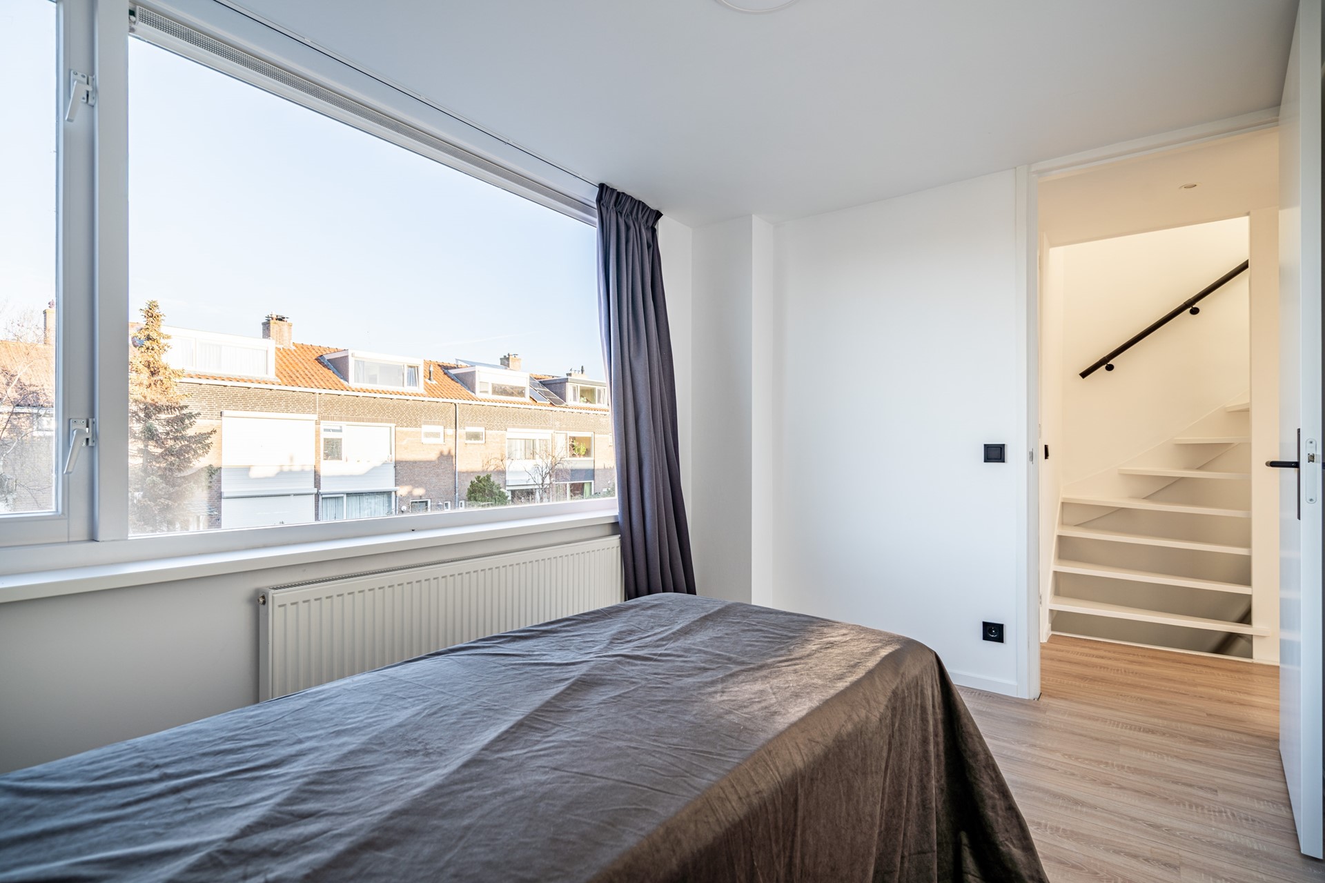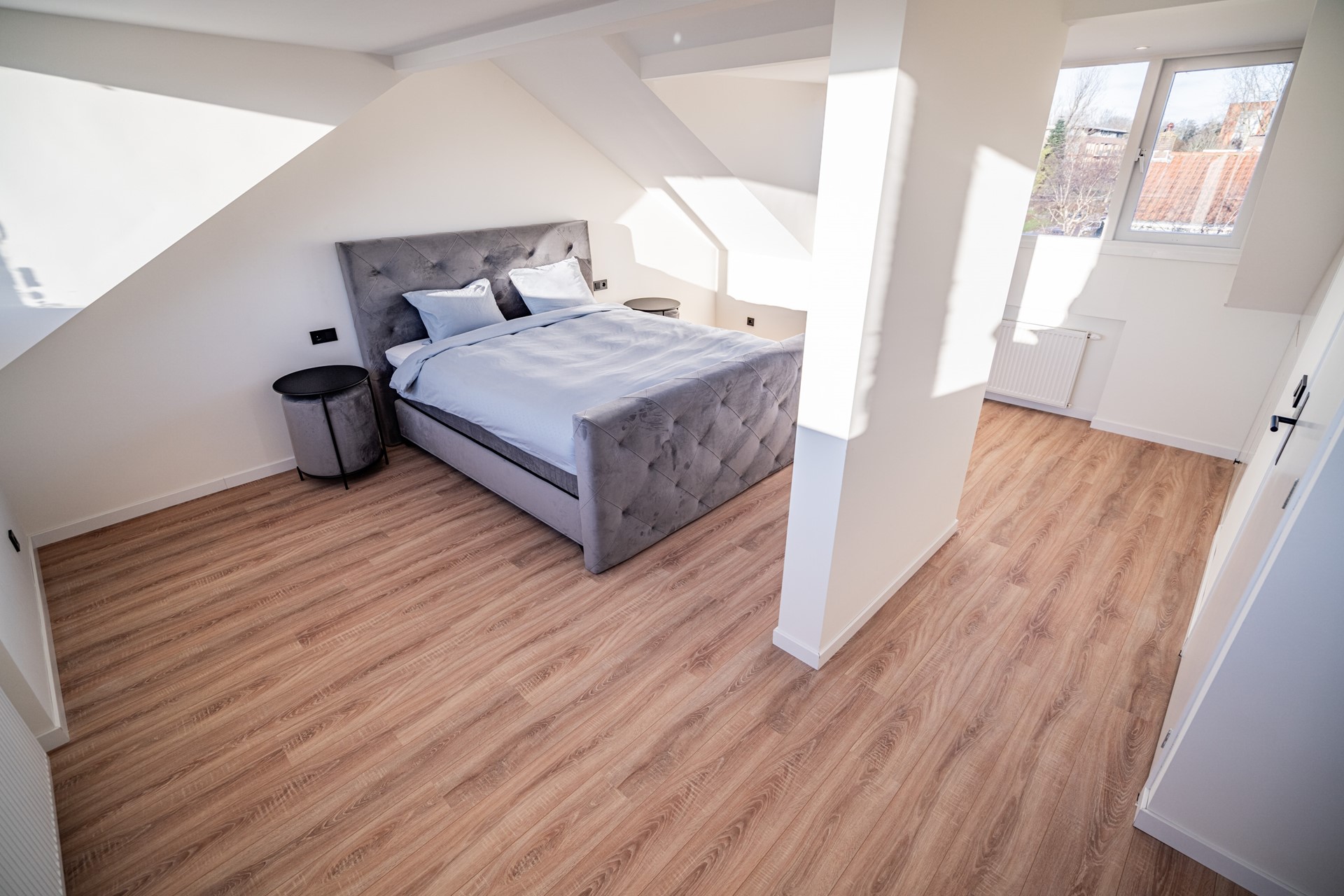 De tweede verdieping is bereikbaar via een vaste trap en is vergroot met twee dakkapellen, waardoor hier een ruime en lichte master bedroom is gerealiseerd. Indien gewenst kan deze verdieping eenvoudig worden opgesplitst in twee aparte slaapkamers. Ook hier is de afwerking recent vernieuwd en volledig in lijn met de rest van de woning.
