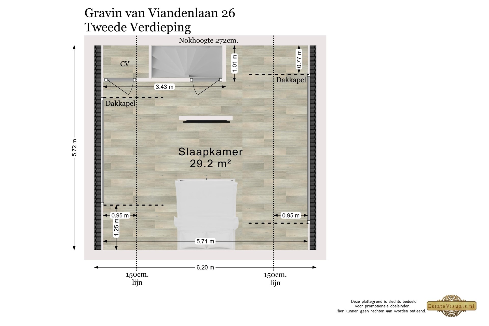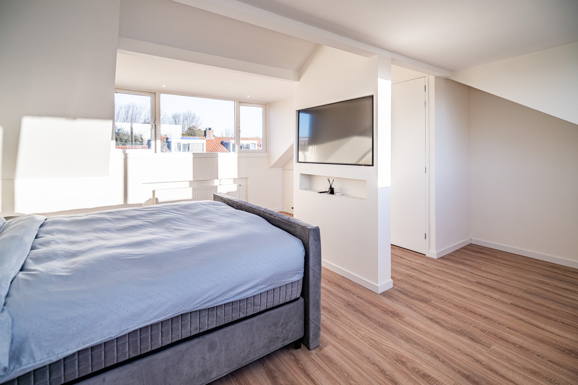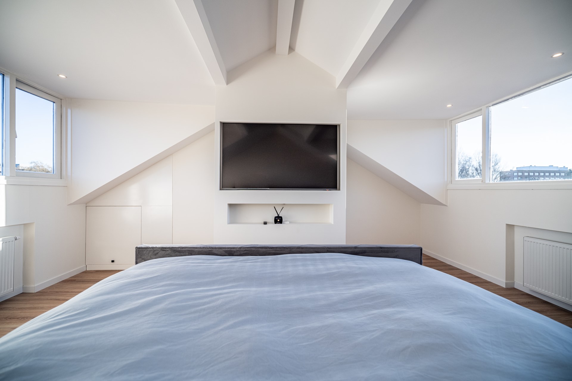 De tweede verdieping is bereikbaar via een vaste trap en is vergroot met twee dakkapellen, waardoor hier een ruime en lichte master bedroom is gerealiseerd. Indien gewenst kan deze verdieping eenvoudig worden opgesplitst in twee aparte slaapkamers. Ook hier is de afwerking recent vernieuwd en volledig in lijn met de rest van de woning.