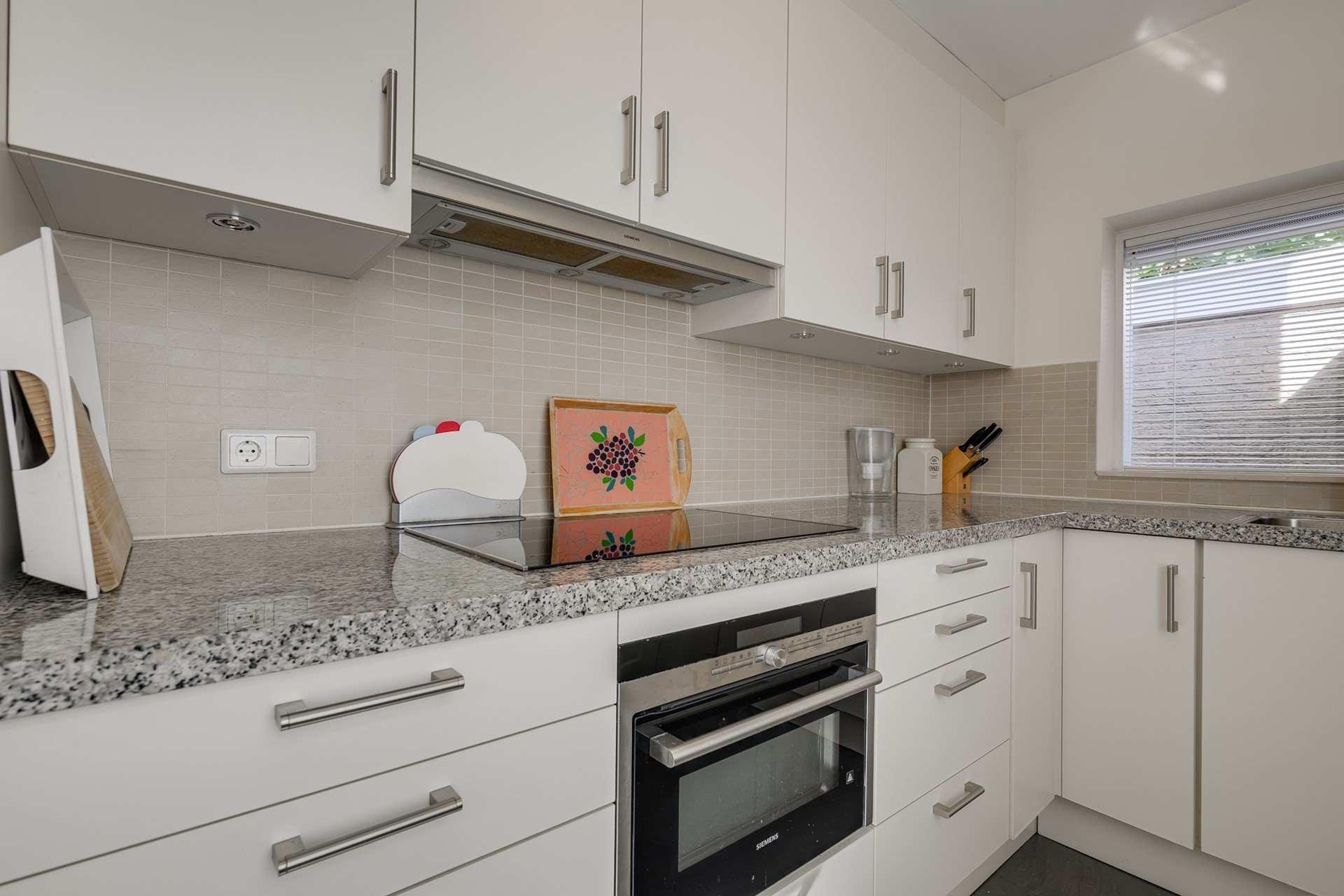 Entrance with hall, toilet and staircase. Bright and spacious living room with French doors opening onto the garden. Modern kitchen with built-in appliances, adjoining utility room with laundry setup and extra storage. From here, direct access to the integrated garage.