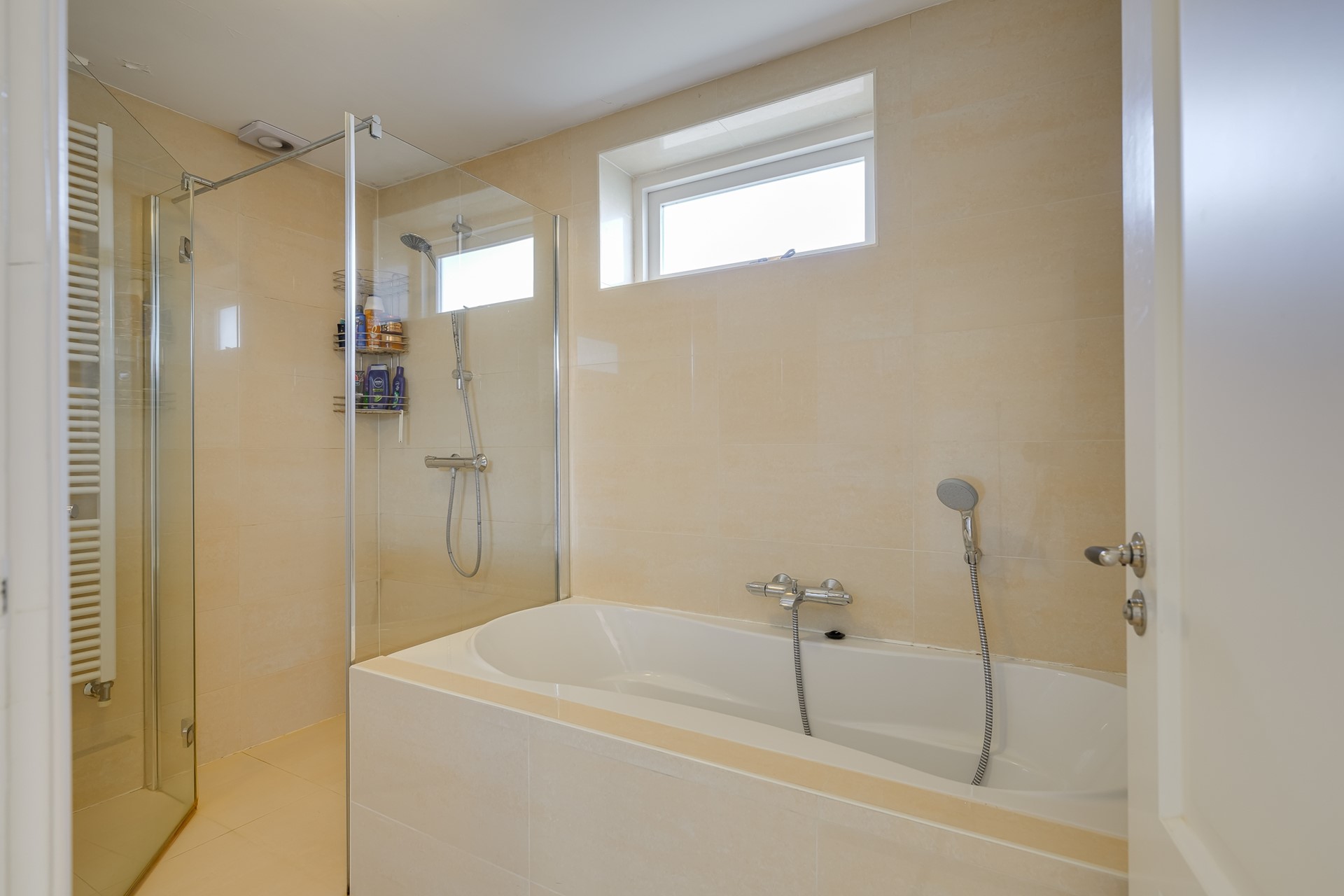 Overloop, drie ruime slaapkamers. Luxe badkamer met ligbad, inloopdouche, dubbele wastafel en designradiator. Separaat toilet op de overloop.