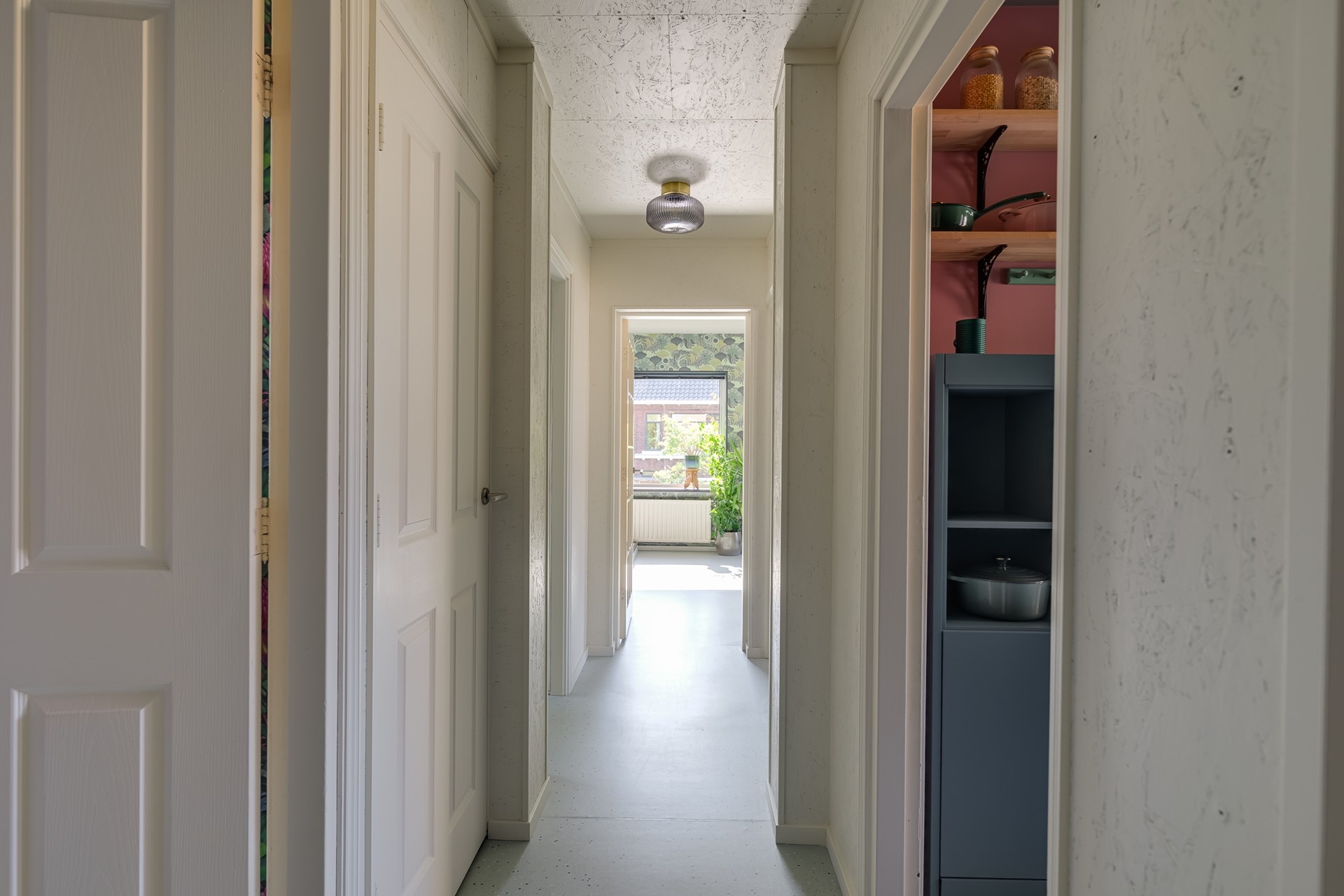 Zodra je de gezamenlijke entree binnenstapt, merk je dat dit een goed onderhouden complex is. Via de trap bereik je het appartement op de eerste verdieping, waar je bij binnenkomst direct wordt verrast door de speelse lichtinval. De gang verbindt alle ruimtes met elkaar en geeft een gevoel van rust en overzicht.