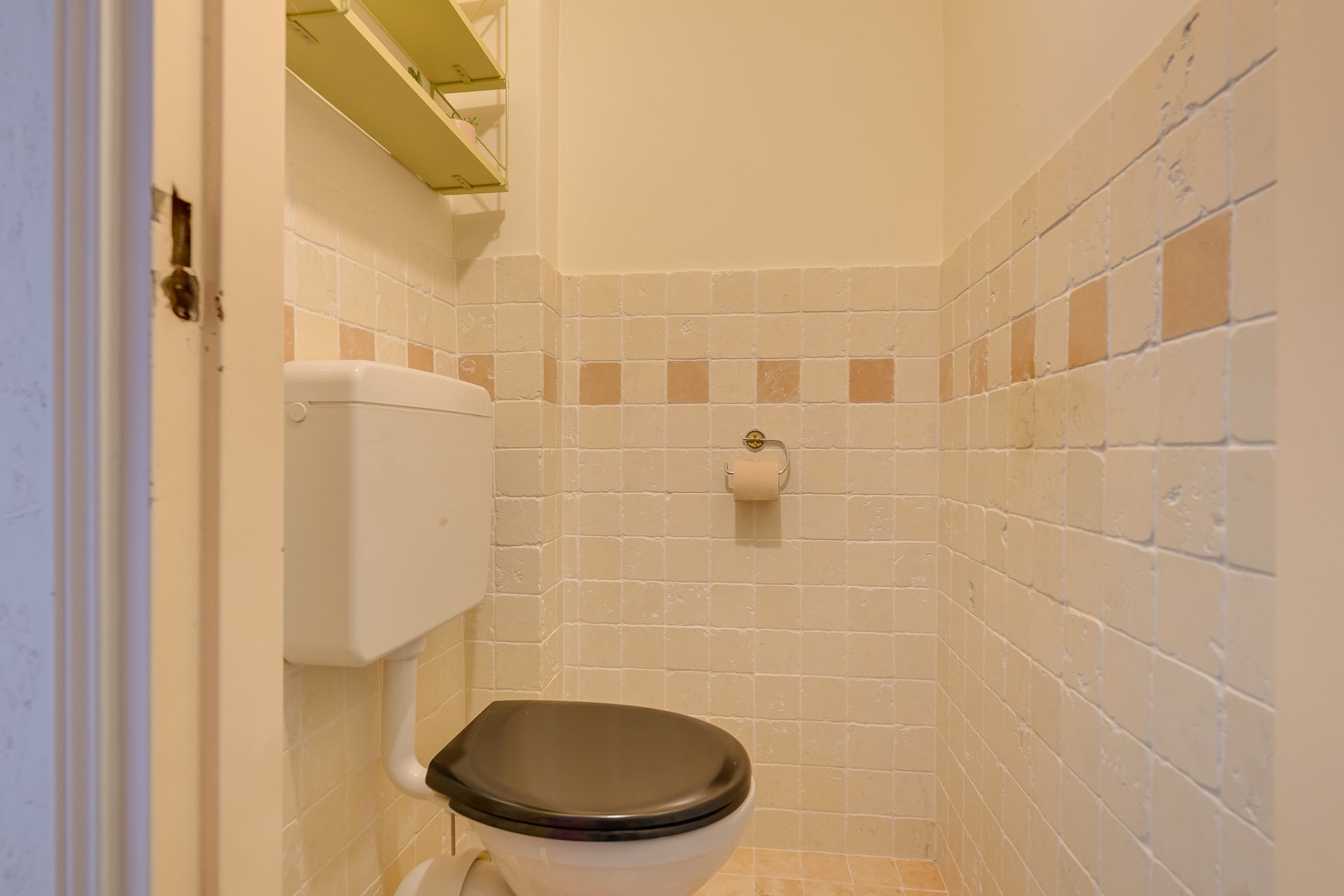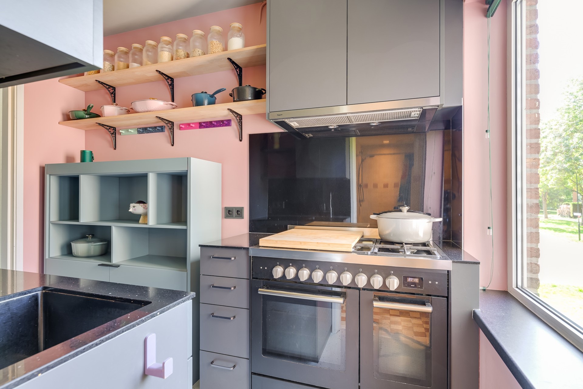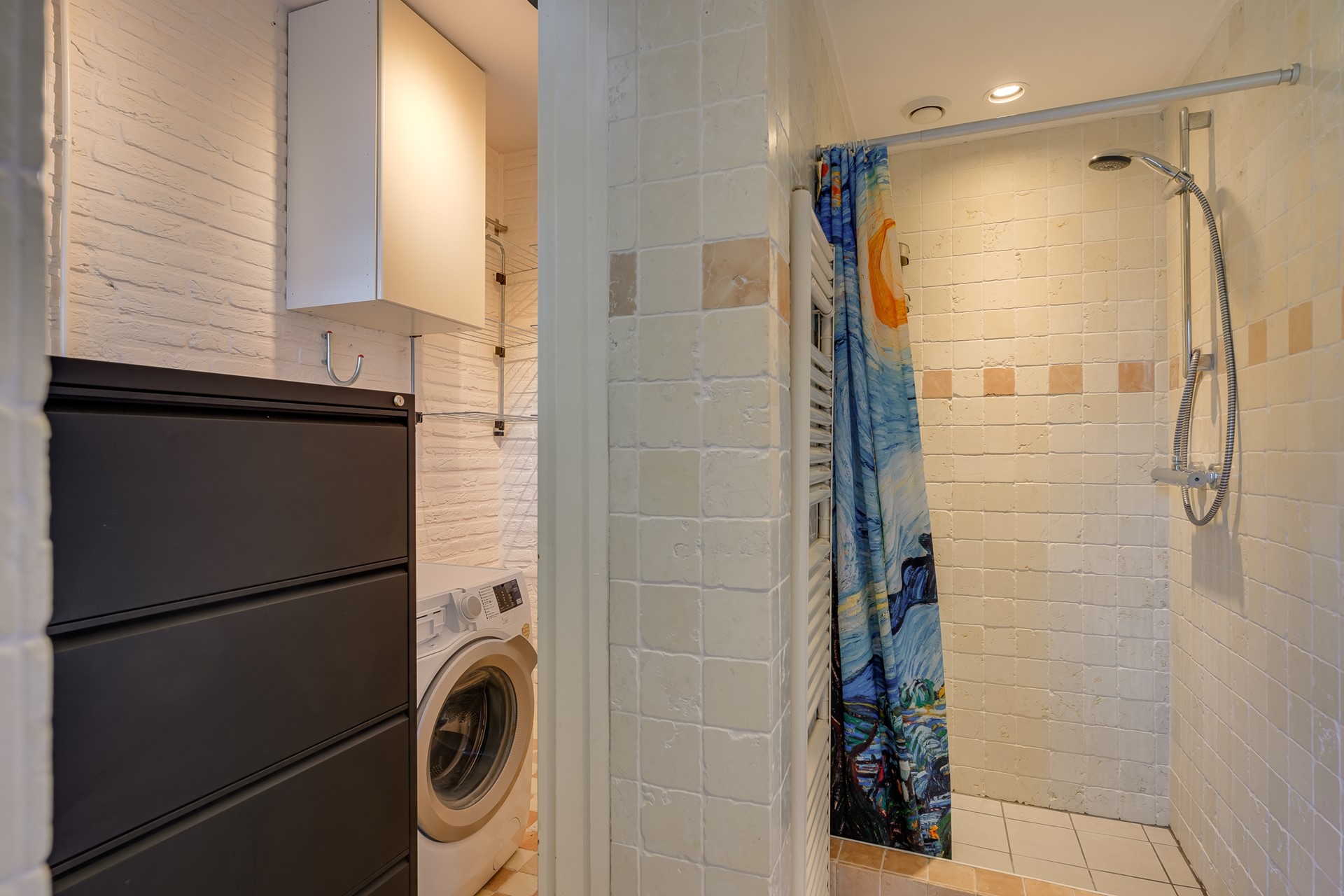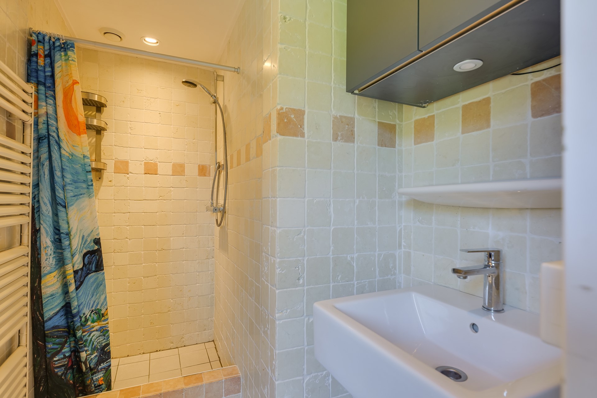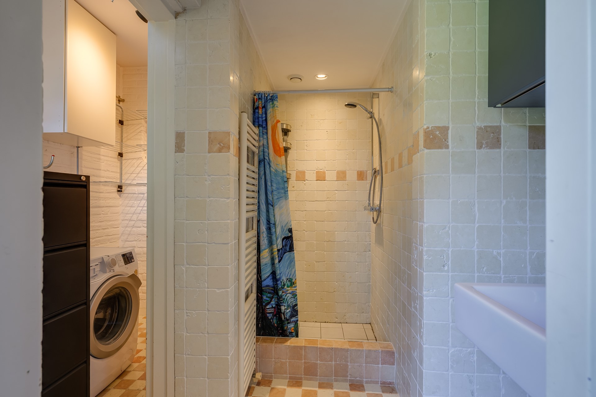 Aan de achterzijde vind je de keuken, modern en praktisch ingericht in een parallelopstelling. Denk aan een vaatwasser, koel-vriescombinatie en een los gasfornuis met maar liefst vijf pitten, wokbrander én een dubbele oven – ideaal voor kookliefhebbers die graag uitgebreid tafelen. De tegels geven de keuken en de aangrenzende badkamer een stijlvolle touch. De badkamer is compact maar compleet, met een douche, wastafel en handdoekradiator.