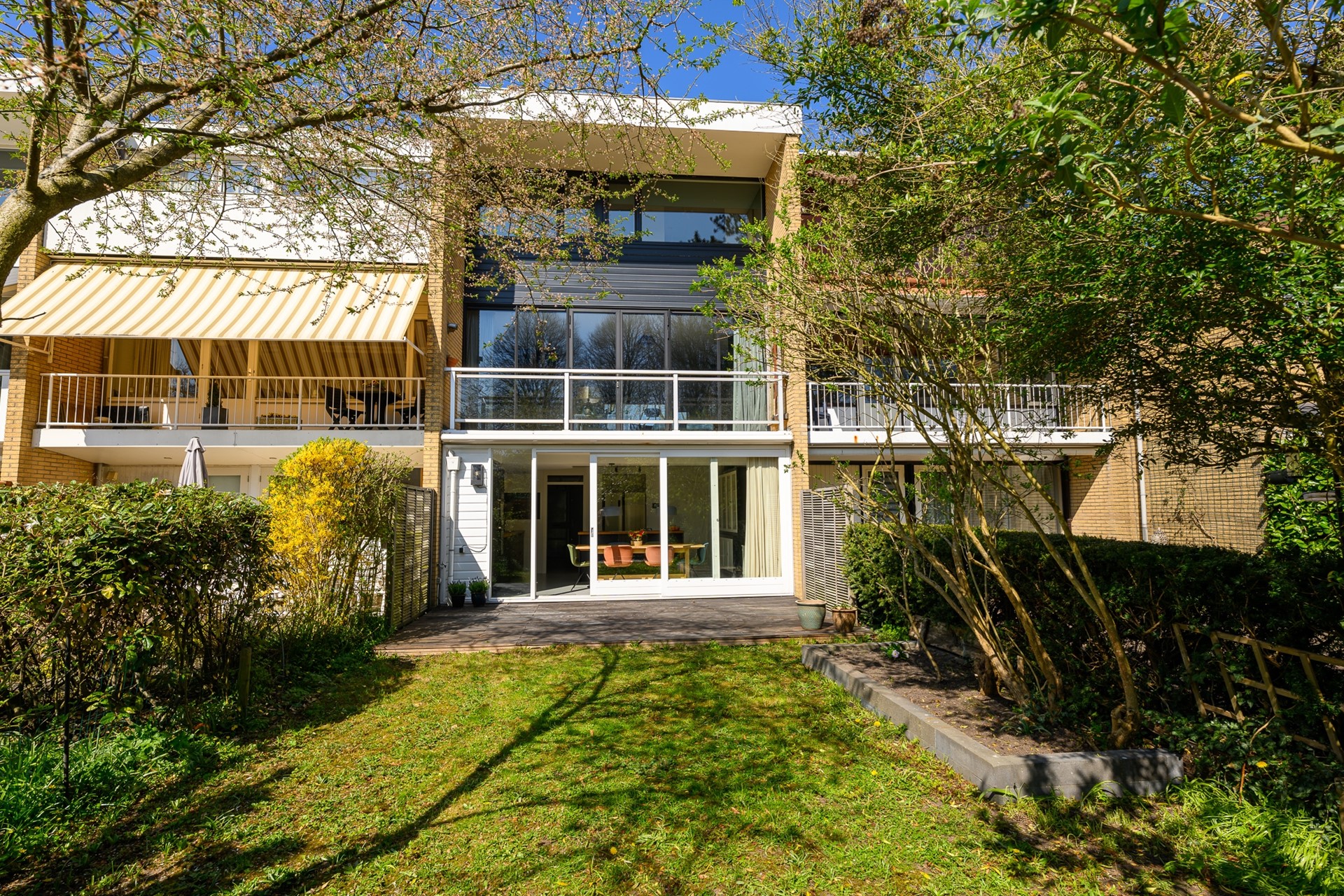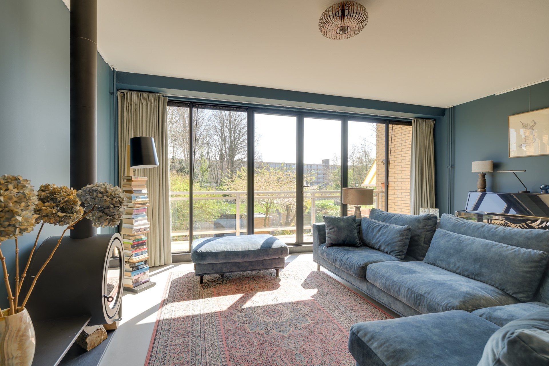 Eyecatcher: stijlvolle open haard in de lichte living met uitzicht op het park