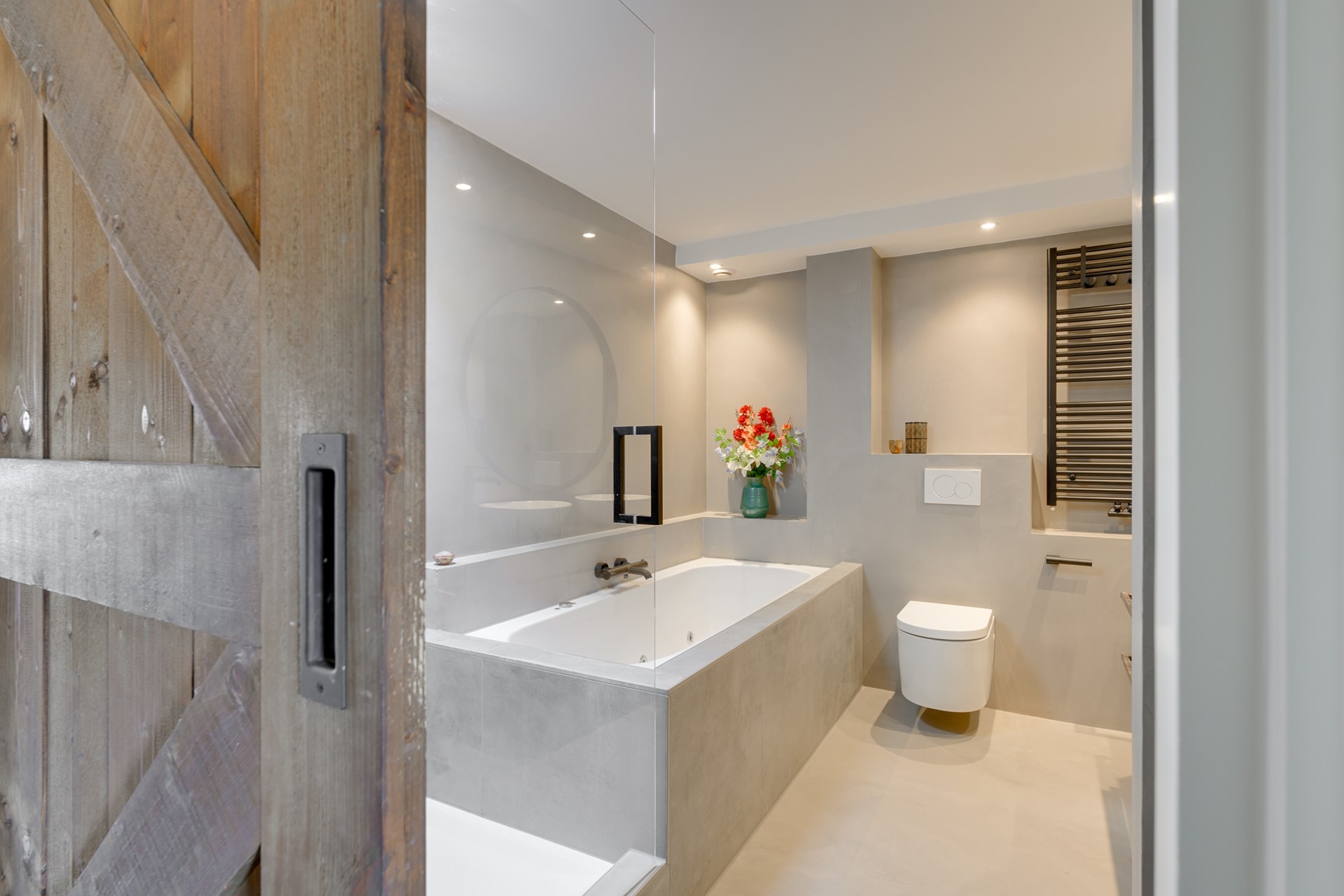 De badkamer? Modern, strak en luxueus. Een fijne inloopdouche voor de doordeweekse haast, een royaal ligbad voor de zondagochtend. Met dubbele wastafel, stijlvolle kranen en een hangtoilet is dit de plek waar je 's ochtends relaxed opstart en ’s avonds tot rust komt.