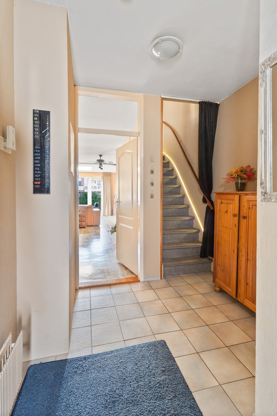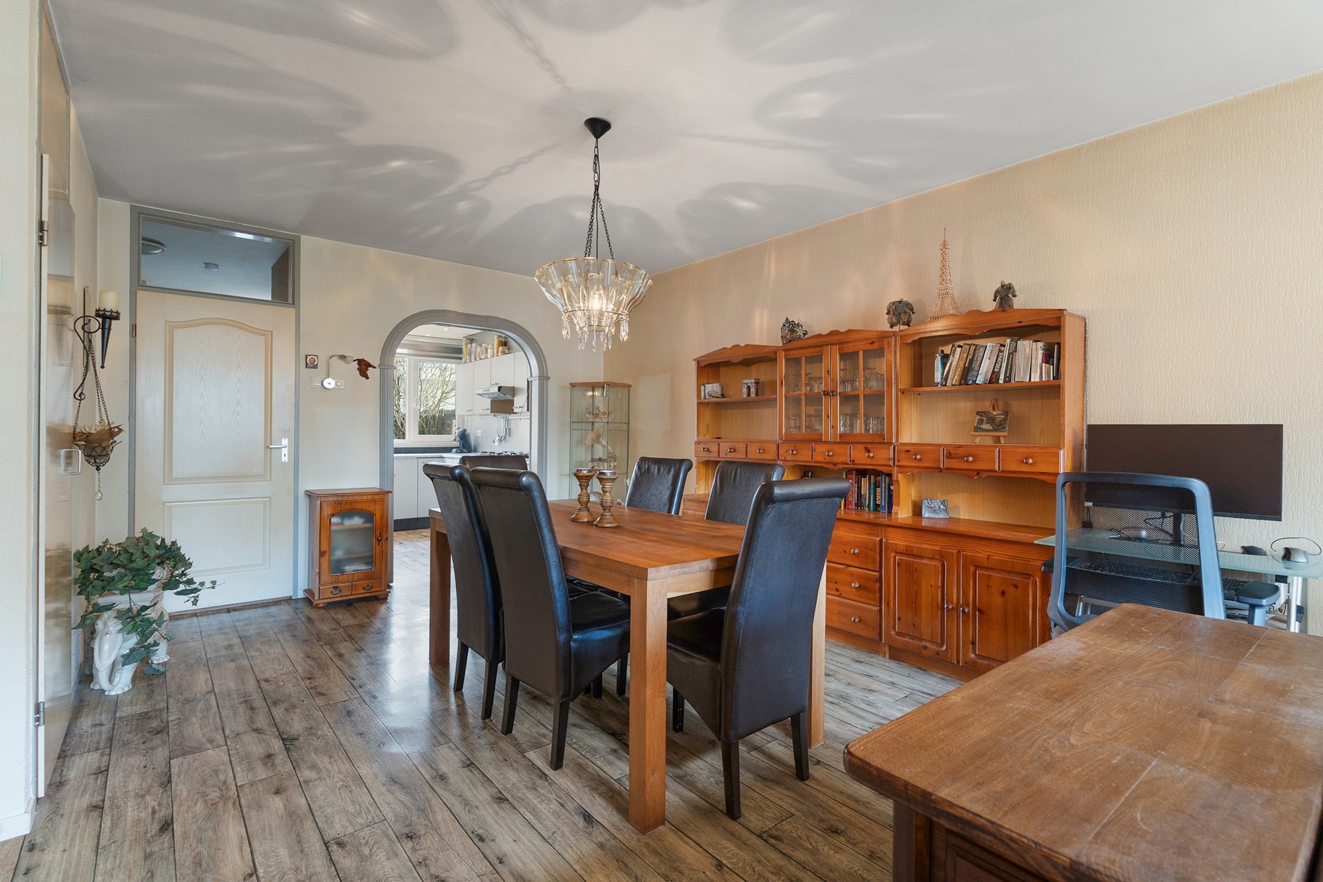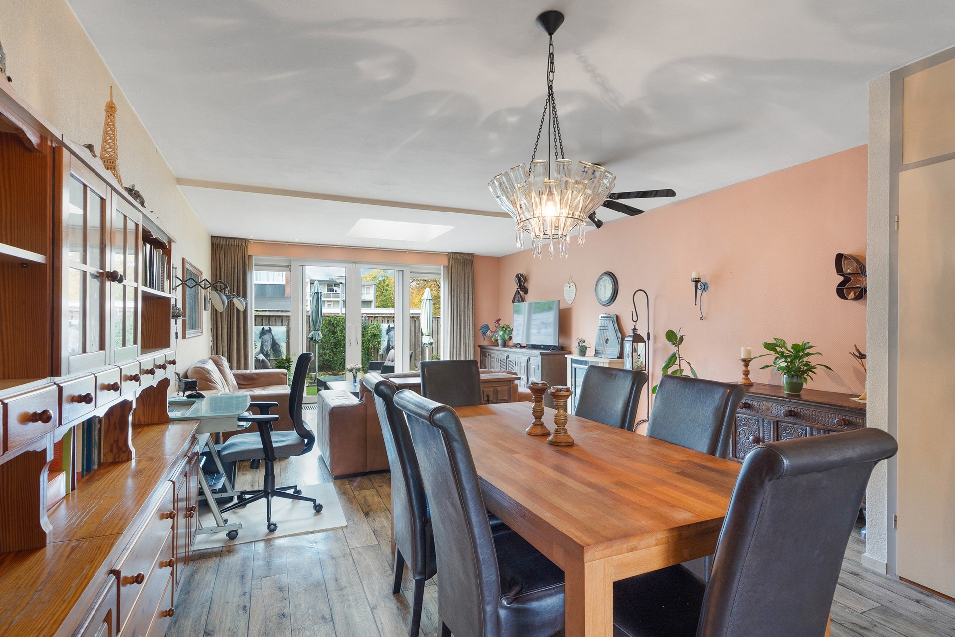 Via de verzorgde voortuin met stenen berging en garage bereik je de entree van de woning. In de hal bevinden zich de meterkast, het toilet, de trapopgang naar de eerste verdieping en toegang tot de woonkamer. De ruime woonkamer is aan de achterzijde over de volle breedte uitgebouwd, wat zorgt voor extra leefruimte en veel lichtinval middels een dakkoepel. Met dubbele schuifdeuren is de zonnige achtertuin toegankelijk. Aan de voorzijde bevindt zich de keuken in praktische hoekopstelling, voorzien van diverse inbouwapparatuur zoals een gaskookplaat, combi-oven en vaatwasser. De gehele verdieping is voorzien van een tapijtvloer (linoleum).