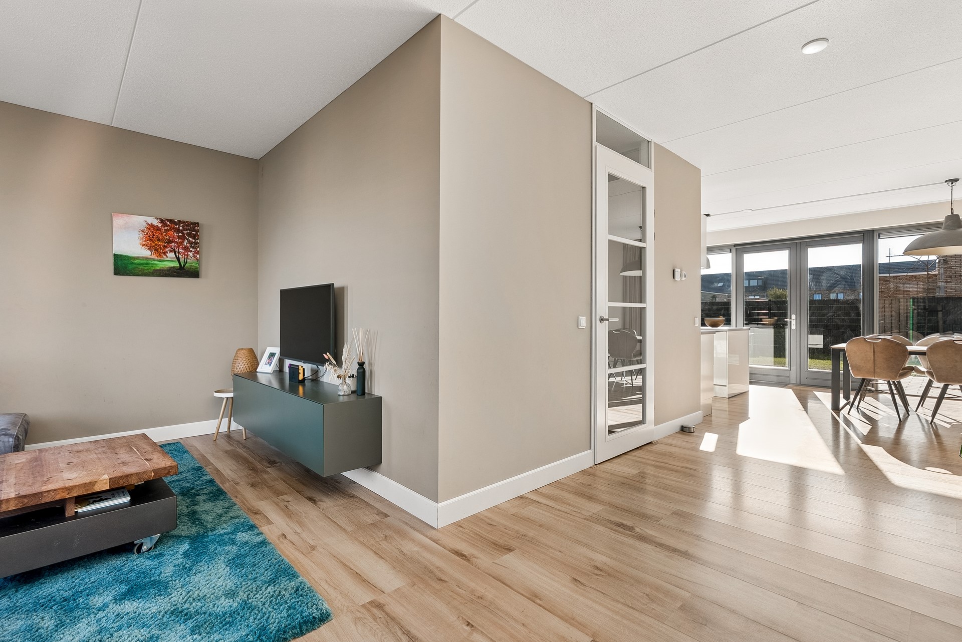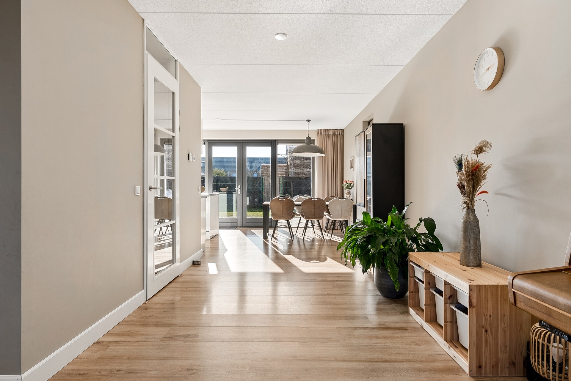 Bij binnenkomst in de woning voelt u direct hoeveel ruimte deze woning te bieden heeft. De hal leidt u naar de verschillende vertrekken, te weten: de meterkast, toilet, trapkast en woonkamer. De grote raampartijen op de begane grond zorgen voor een overvloed aan natuurlijk licht. De woonkamer is een ware eyecatcher. Met zijn royale afmetingen is dit de ideale plek om met uw gezin te ontspannen of vrienden te ontvangen. De open indeling maakt het sociale aspect van het leven nog aangenamer.