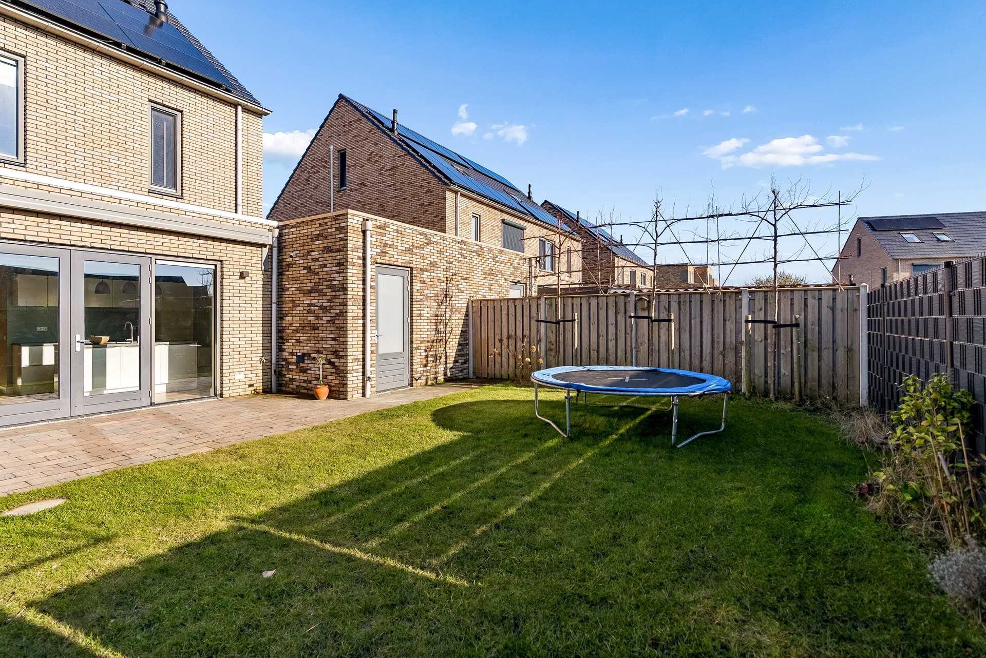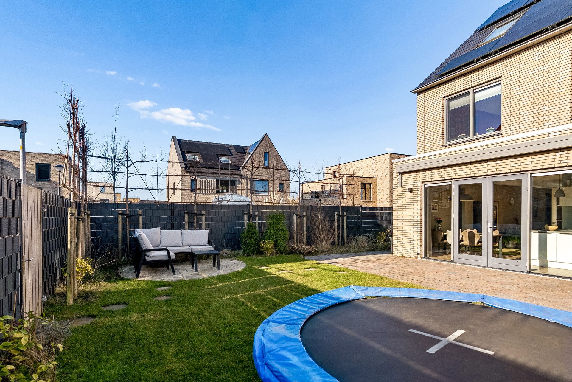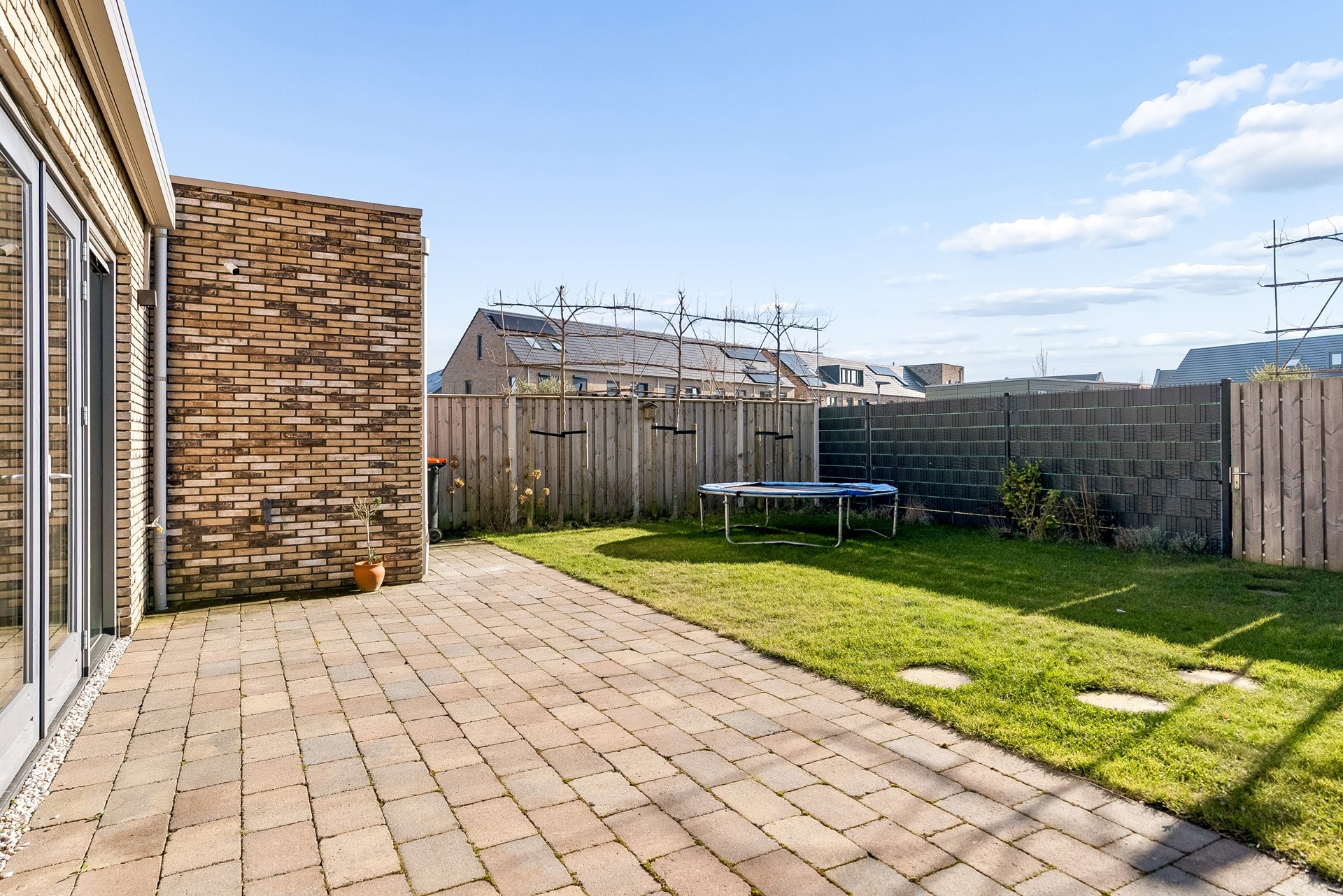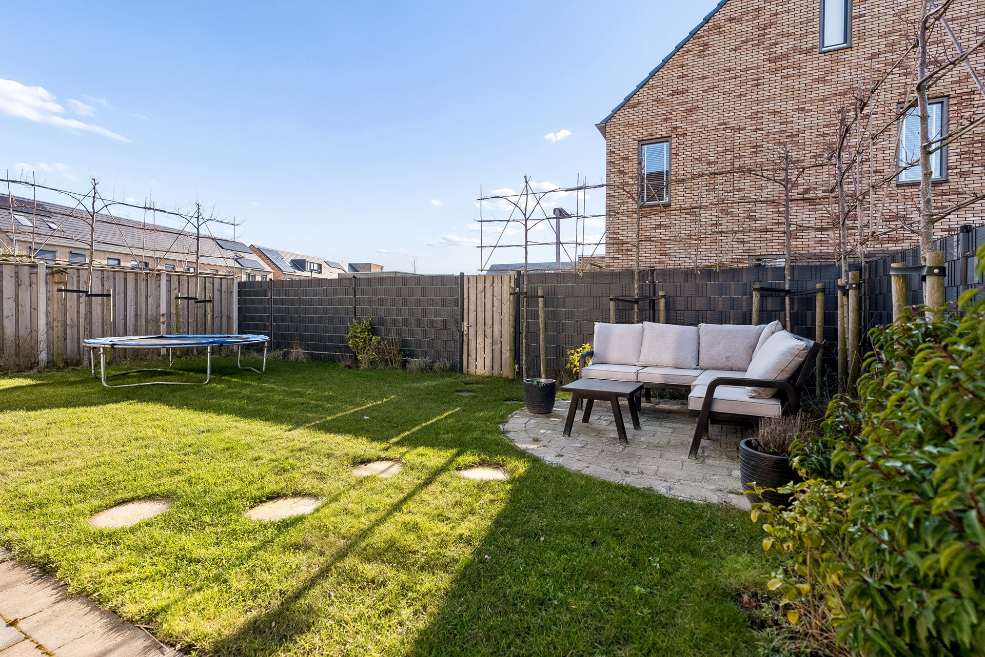 De tuin biedt mogelijkheid tot het plaatsen van meerdere zithoeken, er is een elektrisch zonnescherm aangebracht en geeft voldoende gelegenheid voor kinderen om te spelen.