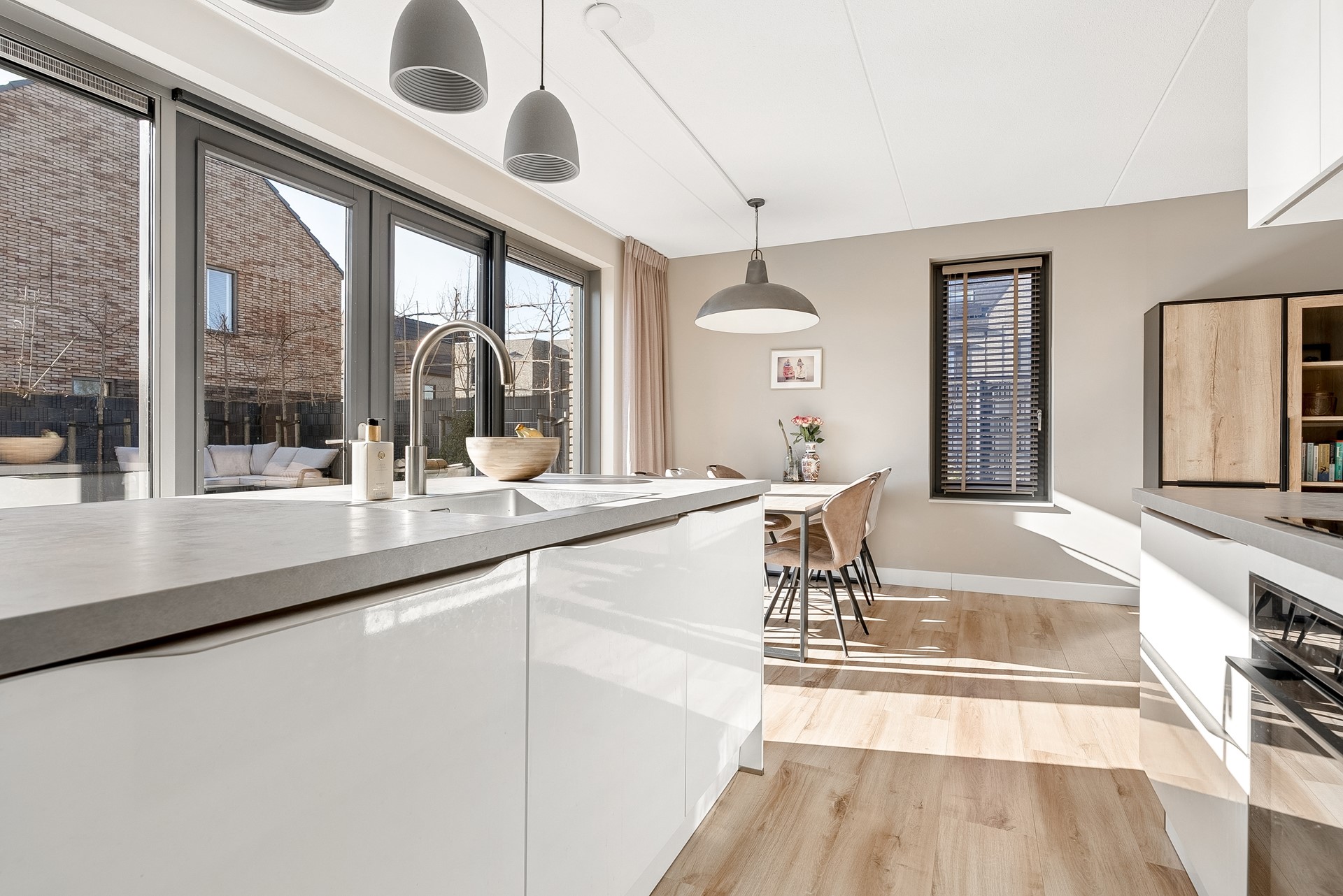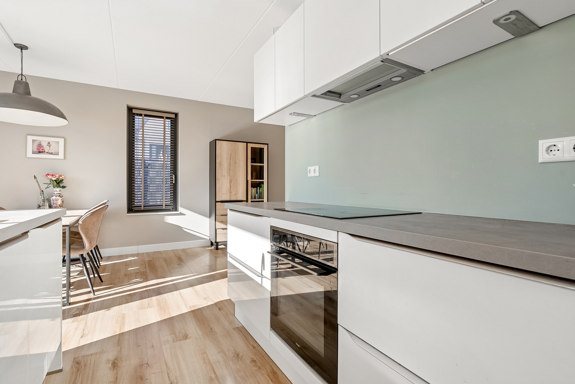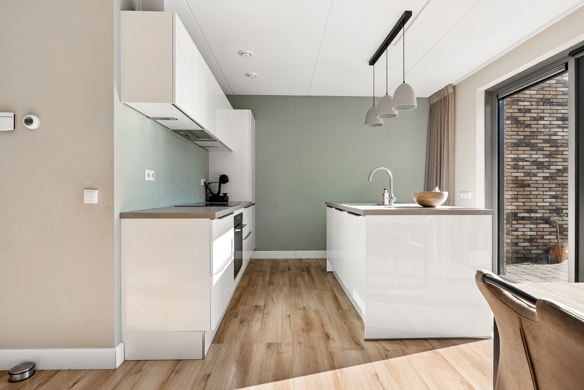 De moderne keuken is van alle gemakken voorzien en staat in directe verbinding met de woonkamer. Het gebruik van hoogwaardige materialen en de strakke afwerking geven de keuken een eigentijdse uitstraling en maken dat de keuken een heerlijke plek is om te kokkerellen terwijl u geniet van een prachtig uitzicht op de tuin. De keuken is uitgerust met diverse inbouwapparatuur, namelijk: koel-/vriescombinatie, vaatwasser, combimagnetron, inductiekookplaat en afzuigkap.
