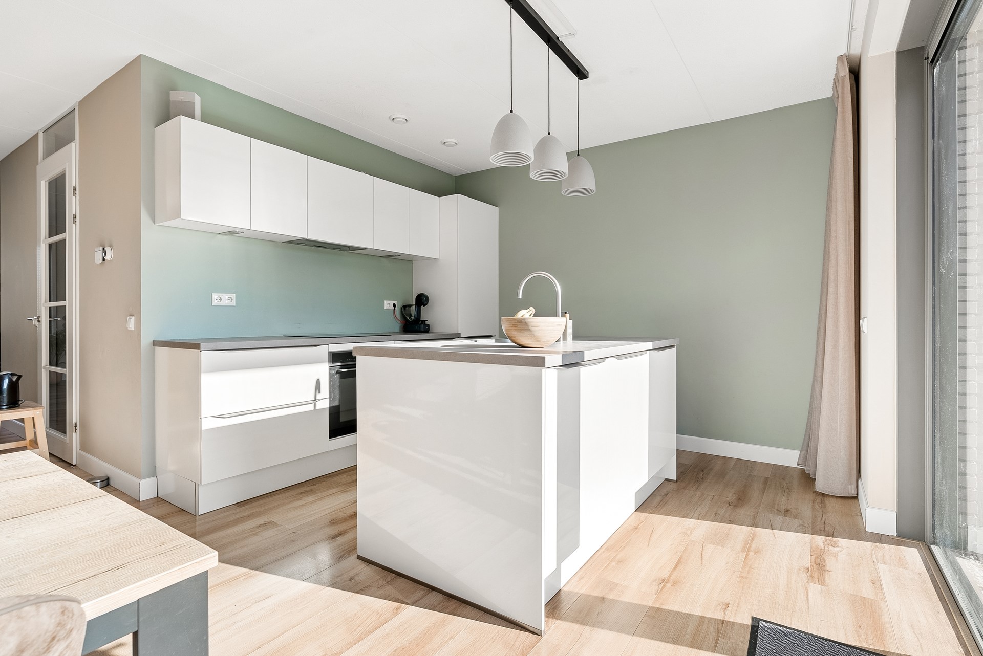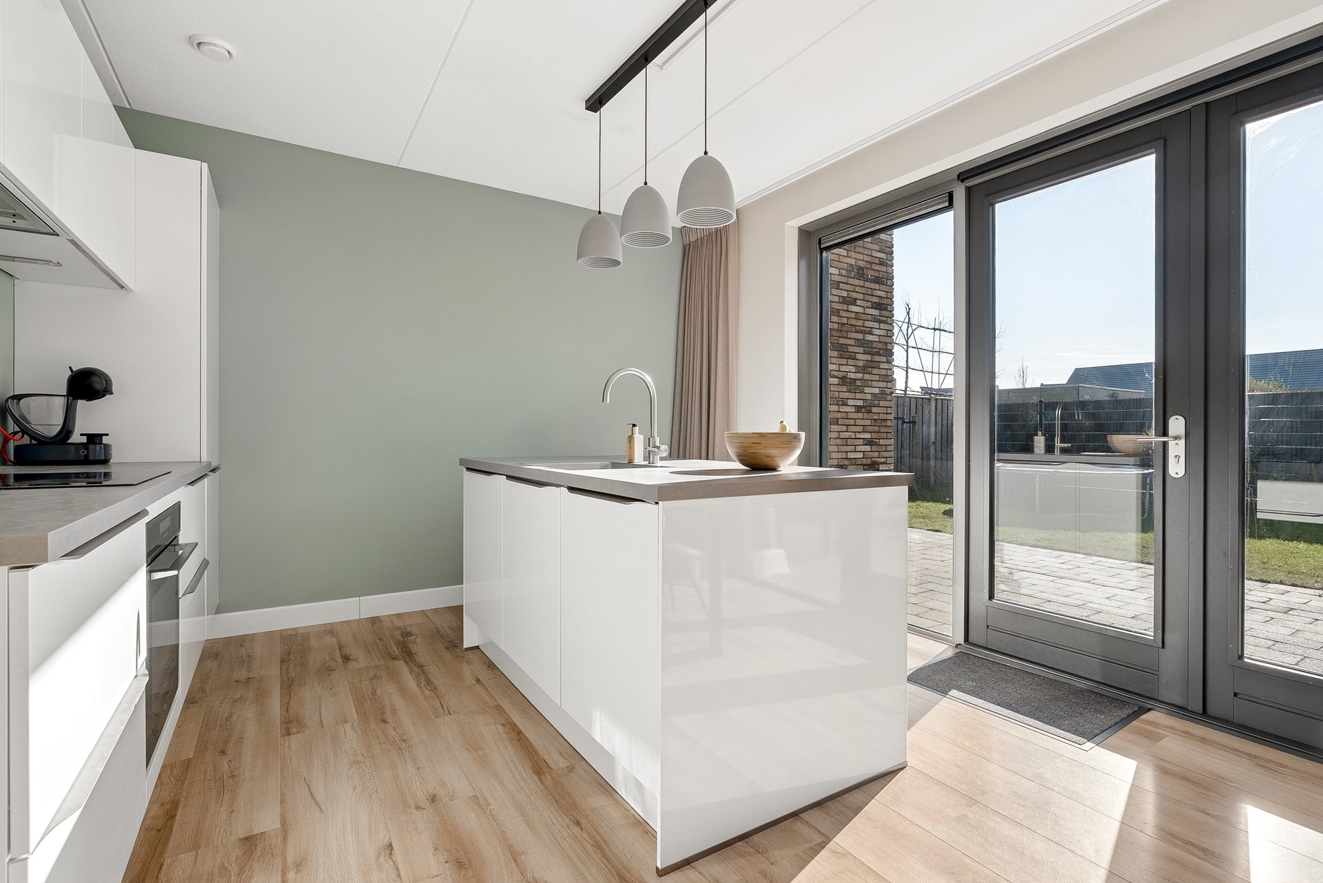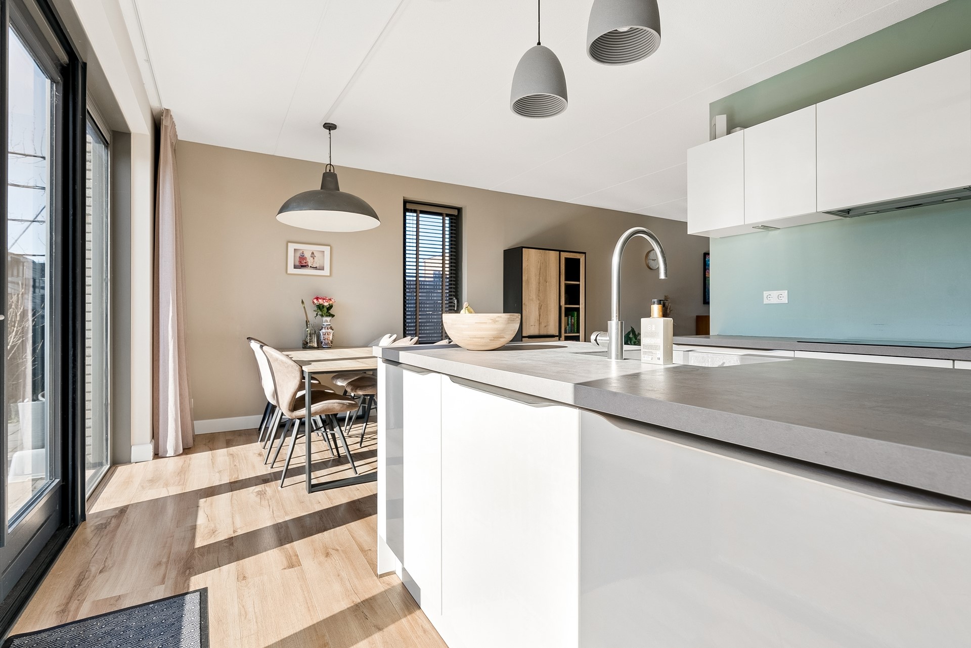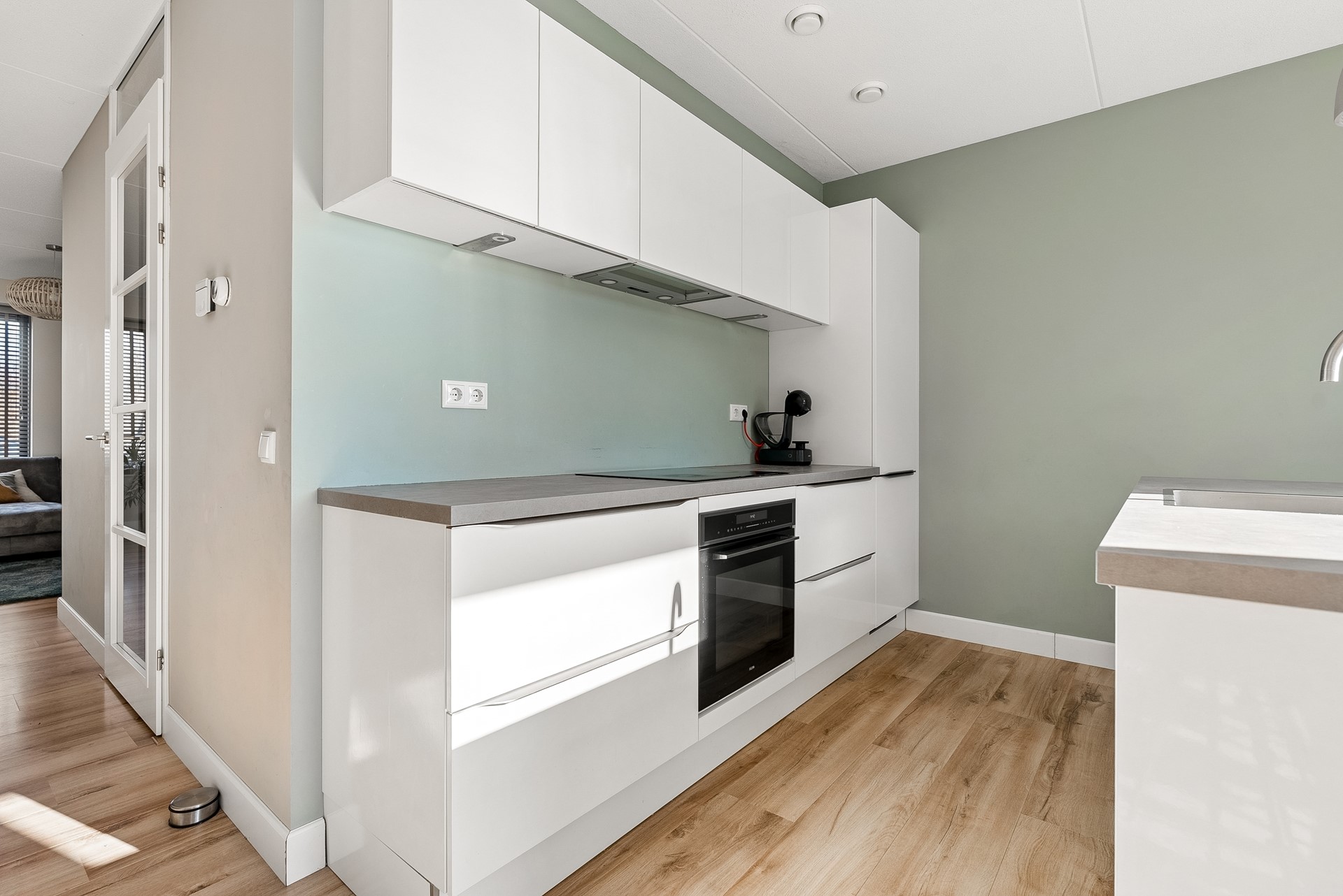 De moderne keuken is van alle gemakken voorzien en staat in directe verbinding met de woonkamer. Het gebruik van hoogwaardige materialen en de strakke afwerking geven de keuken een eigentijdse uitstraling en maken dat de keuken een heerlijke plek is om te kokkerellen terwijl u geniet van een prachtig uitzicht op de tuin. De keuken is uitgerust met diverse inbouwapparatuur, namelijk: koel-/vriescombinatie, vaatwasser, combimagnetron, inductiekookplaat en afzuigkap.