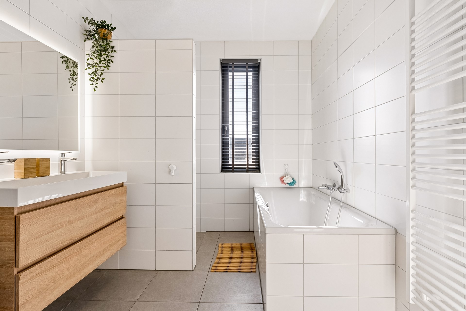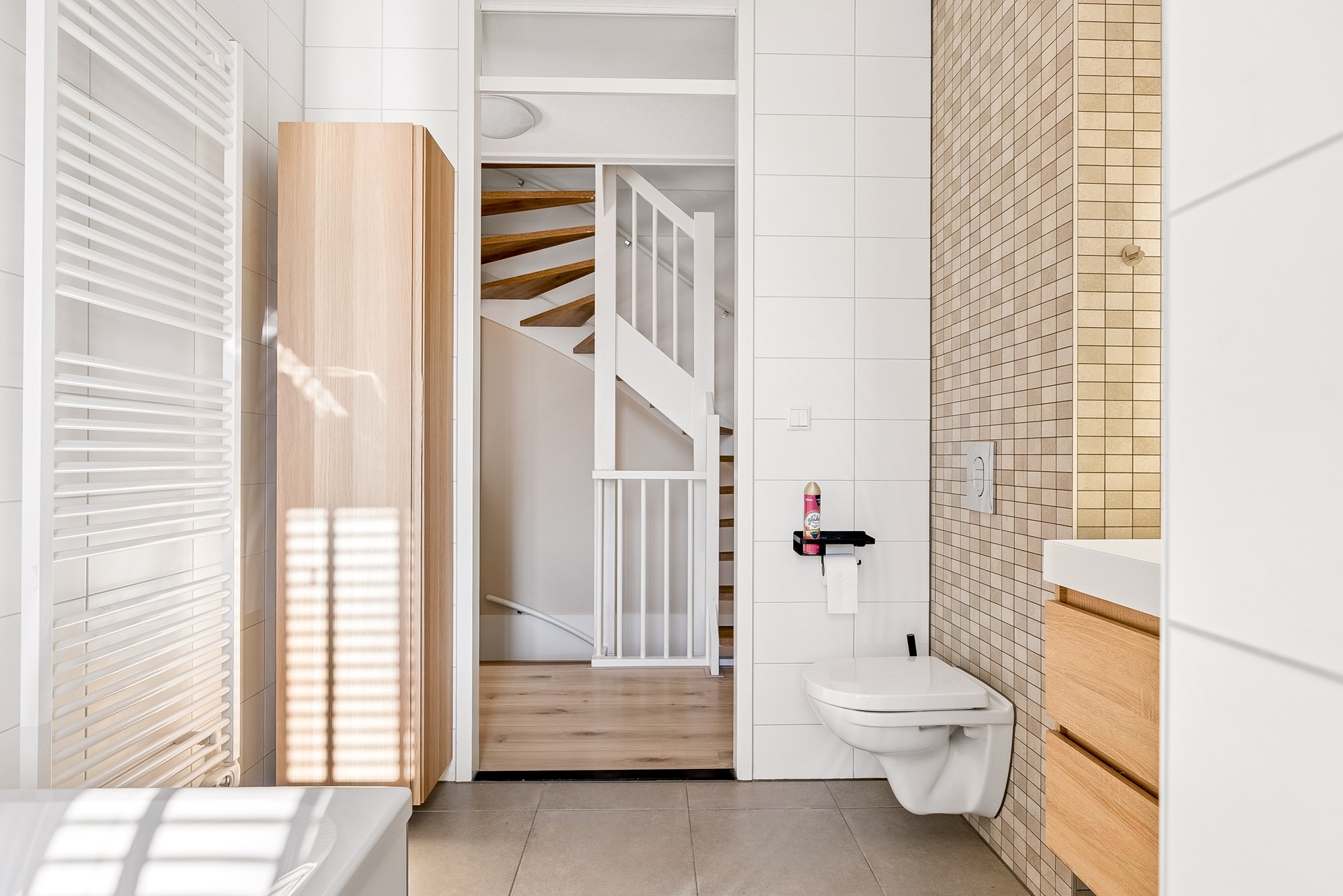 Daarnaast beschikt deze verdieping over een moderne badkamer die van alle gemakken is voorzien. De badkamer is stijlvol ingericht met keurige sanitaire voorzieningen en biedt zowel een ligbad als een aparte inloopdouche, perfect voor ontspanning na een lange werkdag. Uiteraard is hier ook een tweede toilet, een dubbele wastafel met meubel en een designradiator gesitueerd.