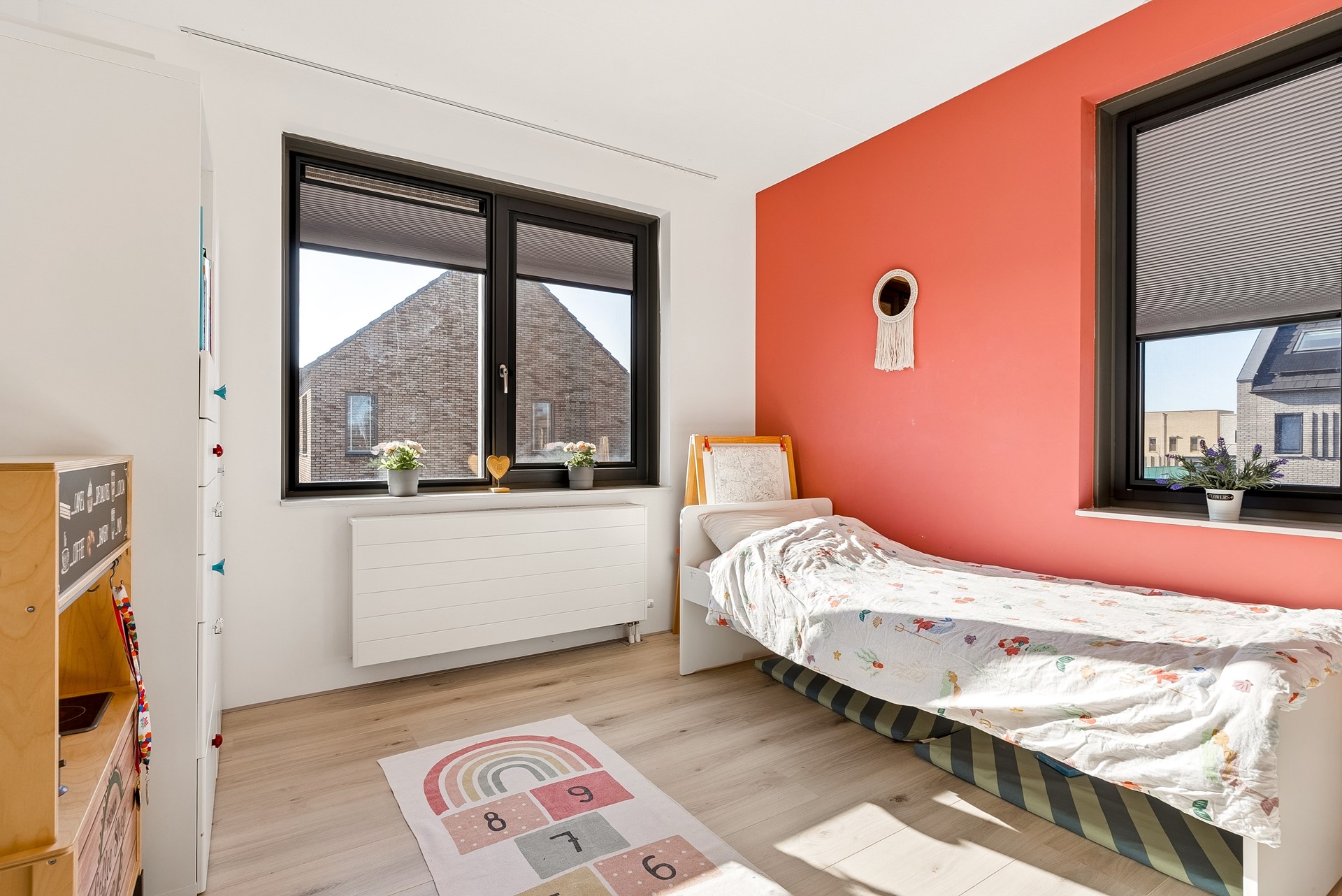 De eerste verdieping biedt ruimte aan drie van de vijf slaapkamers, wat deze woning ideaal maakt voor grotere gezinnen of voor het inrichten van een thuiskantoor. Alle slaapkamers in deze woning zijn meer dan royaal te noemen. Elke slaapkamer is licht met voldoende ruimte voor bedden, kasten, bureaus en andere benodigdheden. In de slaapkamers is ingebouwde raambekleding aangebracht en de slaapkamer aan de voorzijde heeft een speels frans balkon.