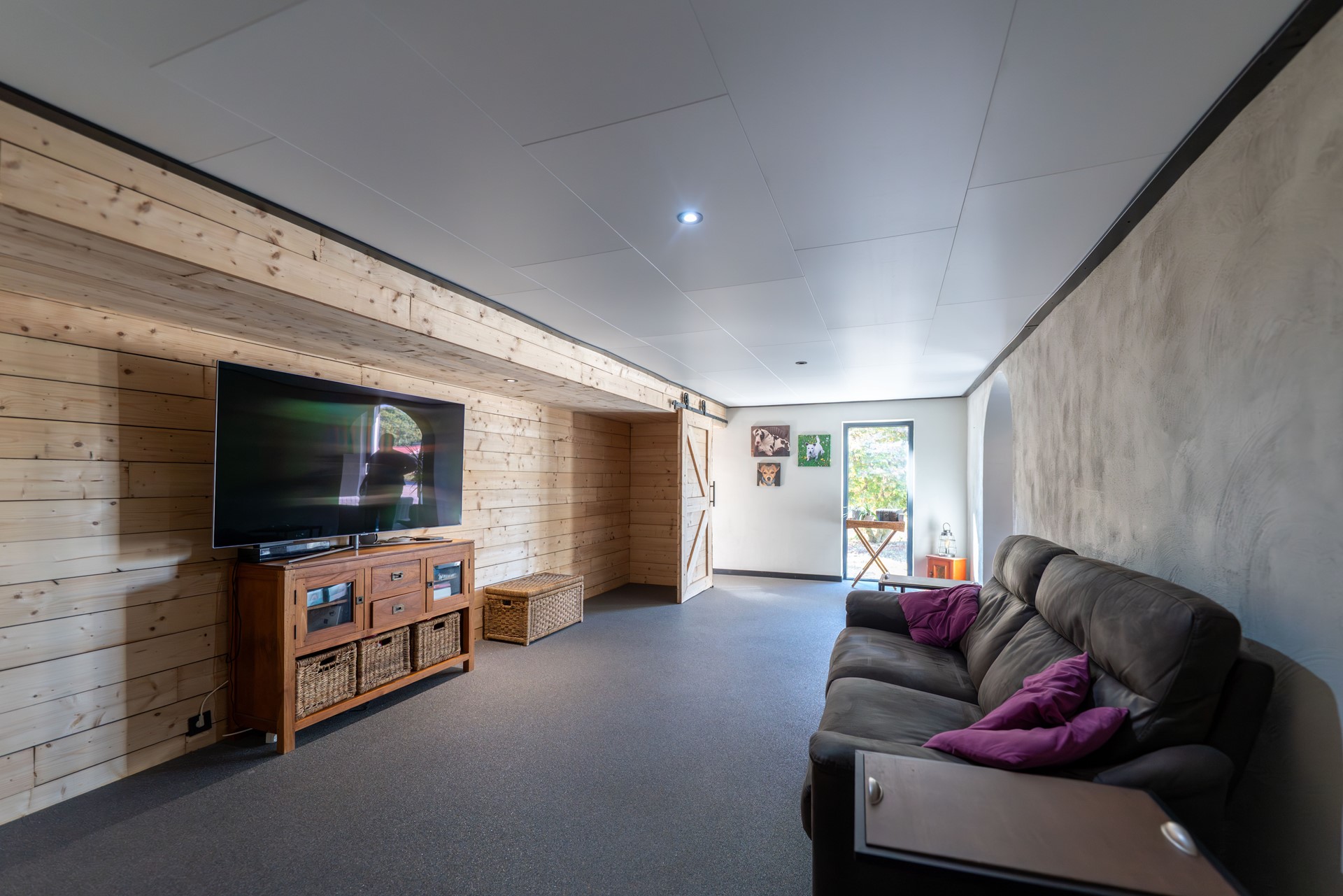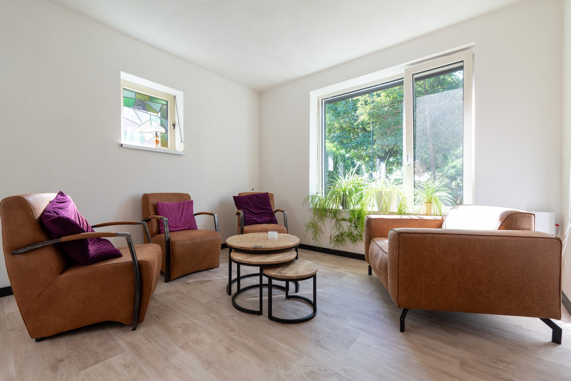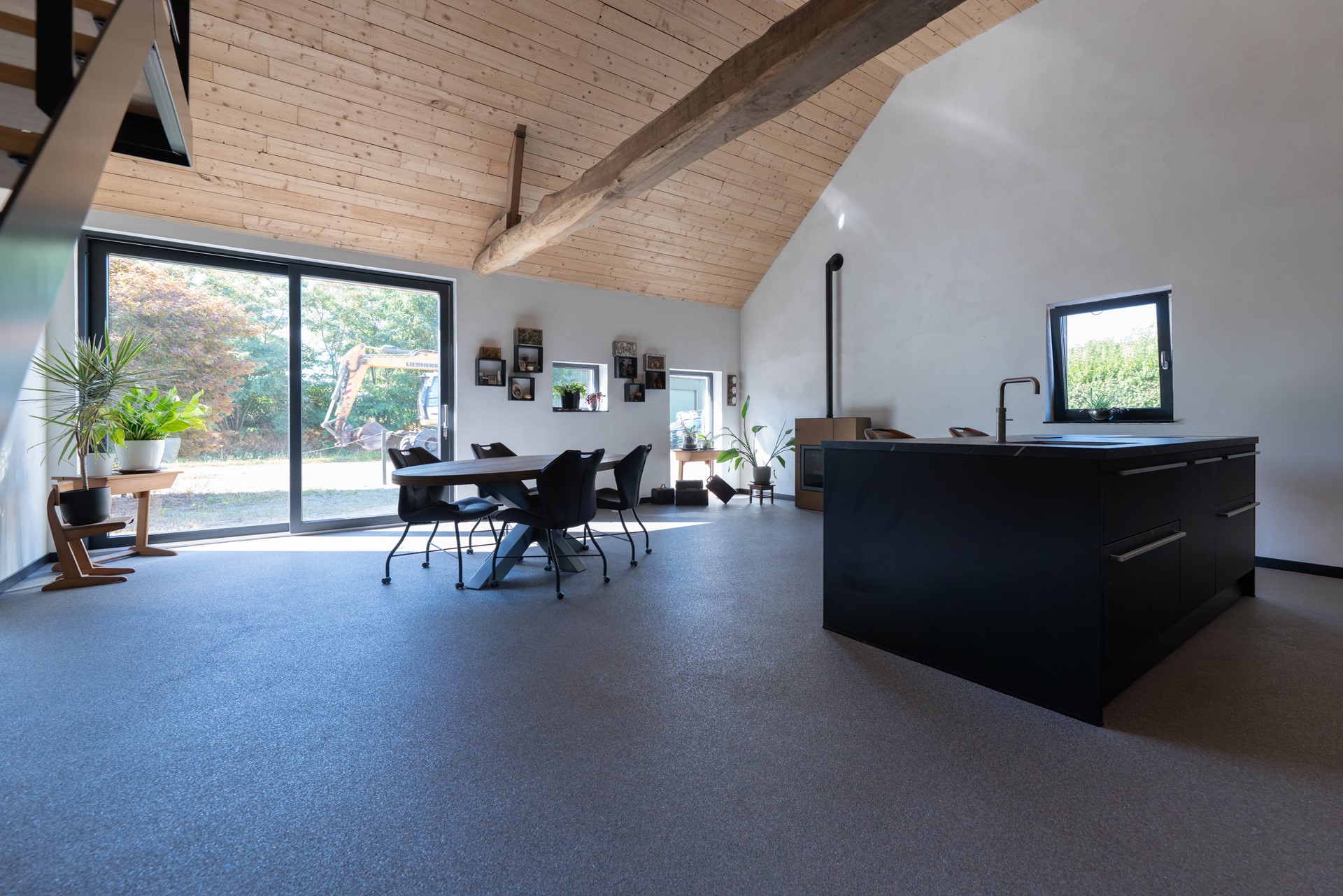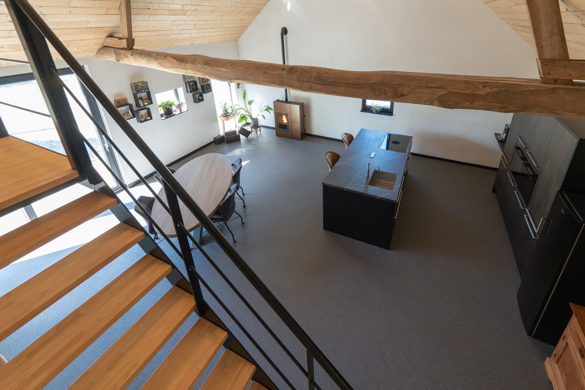 • Ruime, sfeervolle woonkamer met vloerverwarming, grote pelletkachel en elektrische rolluiken