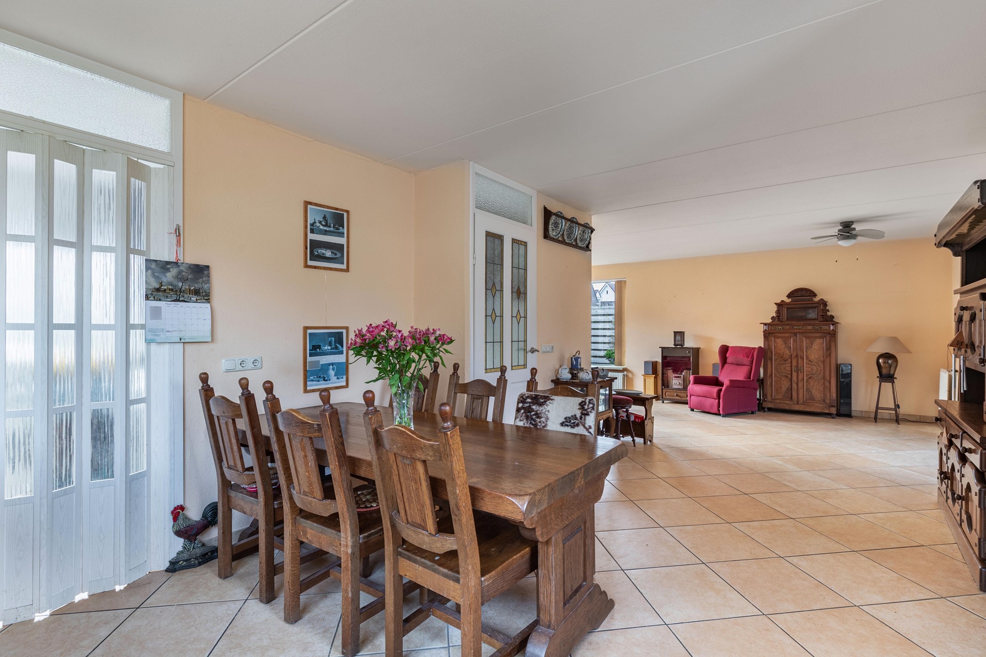 De open keuken is opgesteld in een praktische hoekopstelling en voorzien van een natuurstenen werkblad en diverse inbouwapparatuur, waaronder een recent vernieuwde vaatwasser. Aansluitend vind je de bijkeuken met opstelling van de cv-ketel en de wasmachineaansluiting, evenals een deur naar de tuin.