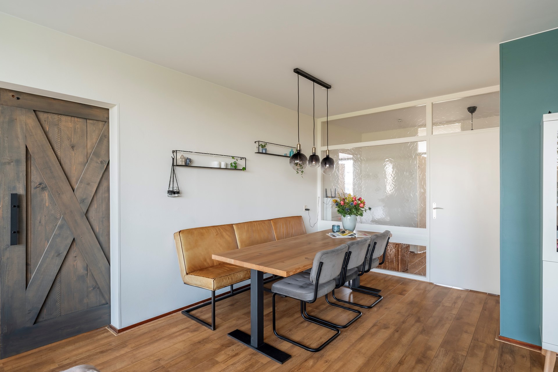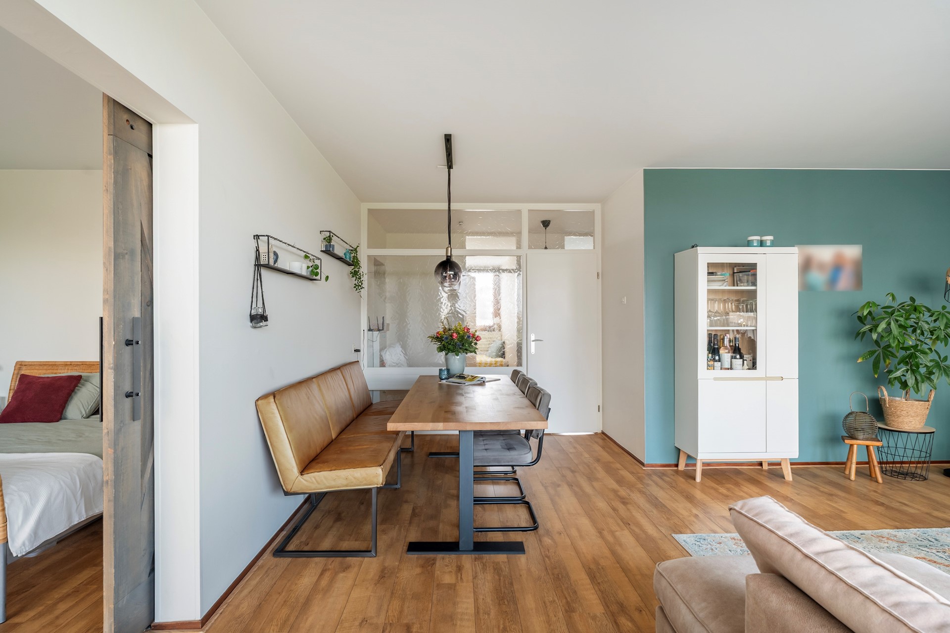Praktisch detail: de wasmachineopstelling en de boiler zijn slim weggewerkt in een aparte ruimte in de gang.
