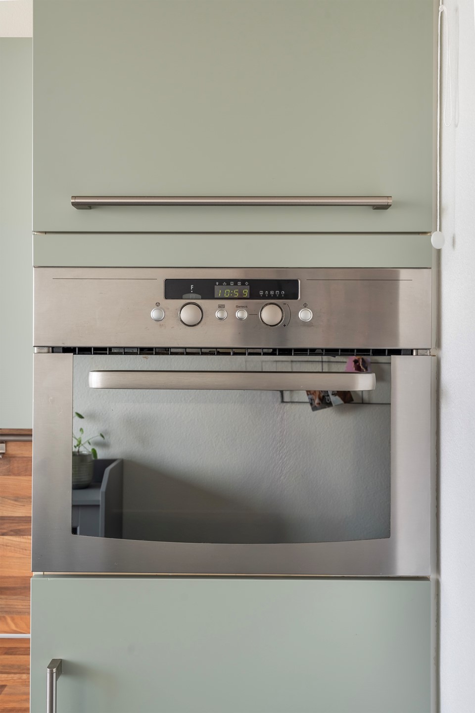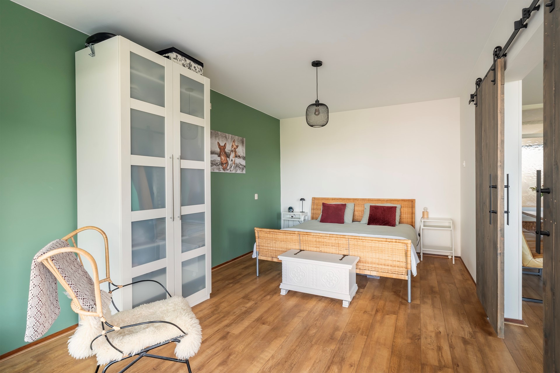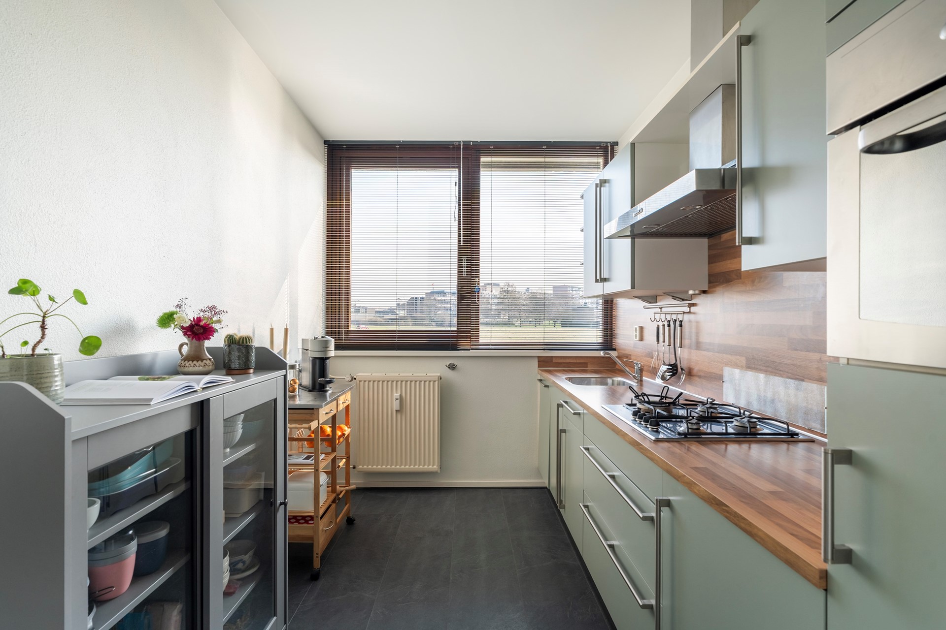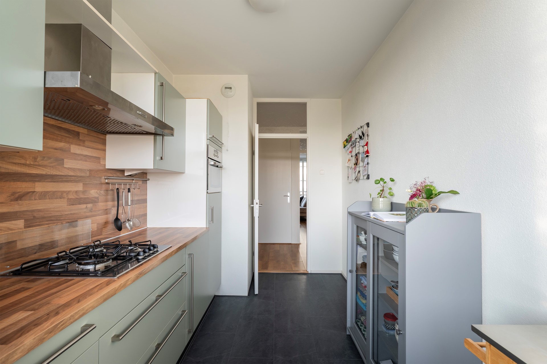 Aan de overzijde van de woonkamer tref je de moderne keuken. Deze heeft recent een smaakvolle make-over gekregen: de kastjes zijn uitgevoerd in een trendy matgroene kleur (wrap), wat prachtig contrasteert met het houtgekleurde aanrechtblad. De vloer is voorzien van gloednieuw laminaat en de keuken is van alle gemakken voorzien, waaronder een 4-pits gaskookplaat, vaatwasser, koelkast, vriezer en afzuigkap.