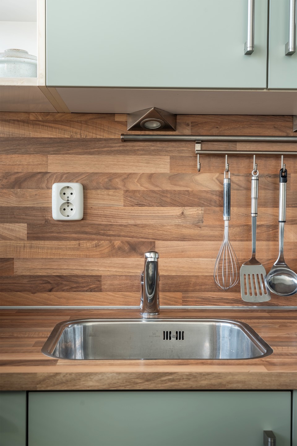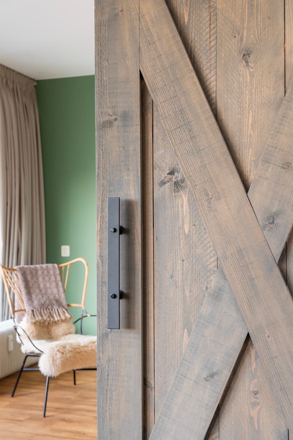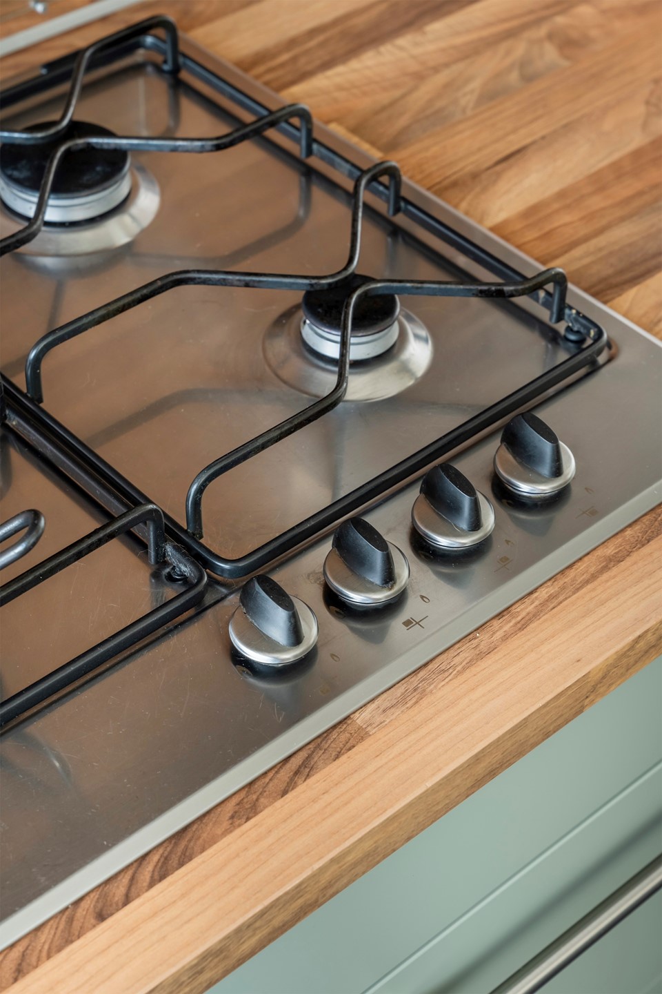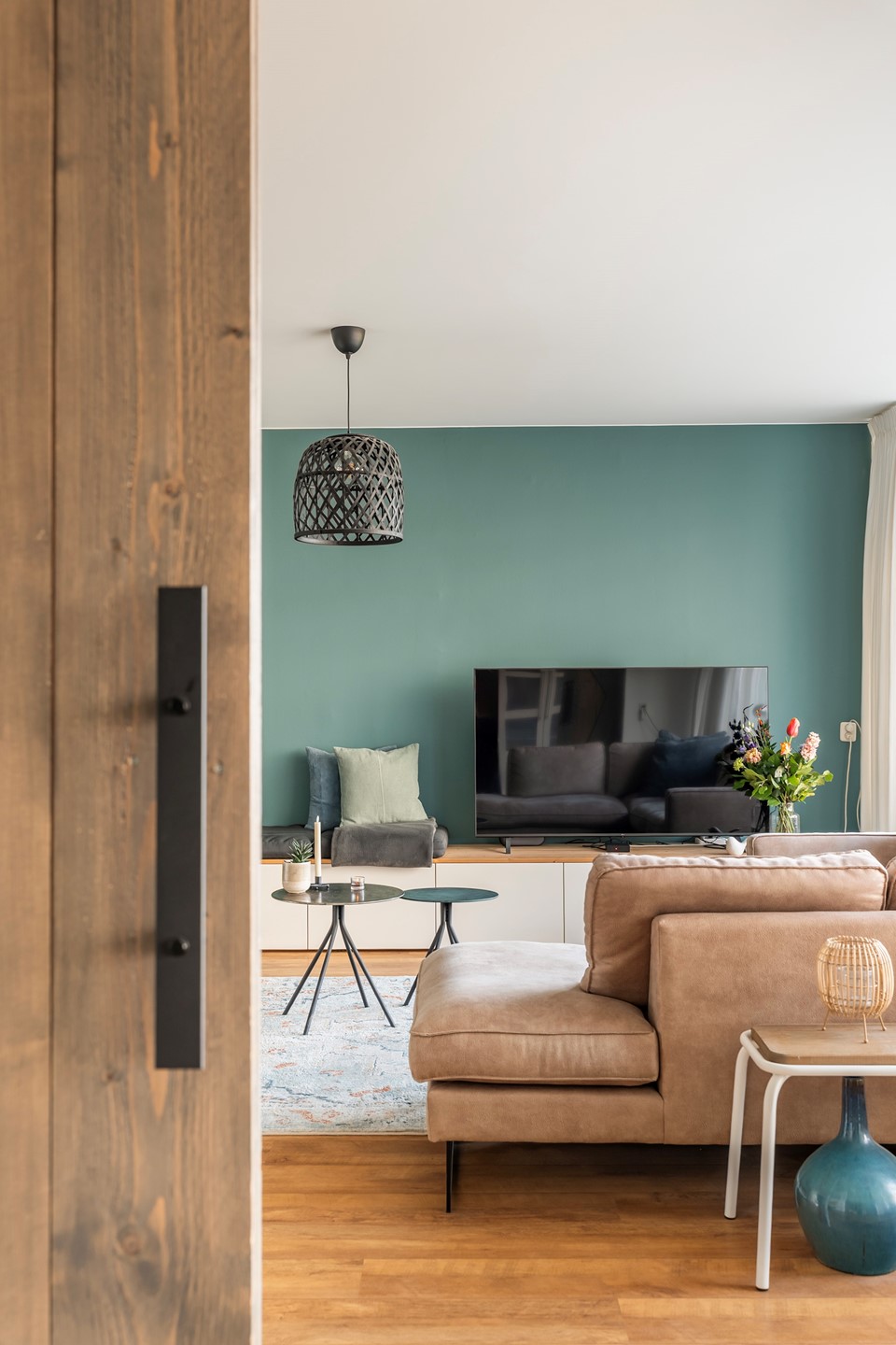 Aan de overzijde van de woonkamer tref je de moderne keuken. Deze heeft recent een smaakvolle make-over gekregen: de kastjes zijn uitgevoerd in een trendy matgroene kleur (wrap), wat prachtig contrasteert met het houtgekleurde aanrechtblad. De vloer is voorzien van gloednieuw laminaat en de keuken is van alle gemakken voorzien, waaronder een 4-pits gaskookplaat, vaatwasser, koelkast, vriezer en afzuigkap.