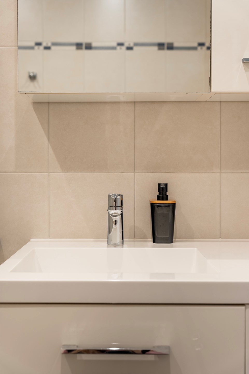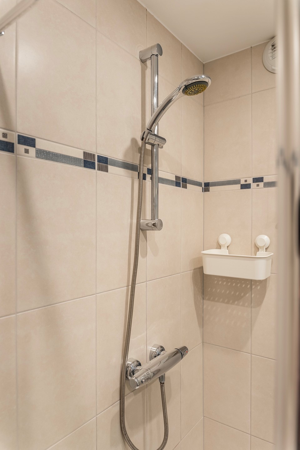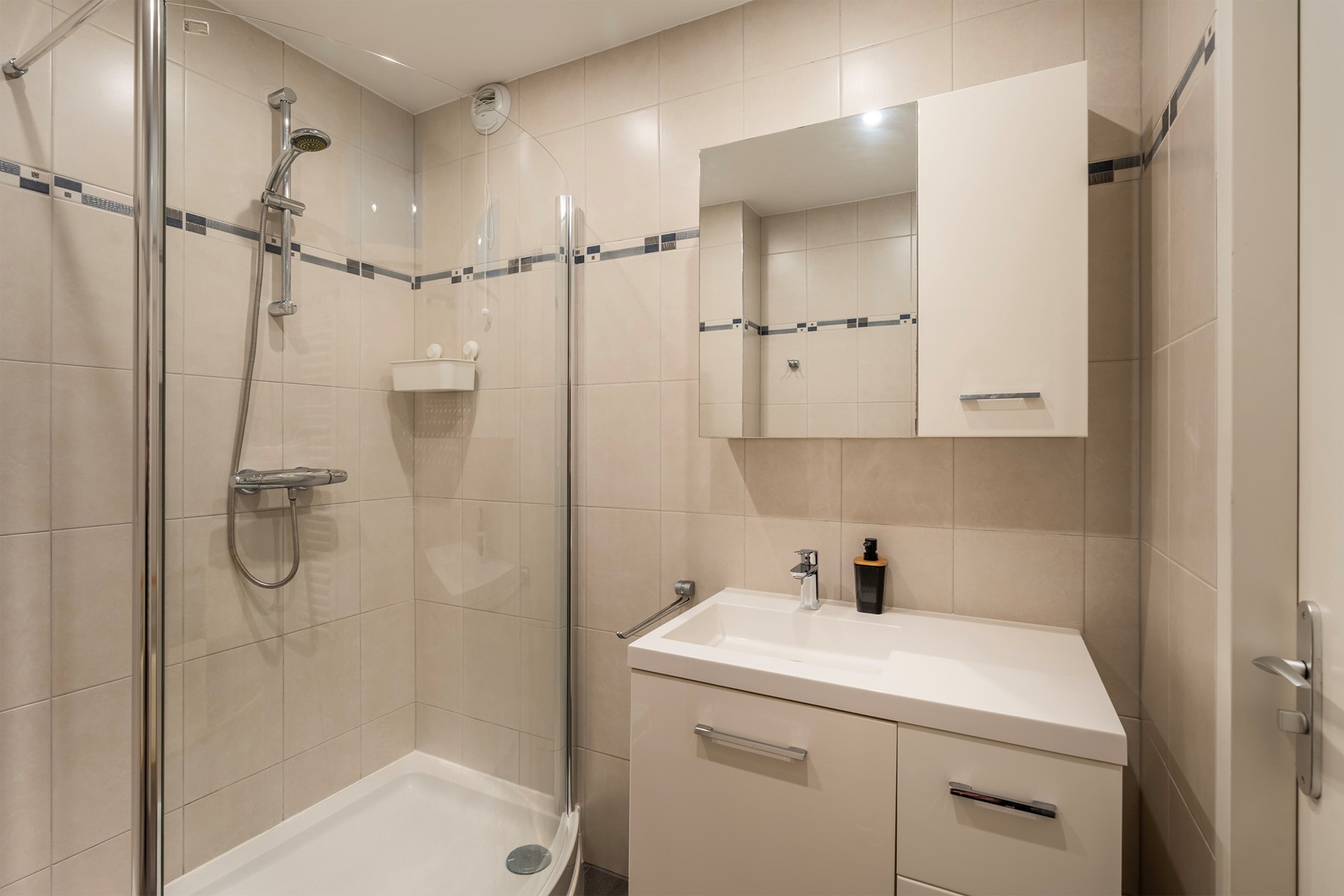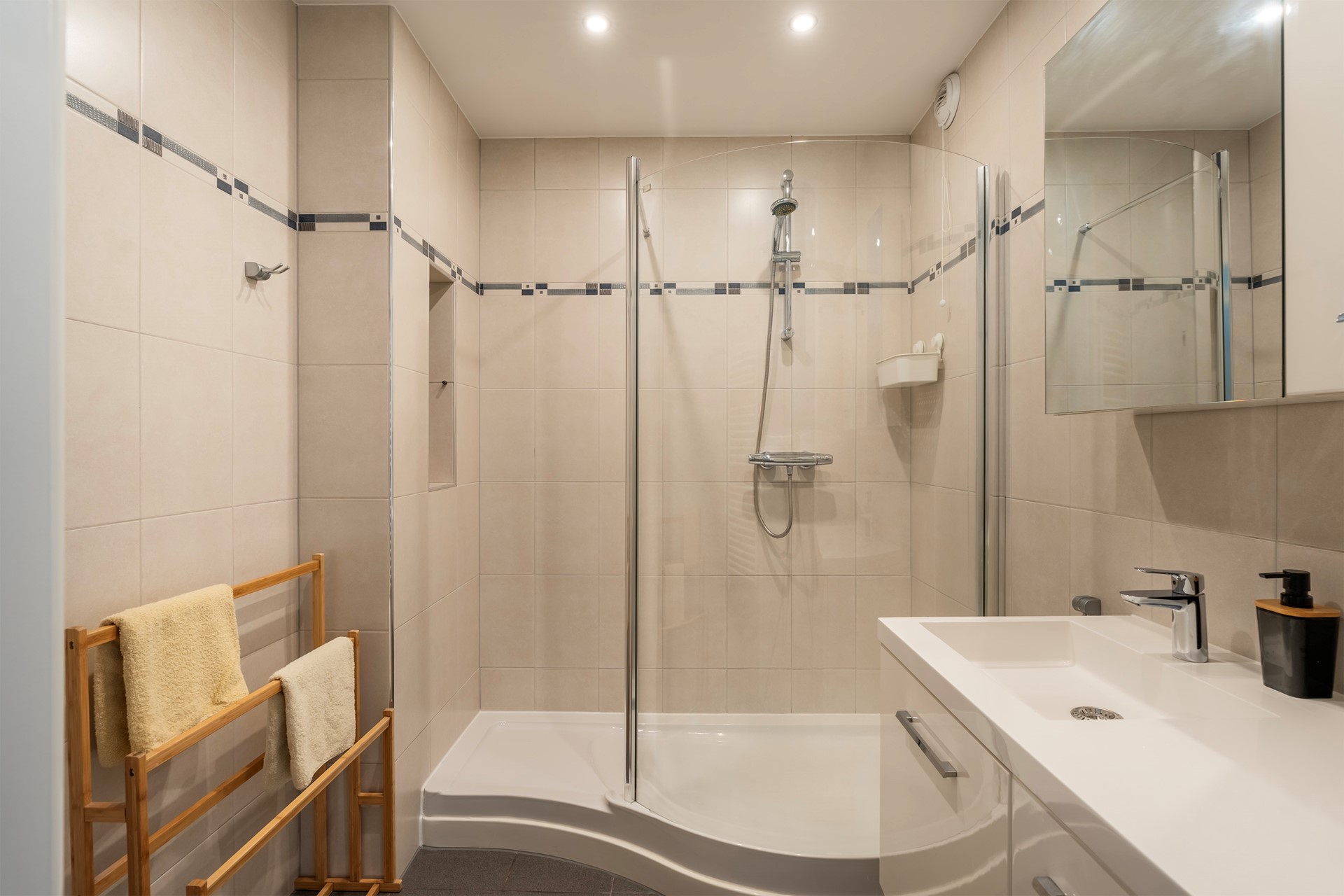 De nette badkamer is volledig uitgevoerd met rustgevende zandkleurige tegels en uitgerust met een inloopdouche en een modern wastafelmeubel.