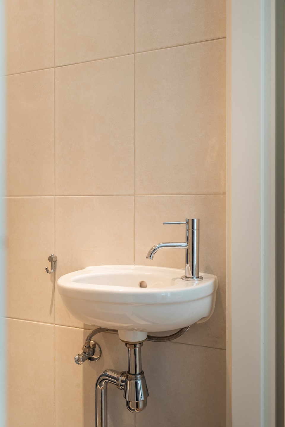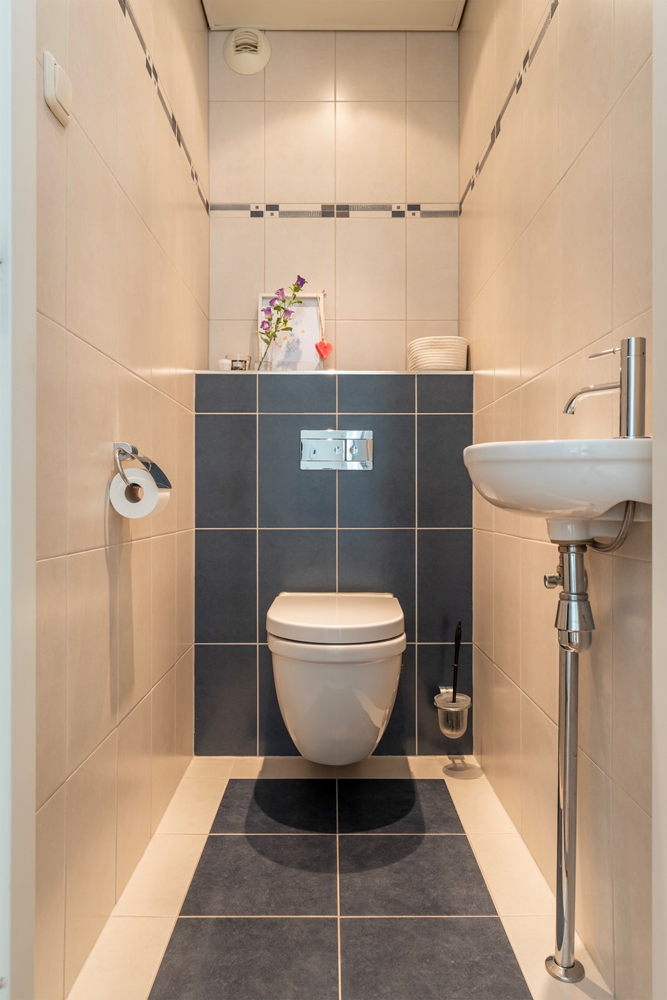 Direct daarnaast bevindt zich de toiletruimte, die geheel in stijl met de badkamer is afgewerkt. Het toilet is modern zwevend uitgevoerd en voorzien van een fonteintje.