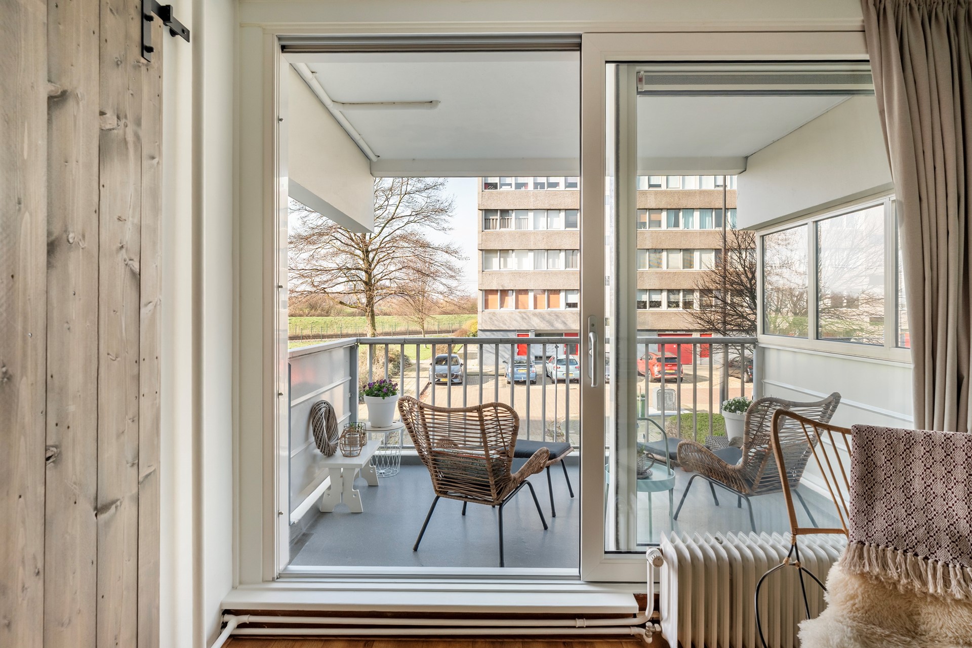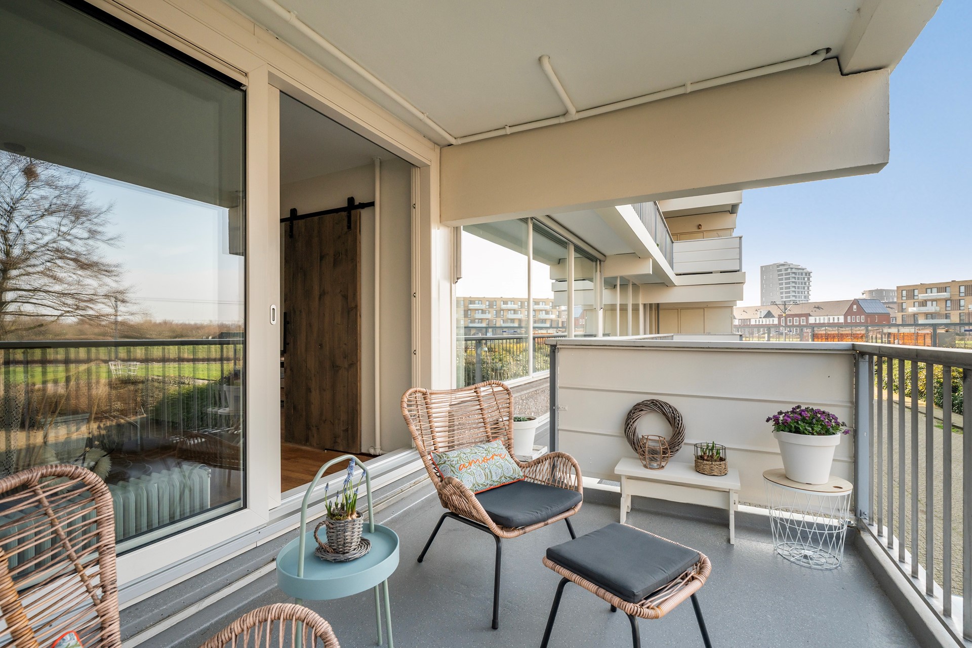 Via de prachtige houten ensuite deuren bereik je de masterbedroom. Deze ruimte heeft een gloednieuwe kunststof schuifpui die toegang biedt tot het zonnige balkon. Hier geniet je tot laat in de avond van de zon en het unieke uitzicht over de Waterweg.