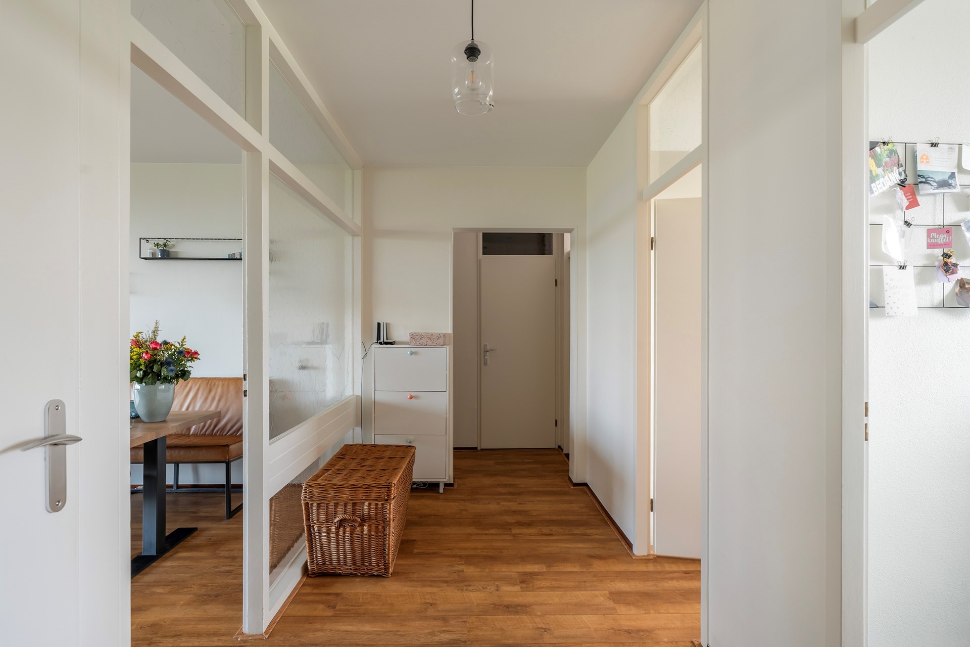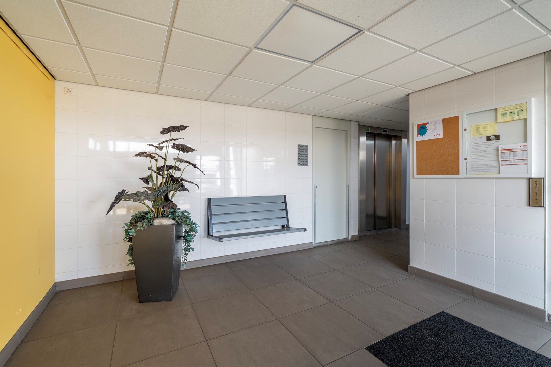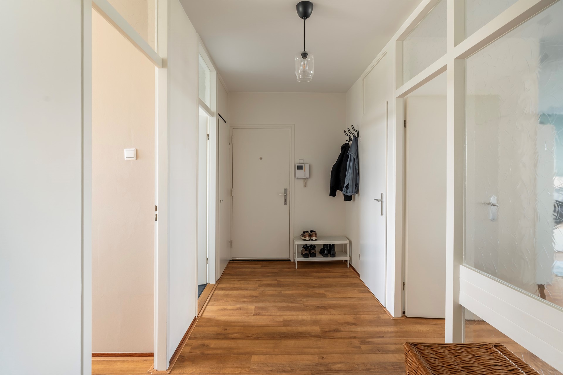 Via de centrale entree met bellentableau bereik je met de lift of de trap de eerste etage. Bij binnenkomst in de hal vind je de garderobe en de meterkast, waarna de ontdekkingsreis door dit lichte appartement begint.