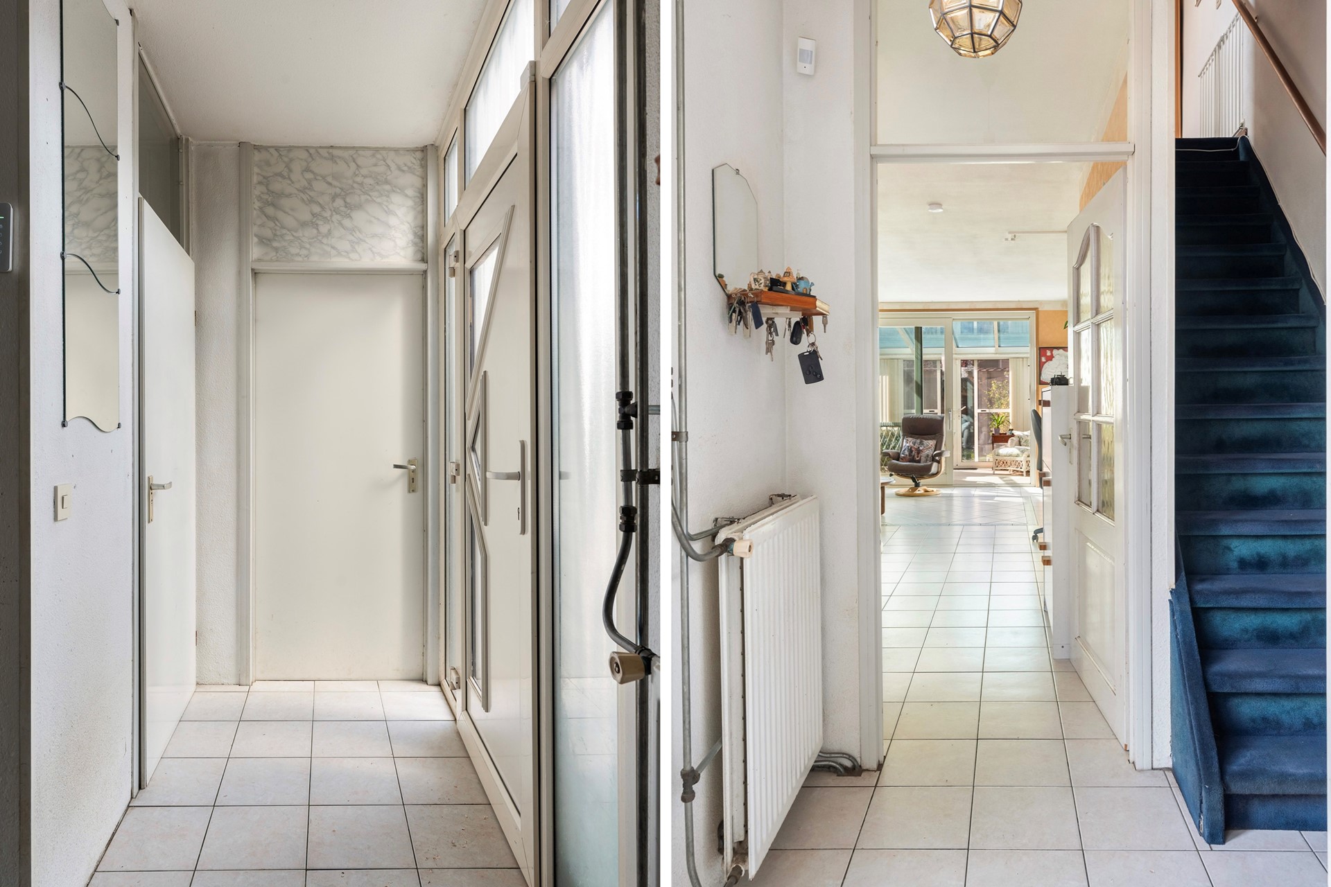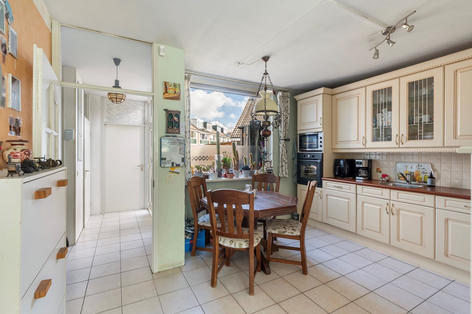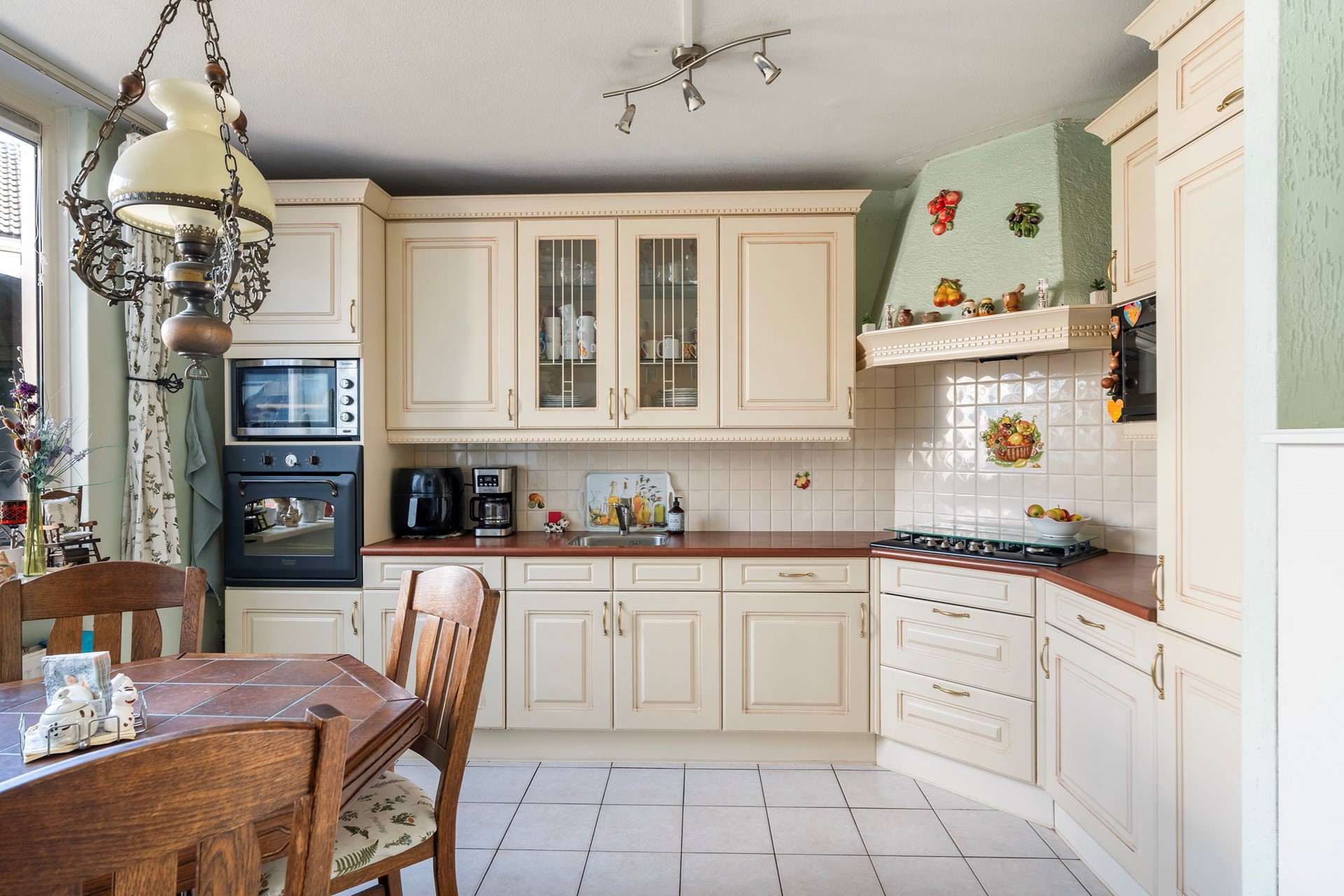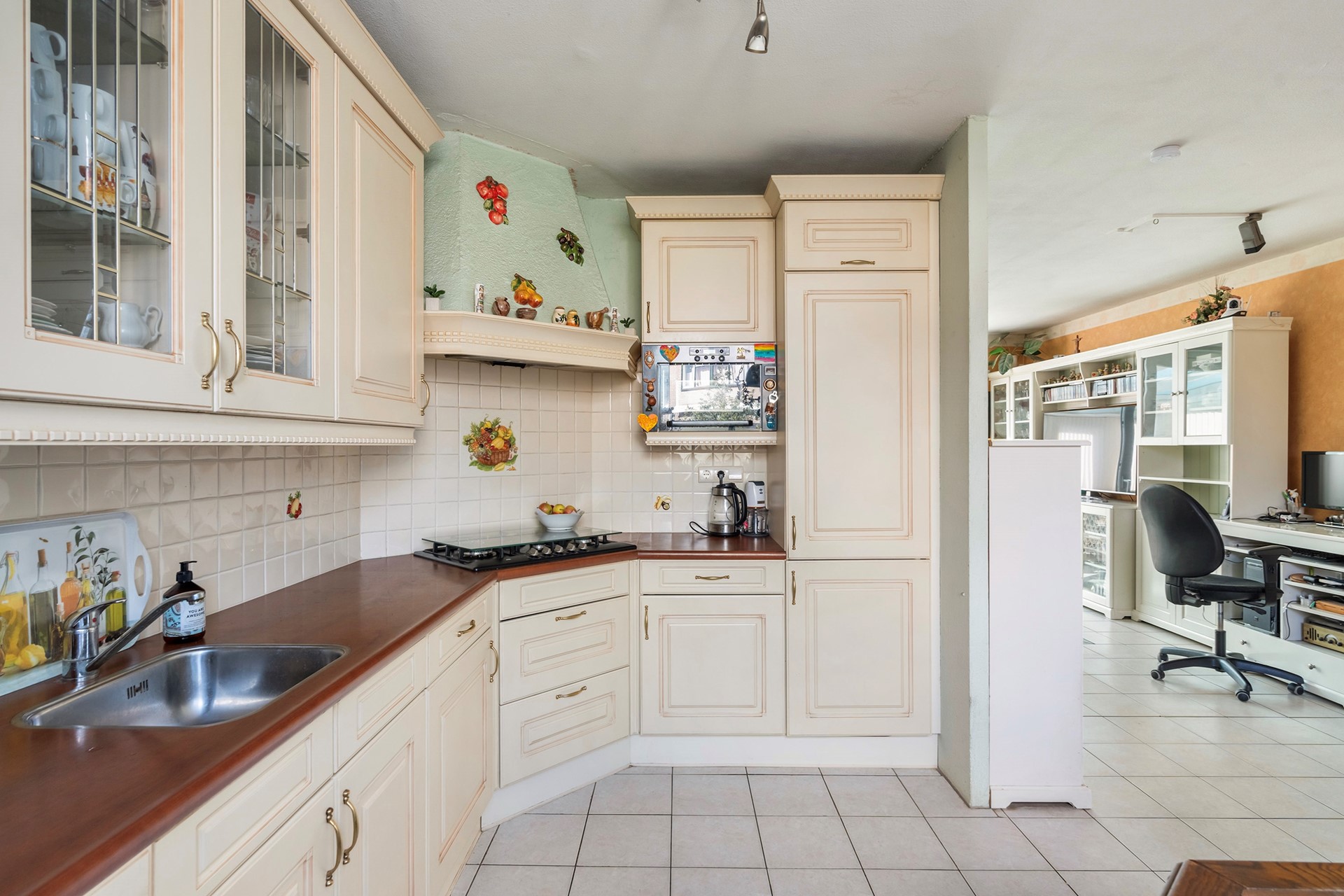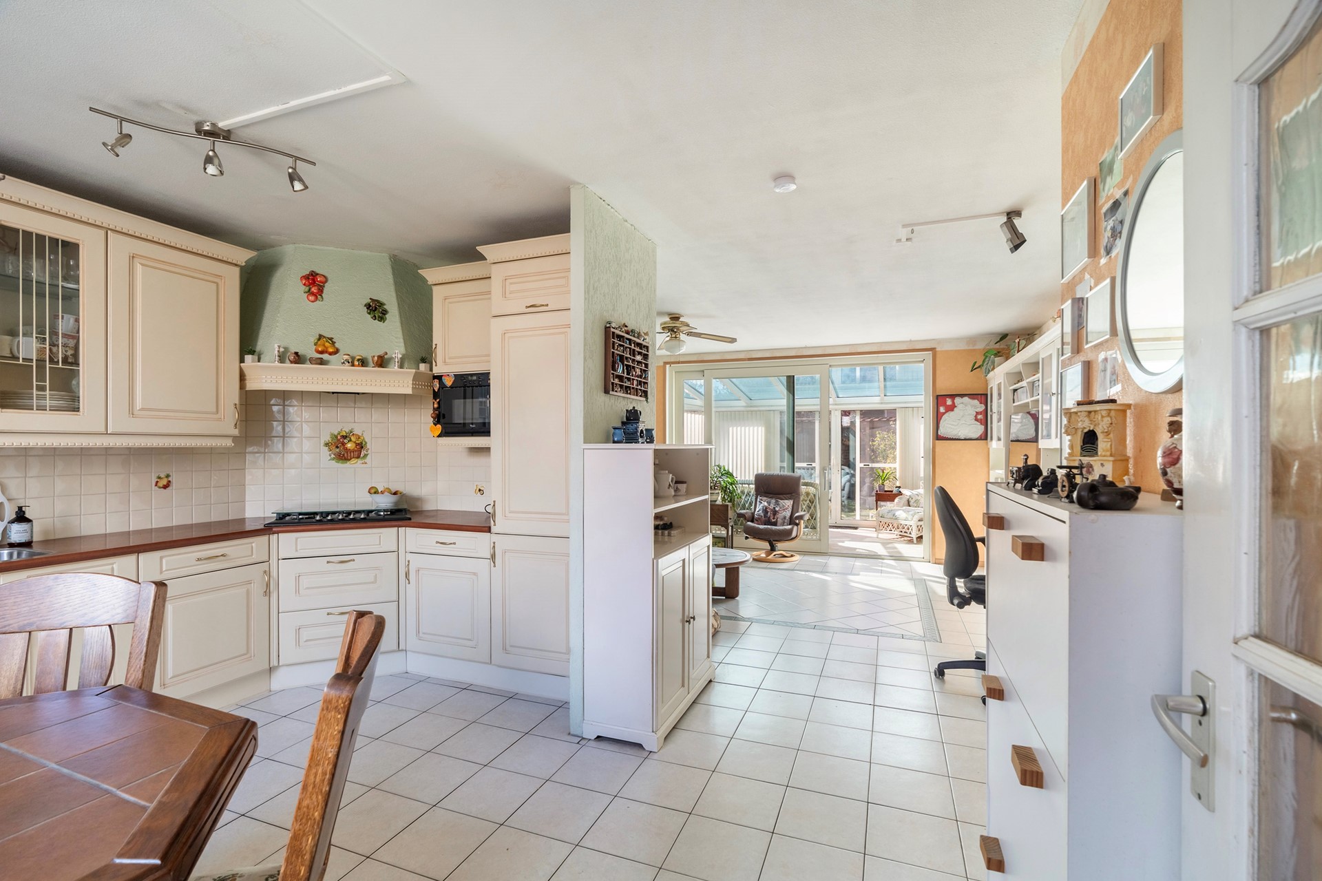 Via de verzorgde voortuin en de entree met meterkast, toilet en handige berging, stap je de leefruimte binnen. De gehele begane grond is voorzien van een lichte plavuizen vloer met aangename vloerverwarming. Aan de voorzijde bevindt zich de klassieke keuken. Deze is keurig onderhouden en van alle gemakken voorzien, zoals een 5-pits gasfornuis, oven, magnetron en vaatwasser. Hoewel de keuken in goede staat verkeert, biedt de ruimte een prachtige kans om hier met een facelift je eigen droomkeuken te realiseren.