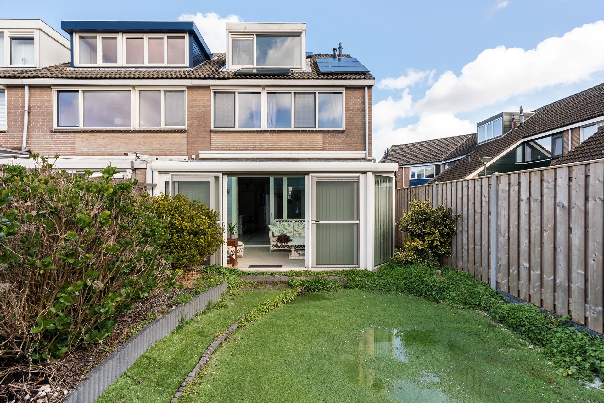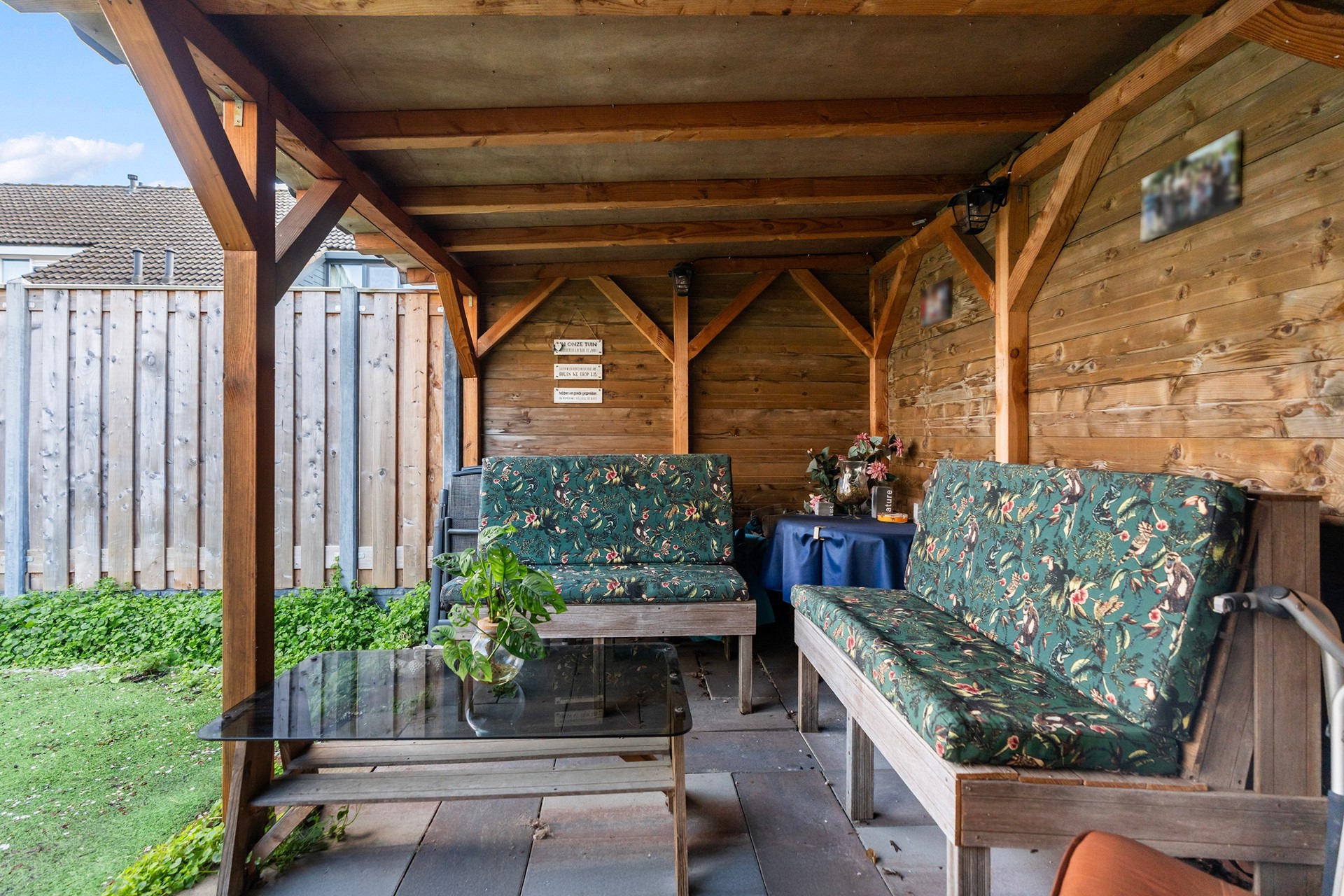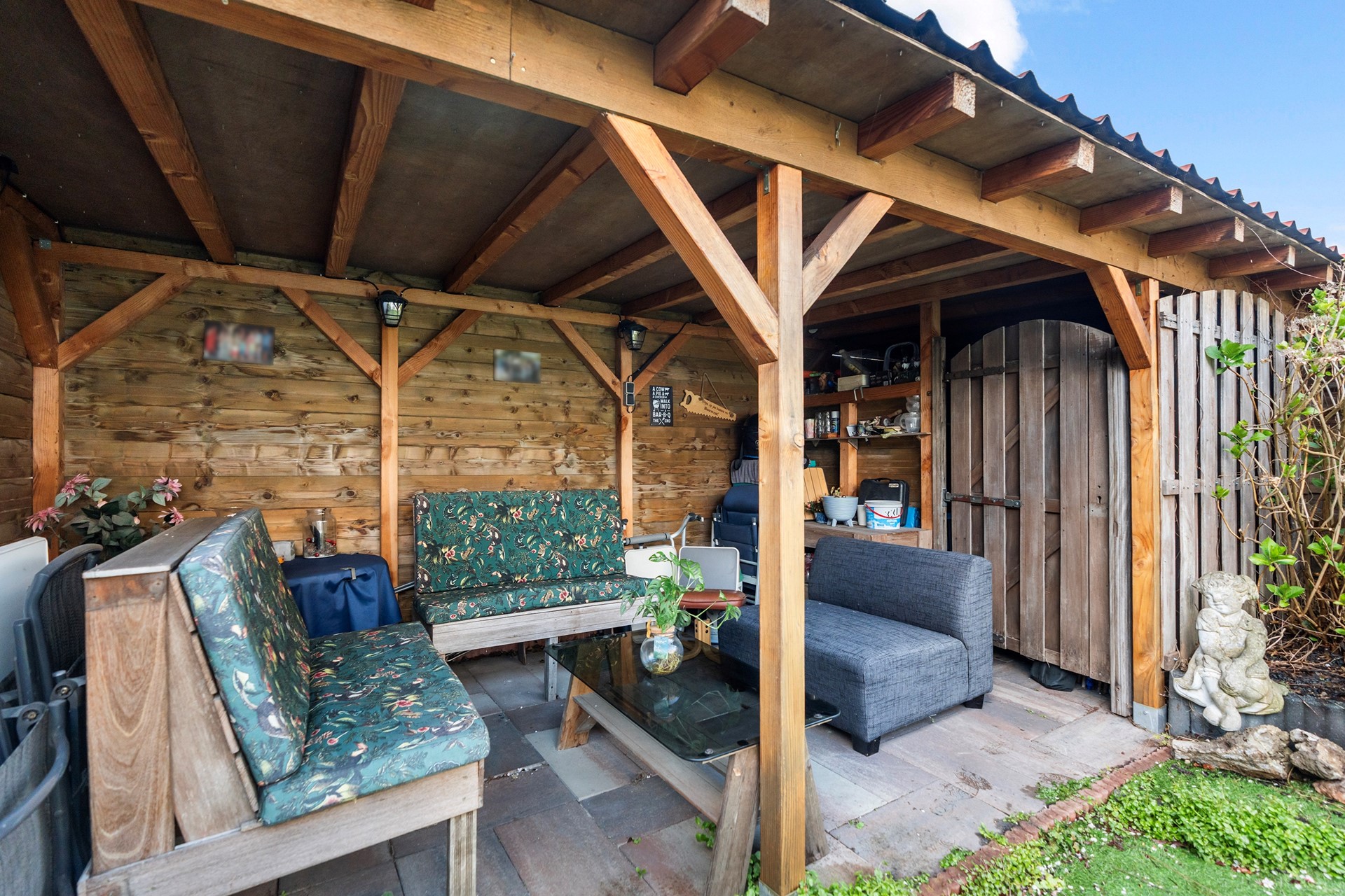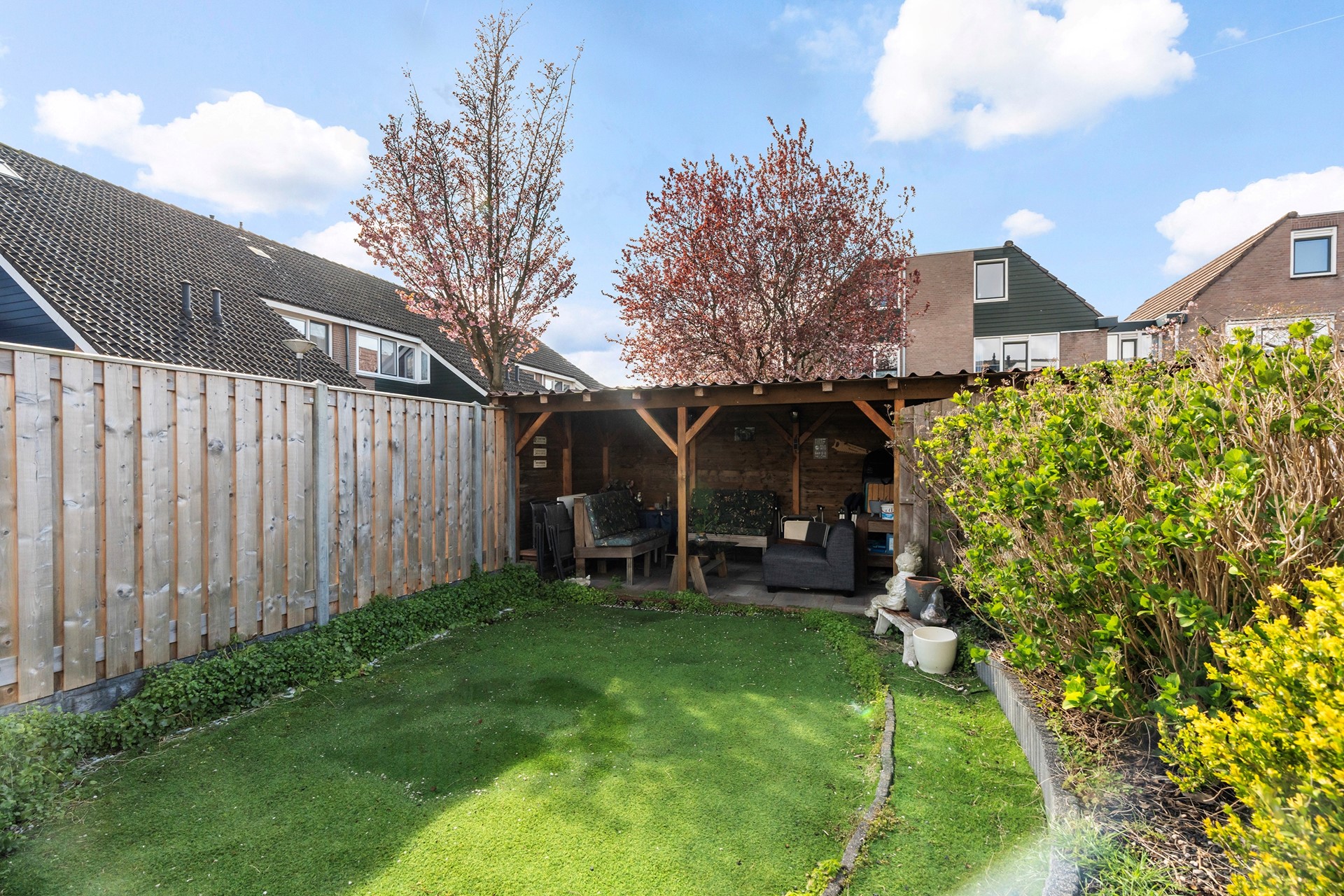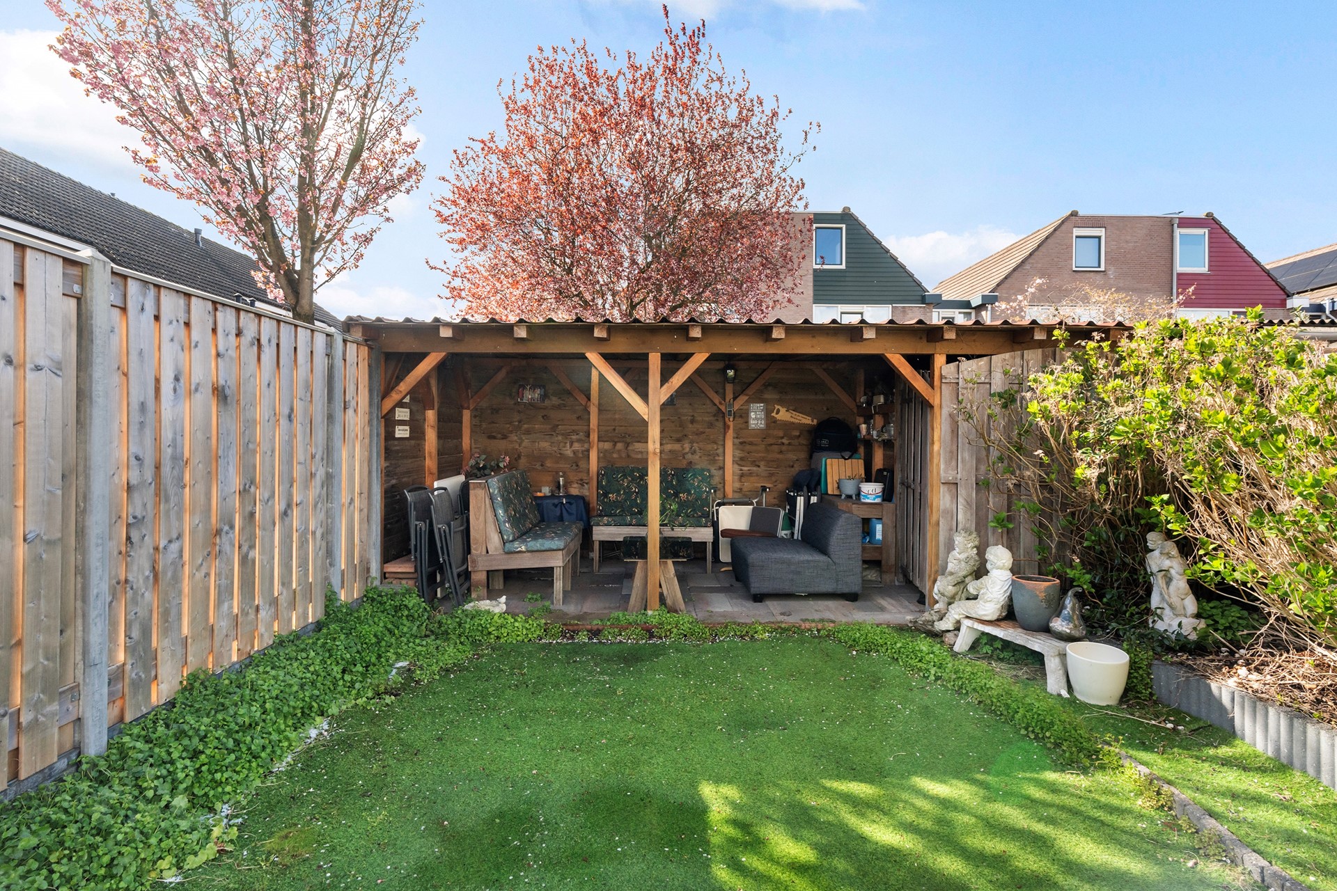 Dit is de plek waar je van het vroege voorjaar tot het late najaar van het buitengevoel geniet. De achtertuin is met zorg aangelegd met vaste beplanting, kunstgras en een sfeervolle overkapping met berging en achterom.